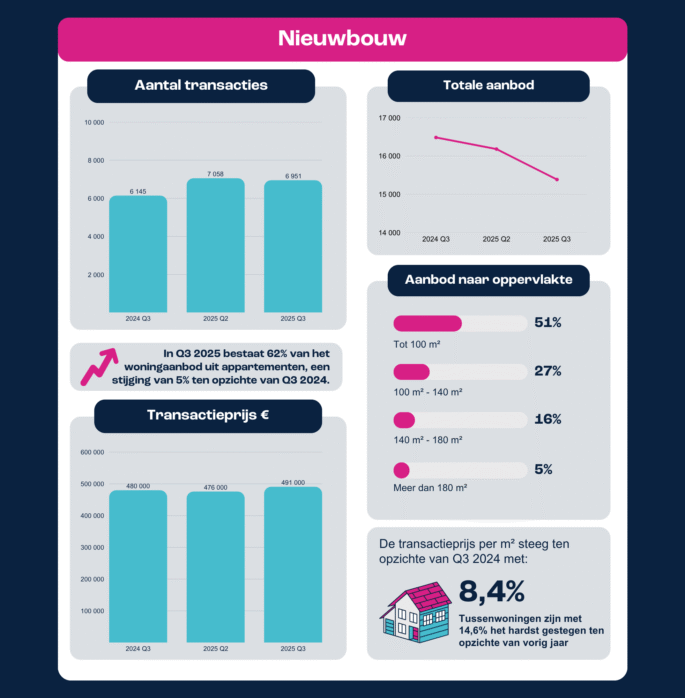 - Verkoopdaling op kwartaalbasis, maar jaar-op-jaar groei: het aantal nieuwbouwverkopen daalde licht met 2% ten opzichte van het tweede kwartaal, maar ligt 13% hoger dan een jaar geleden. Vooral appartementen domineren stevig met 48% van alle transacties.