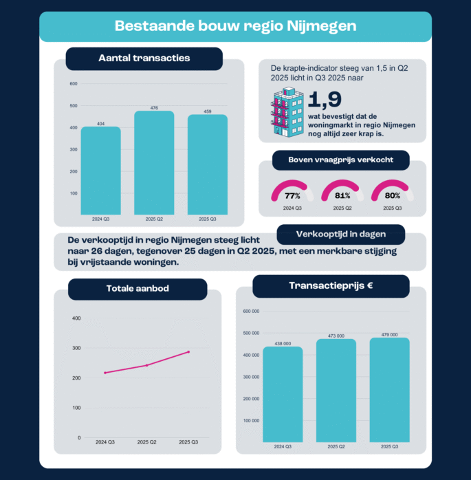 - Kopers blijven concurreren: ondanks het ruimere aanbod werd 80% van de woningen boven de vraagprijs verkocht. Een duidelijk teken dat de markt in Nijmegen uitgesproken krap blijft en de onderliggende koopvraag onverminderd sterk is.