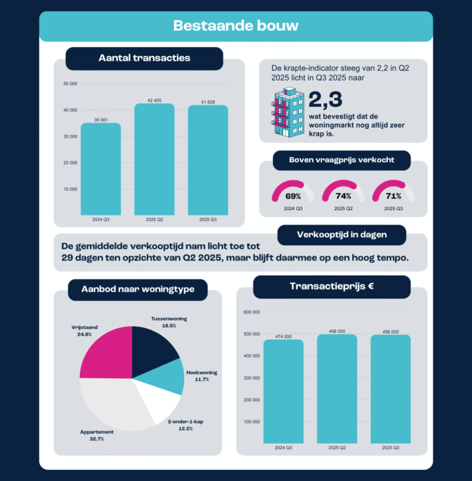 De woningmarkt houdt ook in het derde kwartaal van 2025 opmerkelijk goed stand. De nieuwbouwproductie vertraagt, maar de bestaande bouw houdt het tempo hoog en zorgt voor beweging in de markt. Appartementen domineren steeds nadrukkelijker, dit woningtype is goed voor de helft van alle transacties. Betaalbaarheid blijft een uitdaging: slechts één op de vier woningen wordt nog onder €400.000 aangeboden. Het beperkte aanbod houdt de spanning hoog, waardoor woningen nog steeds snel en vaak boven de vraagprijs worden verkocht.
