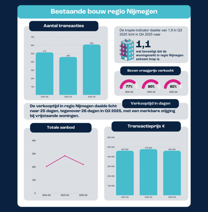 Het vierde kwartaal van 2025 bevestigt dat Nijmegen tot de krapste woningmarkten van Nederland behoort. De vraag neemt sterk toe, terwijl het beschikbare aanbod in hoog tempo wordt leeggekocht. Woningen verkopen snel en veelal boven de vraagprijs, met name in het compacte en stedelijke segment. Zonder versnelling in nieuwbouw en doorstroming blijft de druk op betaalbaarheid en woonkeuze ook in Nijmegen verder toenemen.