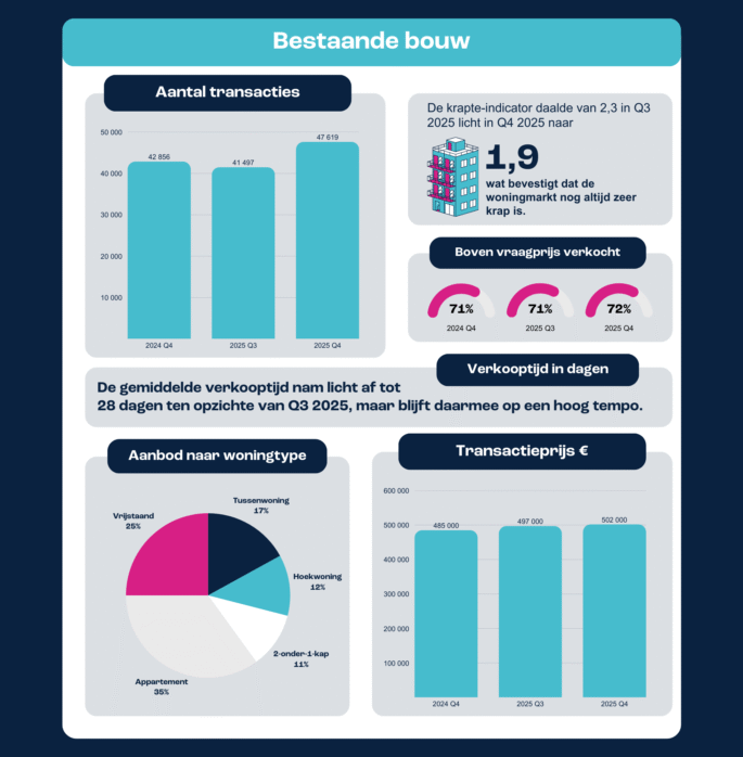 De bestaande bouw trekt stevig aan: transacties nemen toe, verkooptijden blijven kort en overbieden is de norm. De nieuwbouwmarkt laat een ander beeld zien met dalende verkoopvolumes maar doorlopende prijsdruk. De woningmarkt corrigeert niet op prijs, maar op product en tempo. Zonder versnelling en scherpere keuzes in nieuwbouw groeit het structurele tekort verder in 2026.