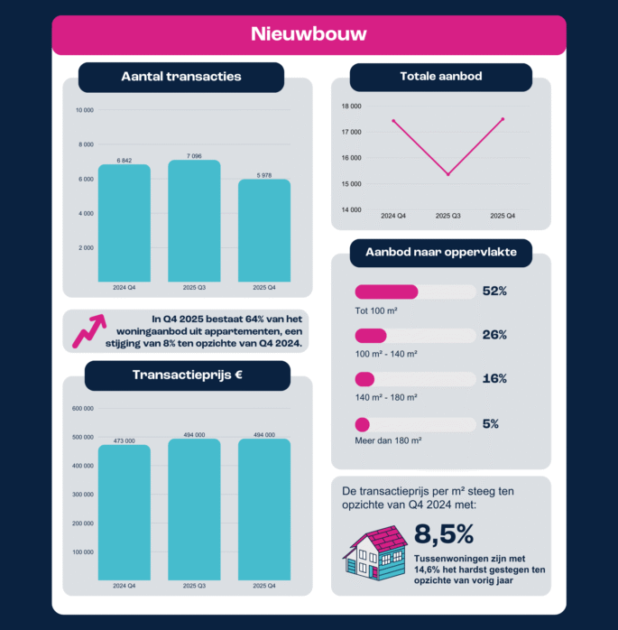 Het aantal nieuwbouwverkopen daalde met 16% ten opzichte van het derde kwartaal en ligt 13% lager dan een jaar geleden. De terugval concentreert zich met name op grondgebonden woningen, wat wijst op toenemende betaalbaarheidsdruk en terughoudendheid bij grotere producten.