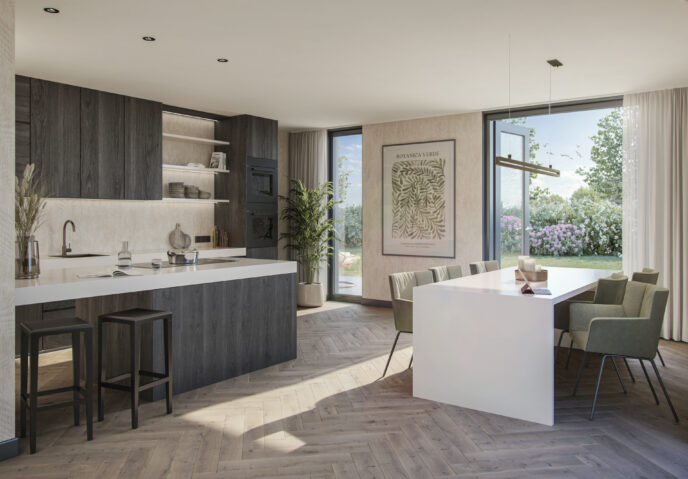 Begane grond: royale leefkeuken met toegang tot je eigen terras, ideaal voor lange zomeravonden of gezellige diners.