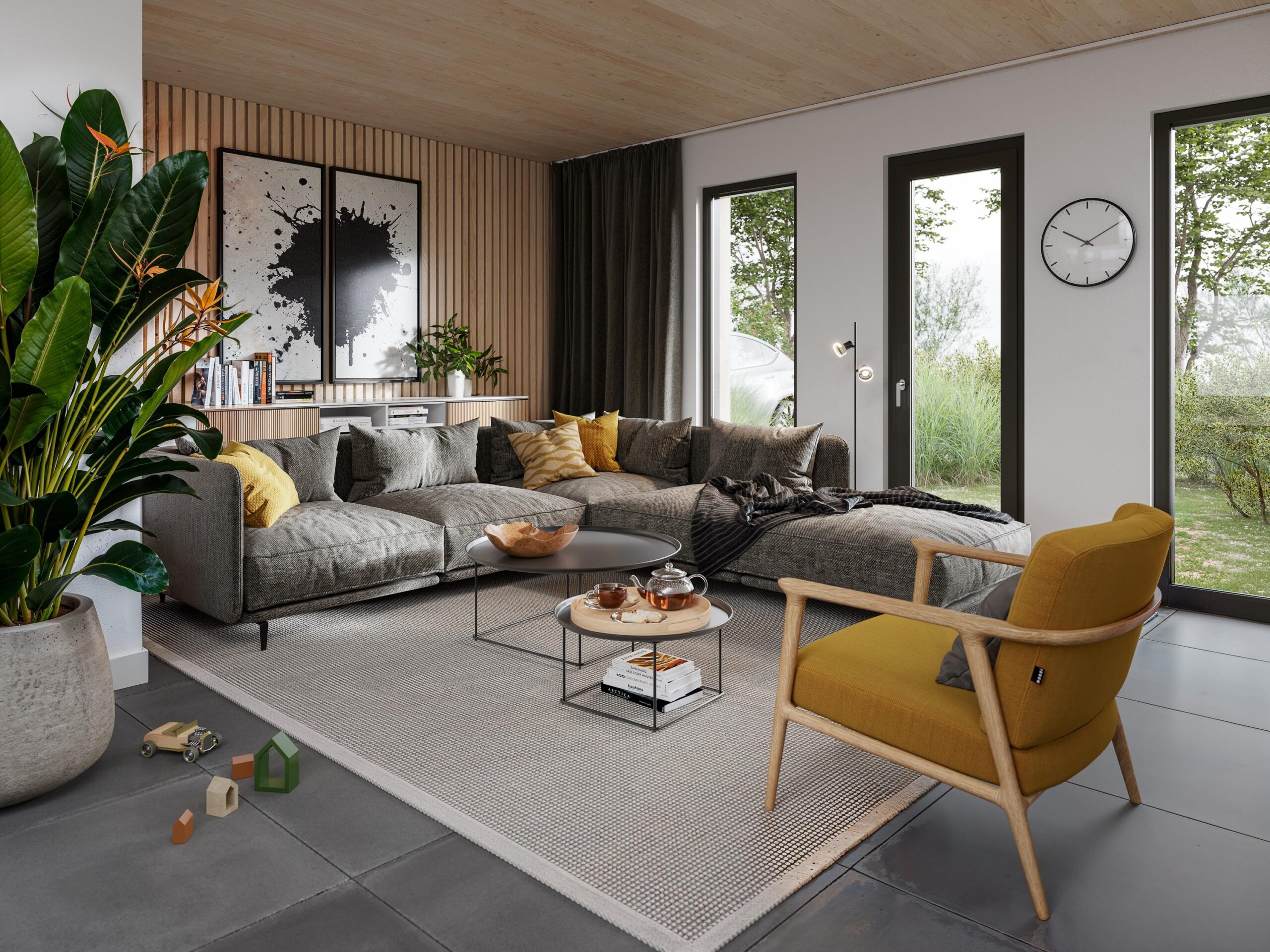 Aan de zijkant van de woning vind je de entree. De hal is lekker ruim met een toilet, toegang tot de berging en is er voldoende plek voor de garderobe. Via de hal stap je de royale en lichte woonkamer binnen met ruimte voor een kookeiland. Zo hoef je geen gesprek meer te missen terwijl je aan het koken bent. En de woonkamer? Die richt je helemaal naar wens in. Het wordt in ieder geval een plek om tot rust te komen. Door de grote raampartijen en schuifpui geniet je ook binnen van je heerlijke terras en de groene omgeving. Hier ga je op warme dagen barbecueën en kunnen de kids lekker spelen.