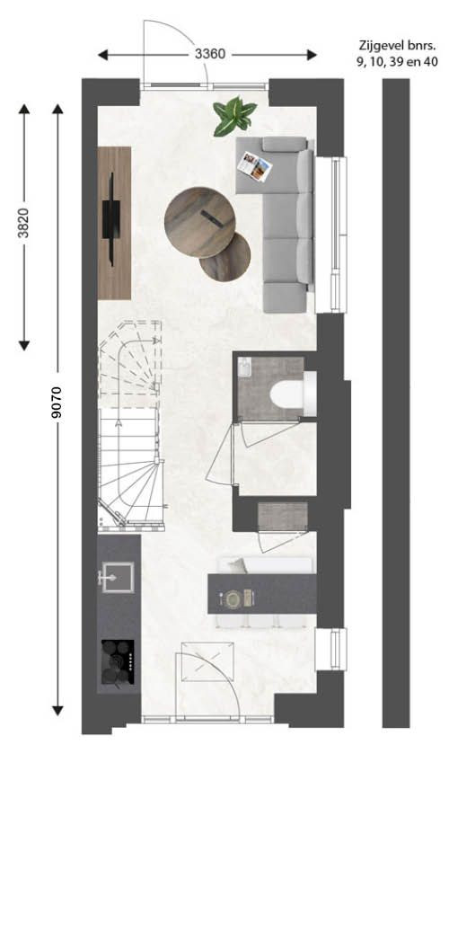 De indeling van deze woning is praktisch en doordacht. Op de begane grond bevindt de keuken zich aan de voorzijde, het woongedeelte aan de achterkant en aan de hal ligt de toiletruimte. Op de eerste verdieping vind je 2 slaapkamers, terwijl de tweede verdieping een derde slaapkamer en een vrij indeelbare ruimte biedt. Met zijn robuuste uitstraling en slimme indeling biedt deze stadswoning hoek een mooie combinatie van stoer design en praktisch comfort.
