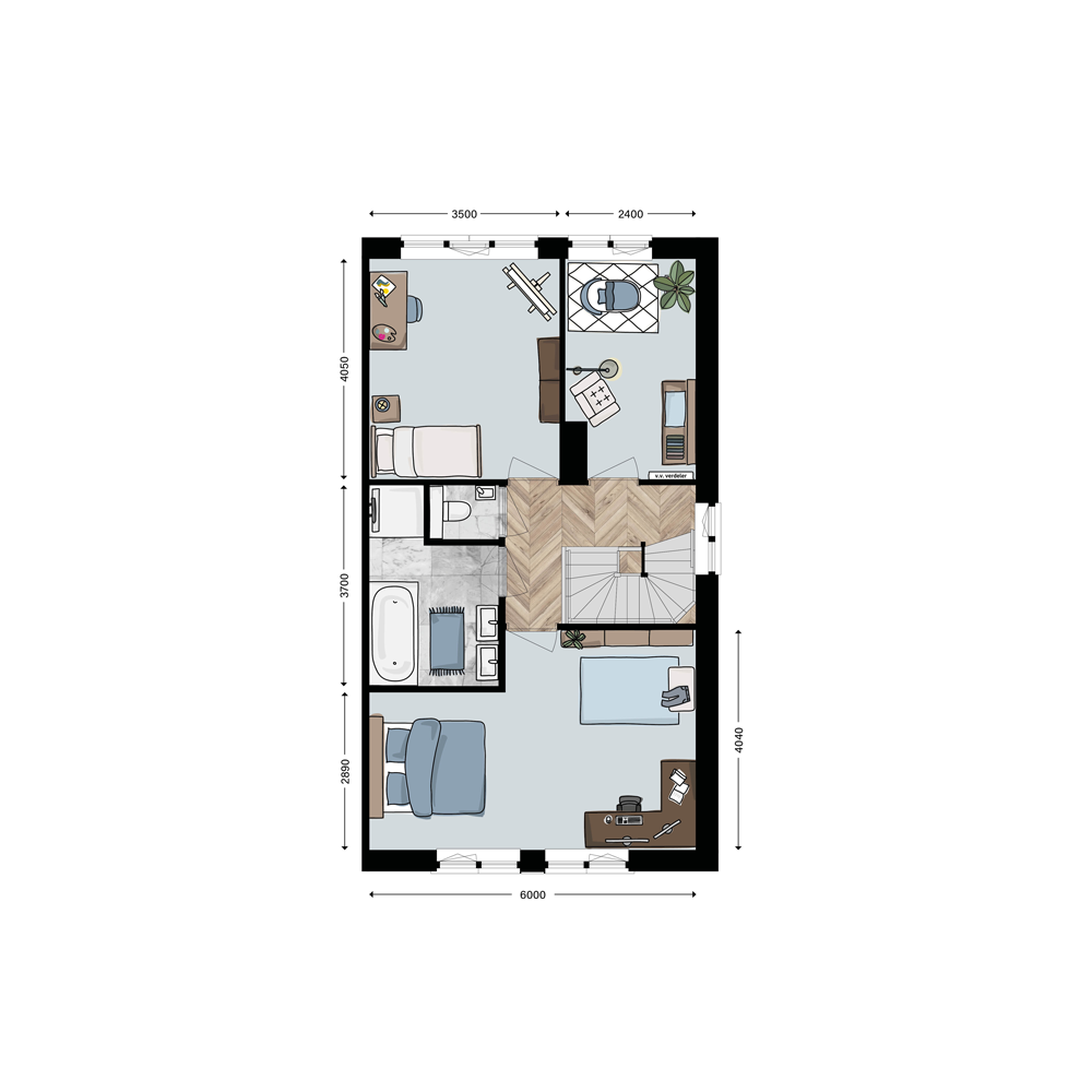 – Zolderindeling: 2 onbenoemde ruimtes en overloop. Het realiseren van een indeling met 2 onbenoemde ruimtes, technische ruimte en overloop op de tweede verdieping.