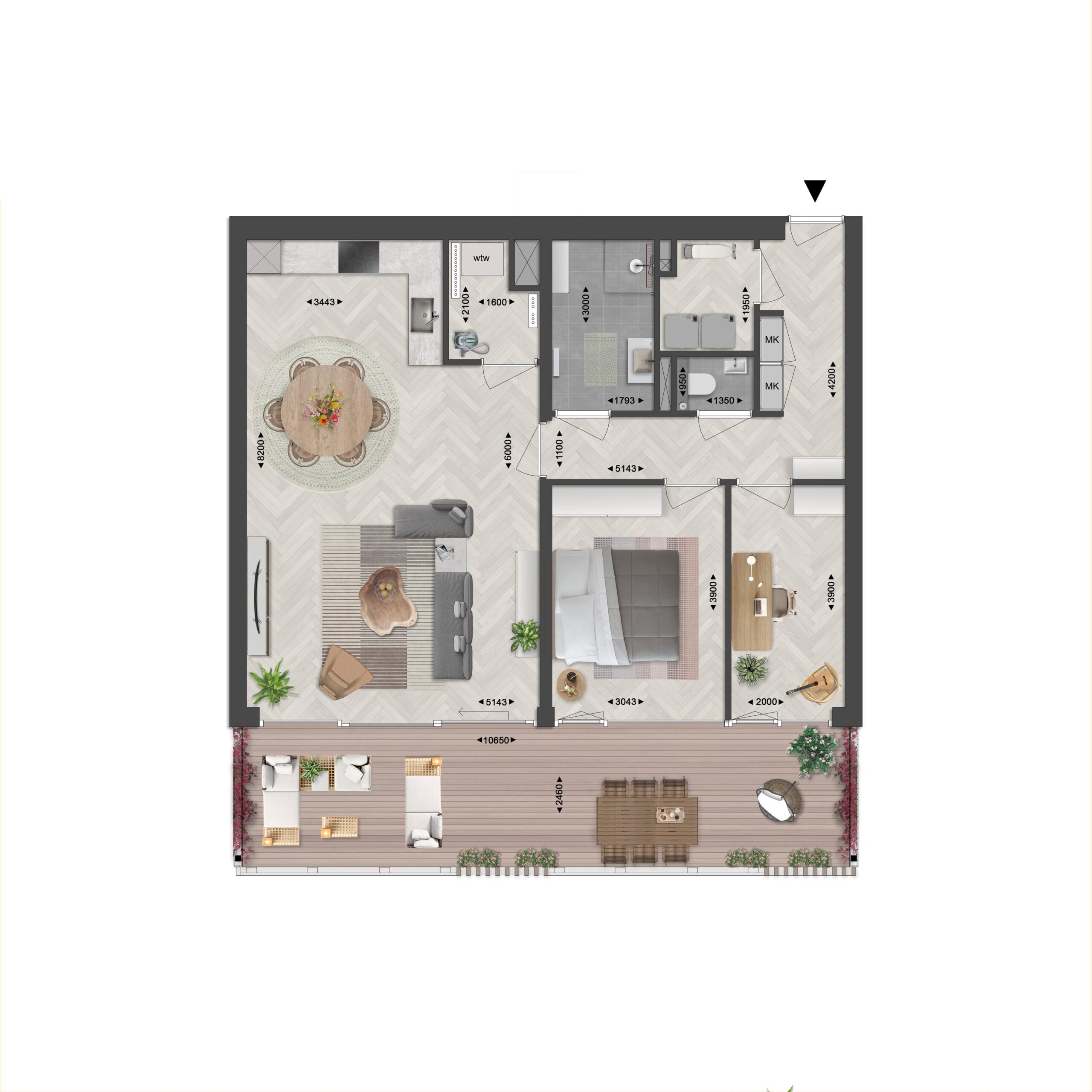 Type Rubia is een compact appartement met twee slaapkamers en een royale woonkamer met open keuken. De appartementen liggen op de begane grond, eerste en tweede verdieping. Vanaf de balkons, variërend tussen de 14 en 27 m², kijk je uit over het groene parklandschap.