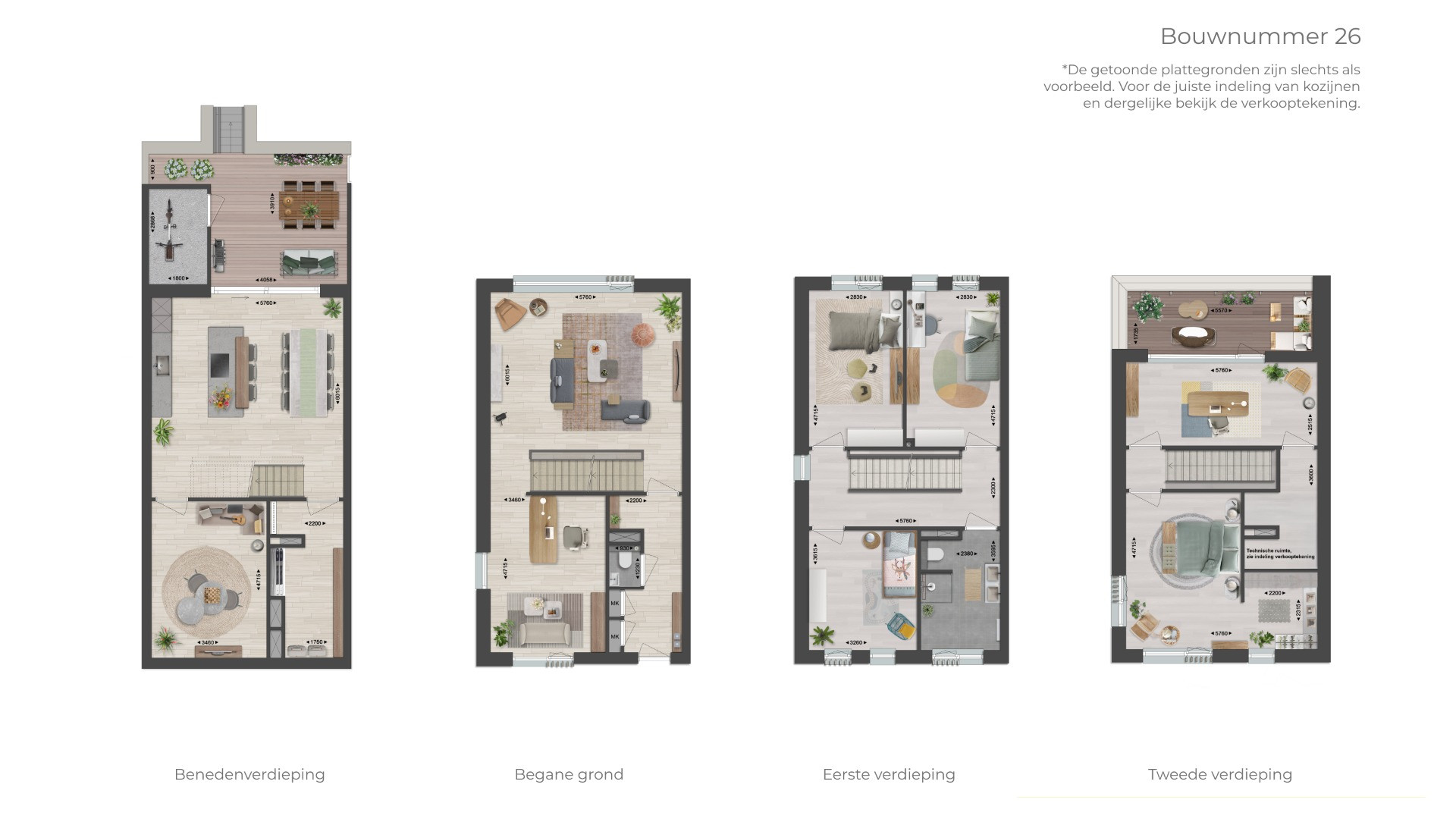 De getoonde plattegronden zijn slechts als voorbeeld. Bekijk de verkooptekeningen voor de juiste indeling van kozijnen e.d.