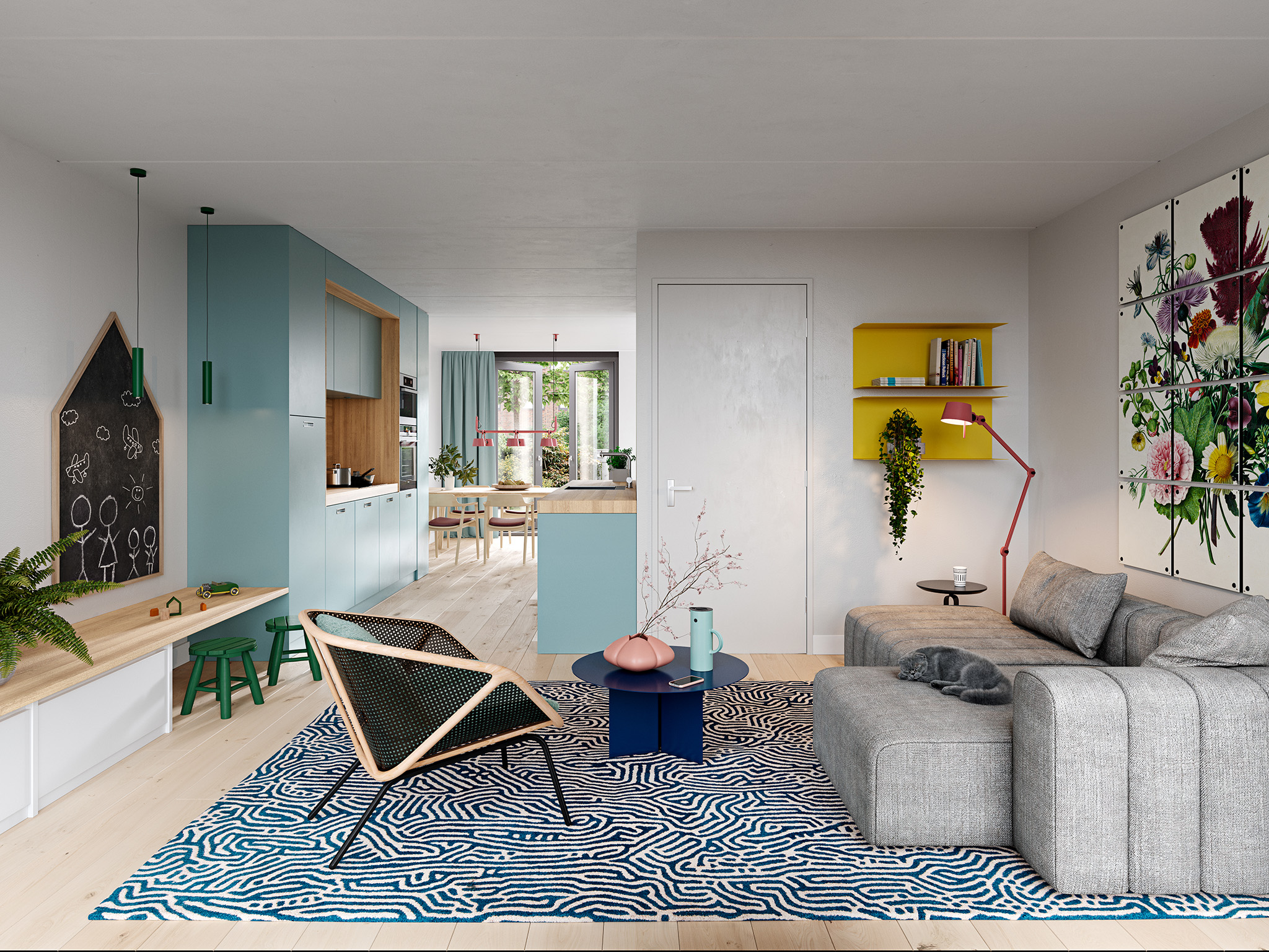 De open keuken in het midden van de woning vormt het hart van je nieuwe thuis. Hier kook je niet alleen, maar beleef je ook momenten van gezelligheid. Of je nu snel een maaltijd maakt of een uitgebreid diner, de keuken heeft alles wat je nodig hebt. Voorin de woning is ruimte voor een grote eettafel, waar je met vrienden of familie dineert. Vanuit de zithoek achterin heb je uitzicht op het terras, ideaal om even in de buitenlucht te zitten. Beneden vind je ook een separaat toilet en de trap naar boven, allemaal slim ingedeeld om optimaal van de ruimte te genieten.