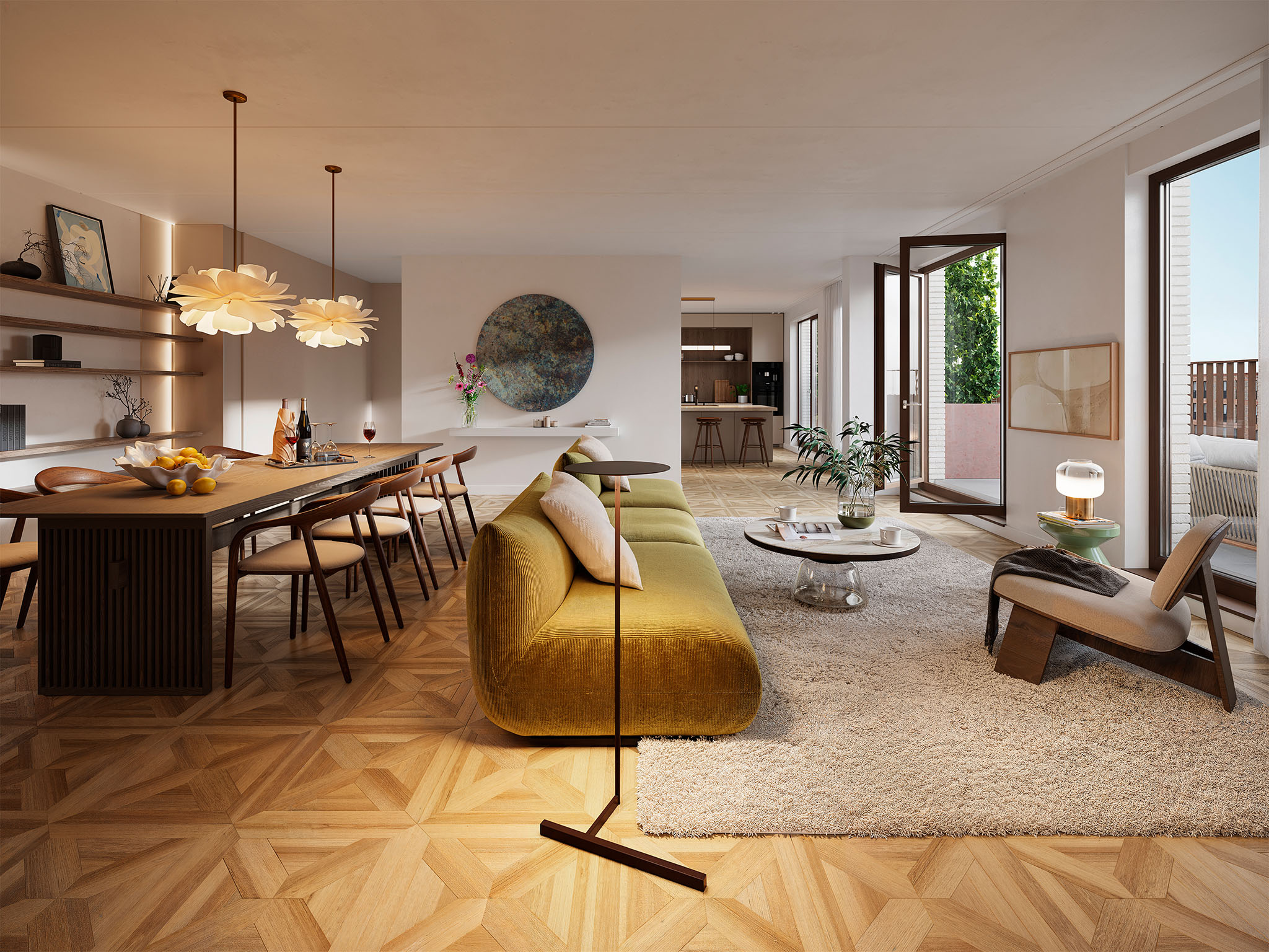 Aan de rechterkant van de woning bevindt zich de grote woon-/keukenruimte. De open keuken met kookeiland richt je helemaal naar eigen smaak in. Zet er een lange eettafel neer om ’s ochtends gezellig te ontbijten of ‘s avonds uitgebreid te dineren met vrienden. Creëer aan de andere kant van de ruimte een fijne zithoek om lekker te ontspannen met een boek of een serie. Via de openslaande deuren in de woonkamer loop je zo je riante balkon op, gelegen op het zuidoosten. Dat betekent zon vanaf de ochtend tot de late middag. Begin er je dag met een kop koffie of geniet van de avondzon in de privacy van je eigen buitenruimte. Wat een luxe.