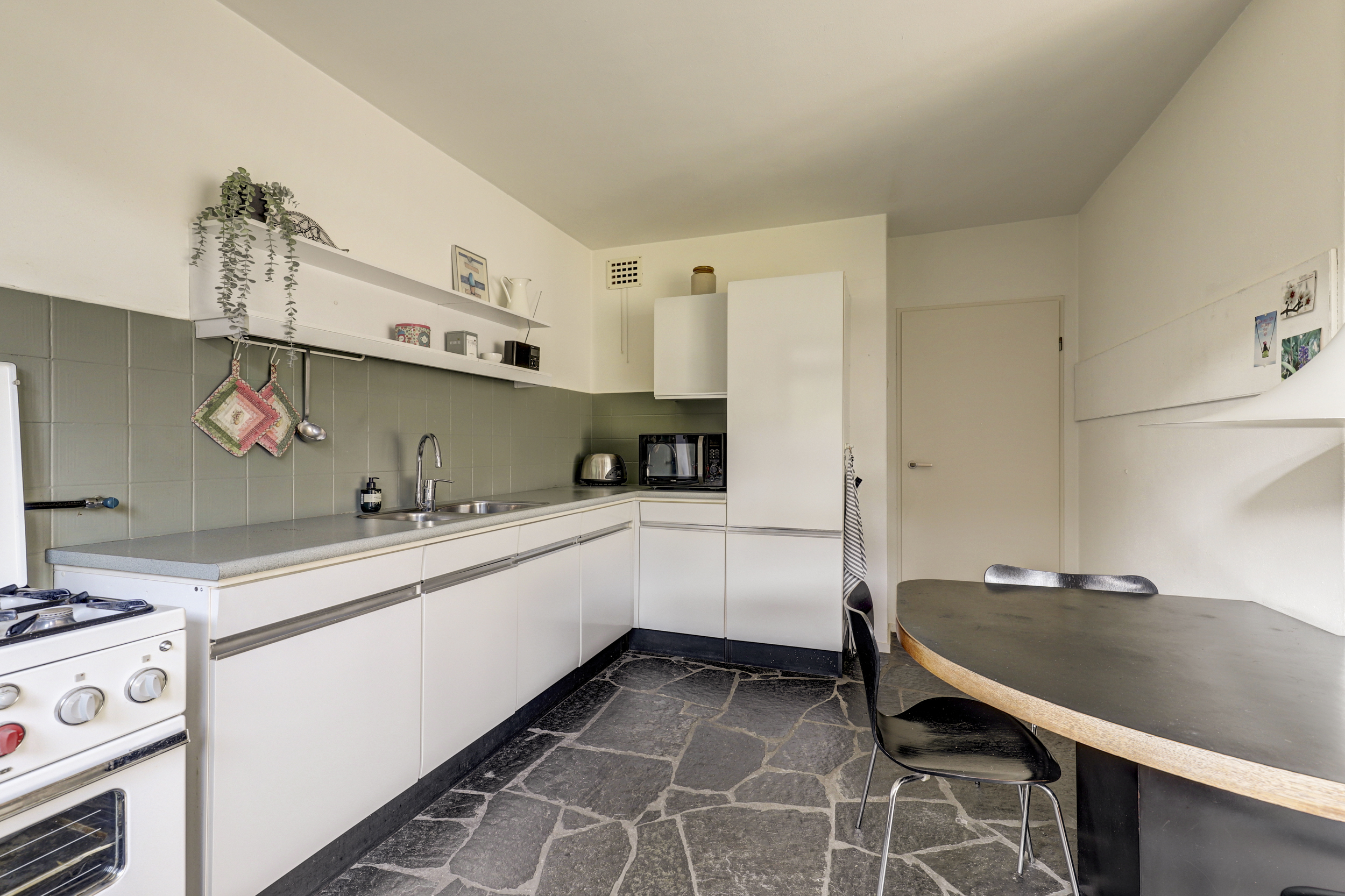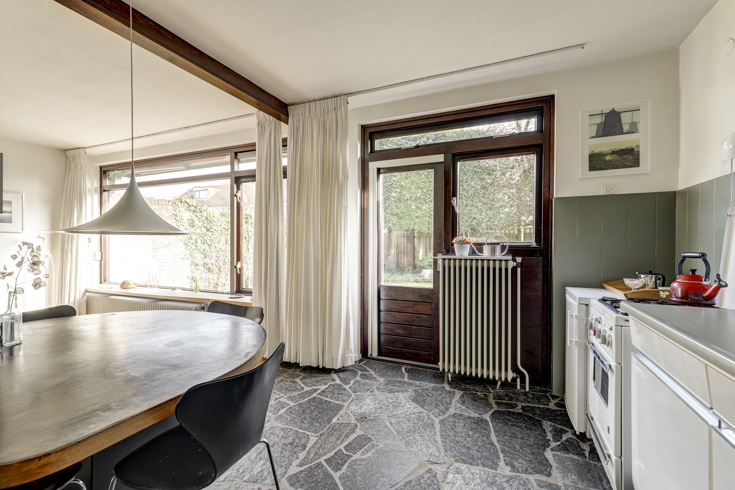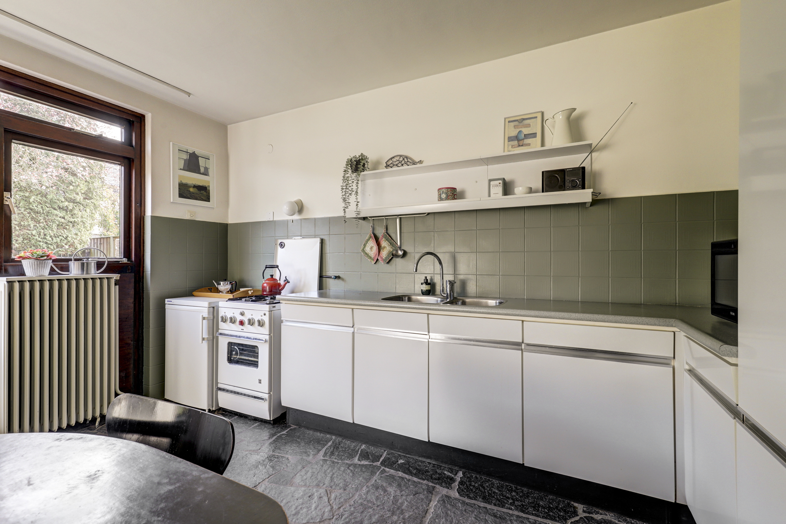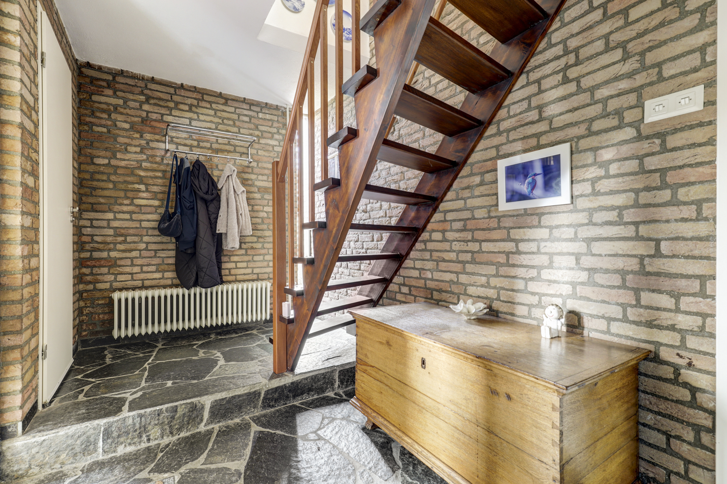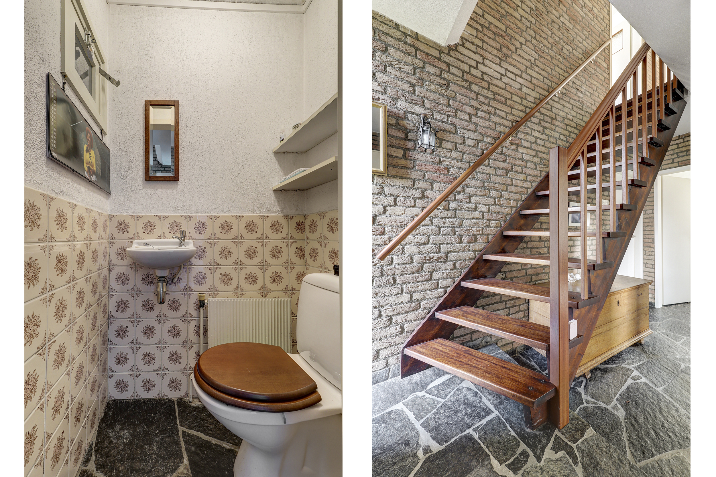 Overdekte entree, ruime hal met leisteenvloer, vaste garderobe-/bergkast, meterkast, toiletruimte met toilet en fontein en trap naar de eerste verdieping. Vanuit de hal bereik je zowel de woonkamer als de keuken. De sfeervolle woon-/eetkamer biedt volop ruimte voor een comfortabele zithoek én een grote eettafel en is voorzien van parketvloer en openhaard. Er is veel natuurlijk lichtinval door de grote raampartijen. De halfopen keuken in L-opstelling is voorzien van voldoende kastruimte, dubbele spoelbak en diverse apparatuur o.a. koelkast en 4 pits gasfornuis met oven. Vanuit de keuken is er toegang tot de zonnige achtertuin. Door de grootte van deze ruimte biedt het veel mogelijkheden om de keuken geheel naar eigen wens en stijl in te richten.