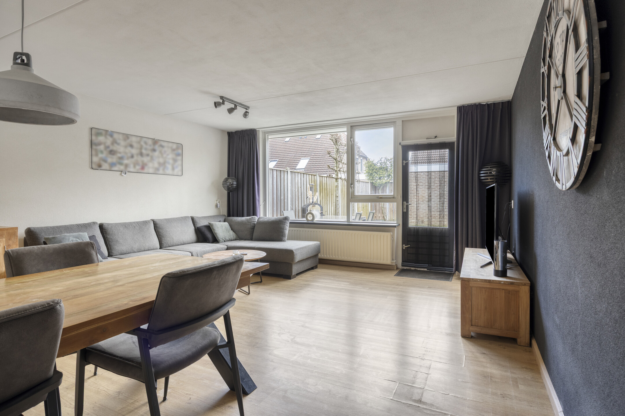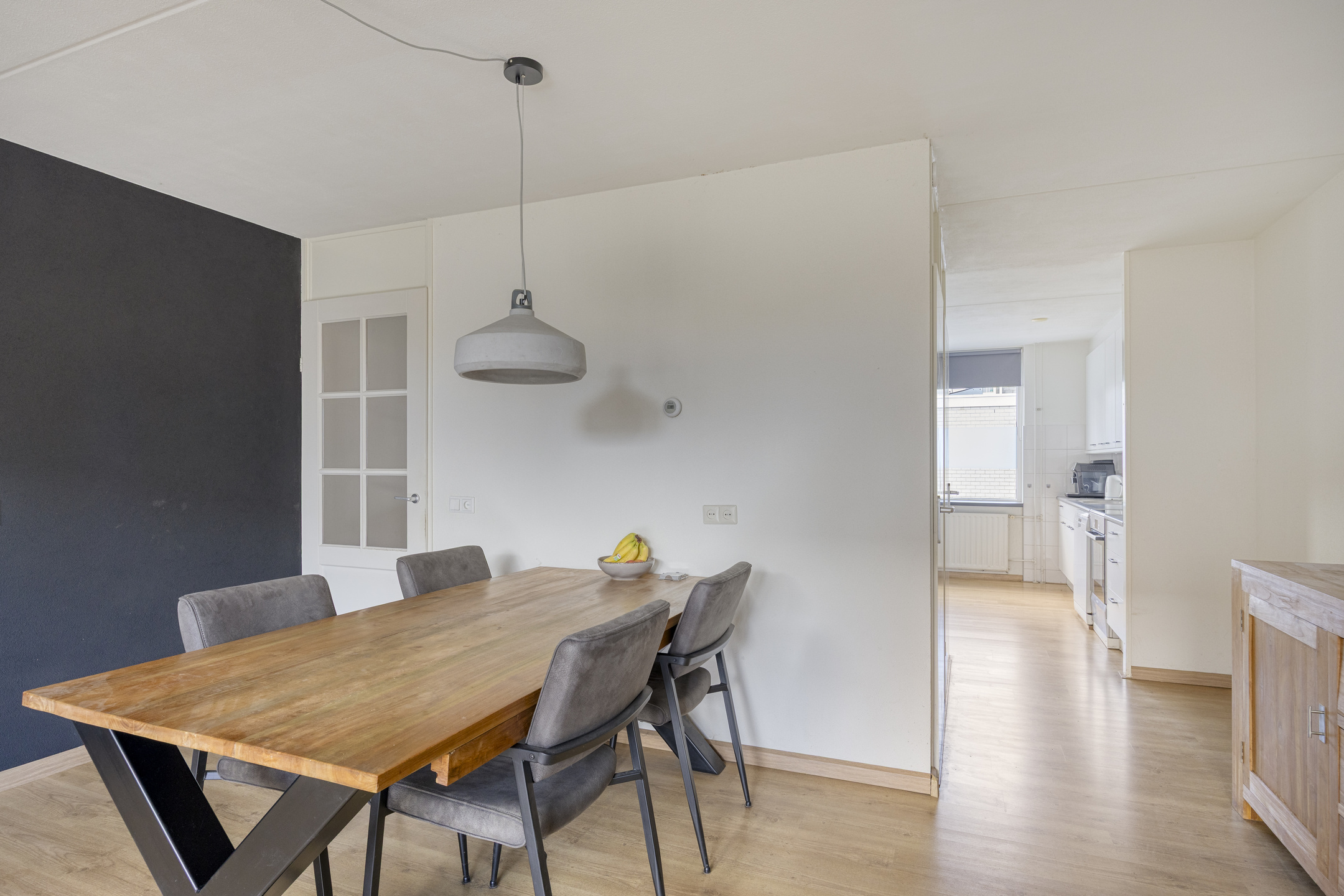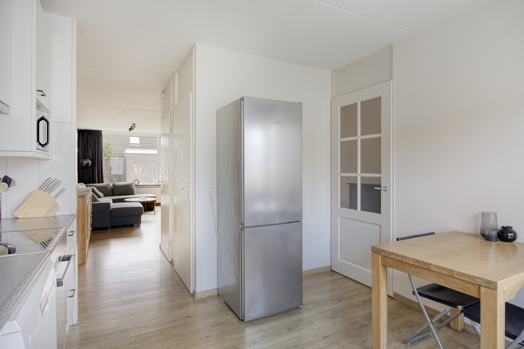 Entree met meterkast (klikgroepen en glasvezelaansluiting), trapopgang (netjes bekleed) en toiletruimte met fontein en in een lichte kleur betegeld. Lichte woonkamer met laminaatvloer, spachtelputz wandafwerking, spuitwerk plafond, deur naar de achtertuin en praktische trapkast. De halfopen eet-/woonkeuken heeft ruimte om een kleine eettafel te plaatsen en is voorzien van mooie raampartijen (veel lichtinval), dubbele spoelbak, afgewerkt in een lichte kleur en diverse apparatuur, o.a. koel-vriescombinatie, 4-pits inductiekookplaat met oven, afzuigkap, magnetron en vaatwasser.