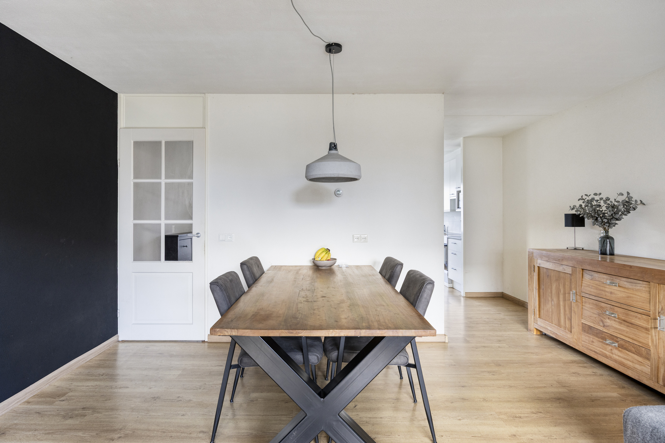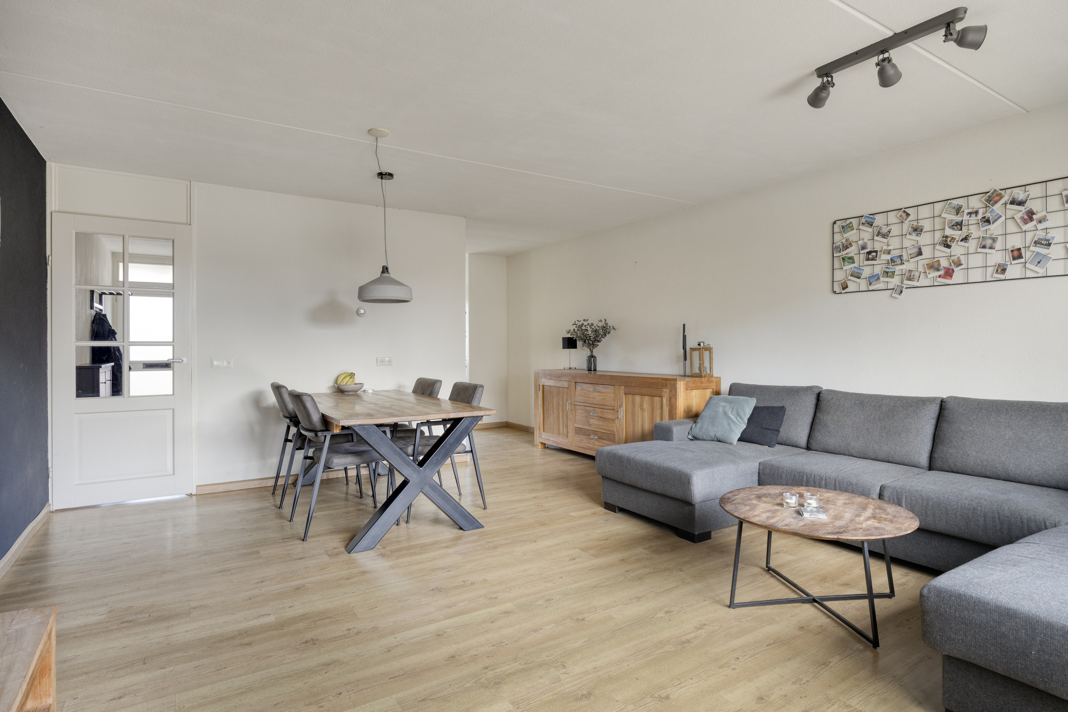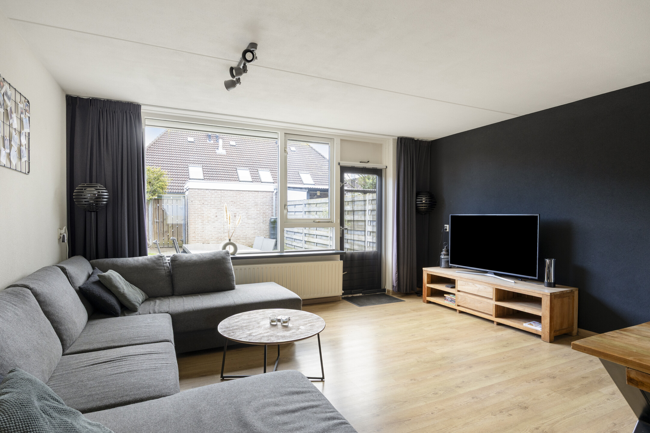 Entree met meterkast (klikgroepen en glasvezelaansluiting), trapopgang (netjes bekleed) en toiletruimte met fontein en in een lichte kleur betegeld. Lichte woonkamer met laminaatvloer, spachtelputz wandafwerking, spuitwerk plafond, deur naar de achtertuin en praktische trapkast. De halfopen eet-/woonkeuken heeft ruimte om een kleine eettafel te plaatsen en is voorzien van mooie raampartijen (veel lichtinval), dubbele spoelbak, afgewerkt in een lichte kleur en diverse apparatuur, o.a. koel-vriescombinatie, 4-pits inductiekookplaat met oven, afzuigkap, magnetron en vaatwasser.