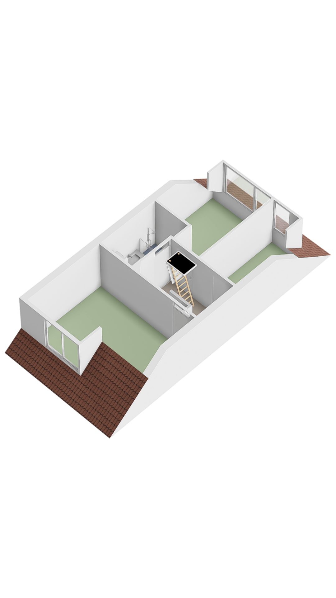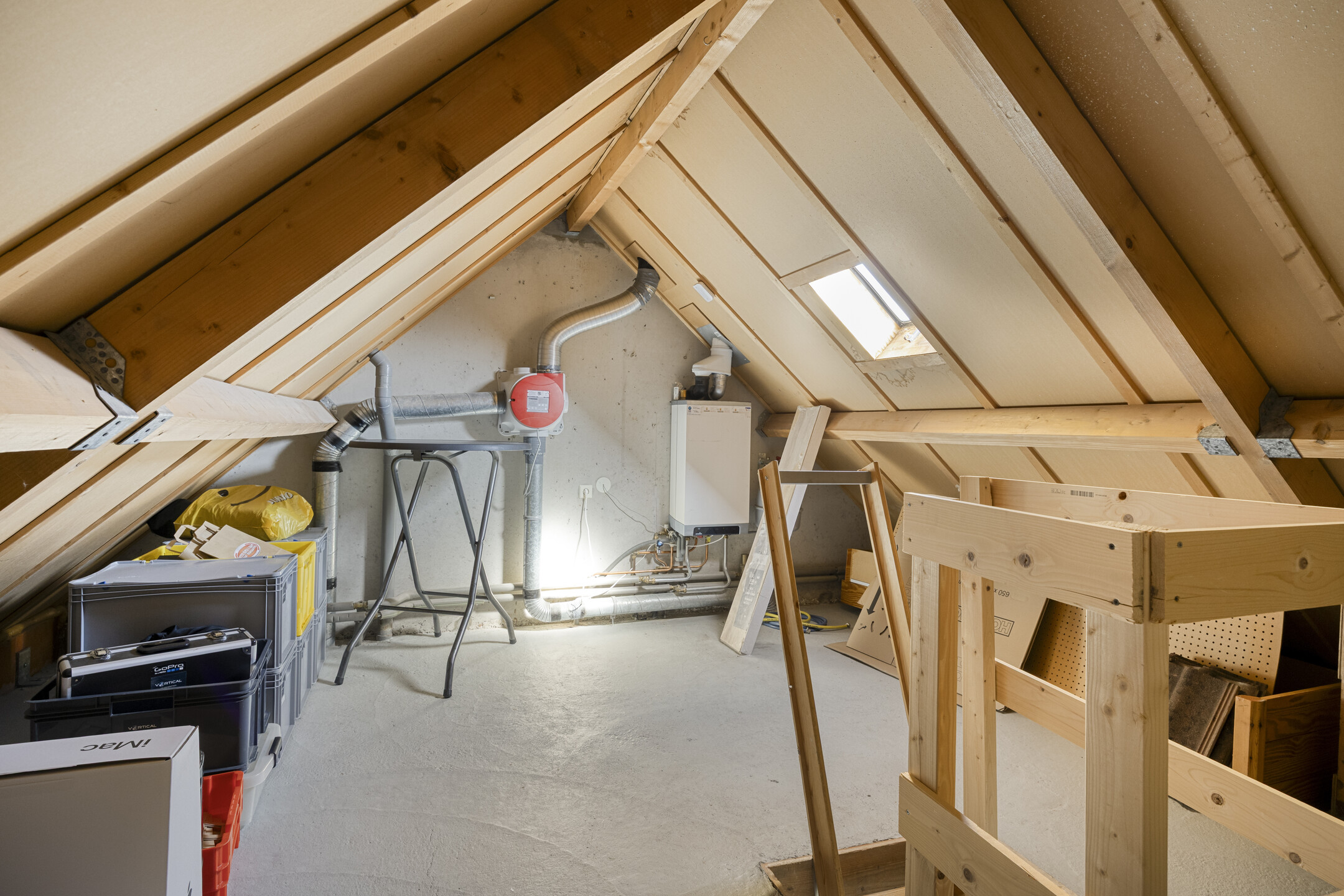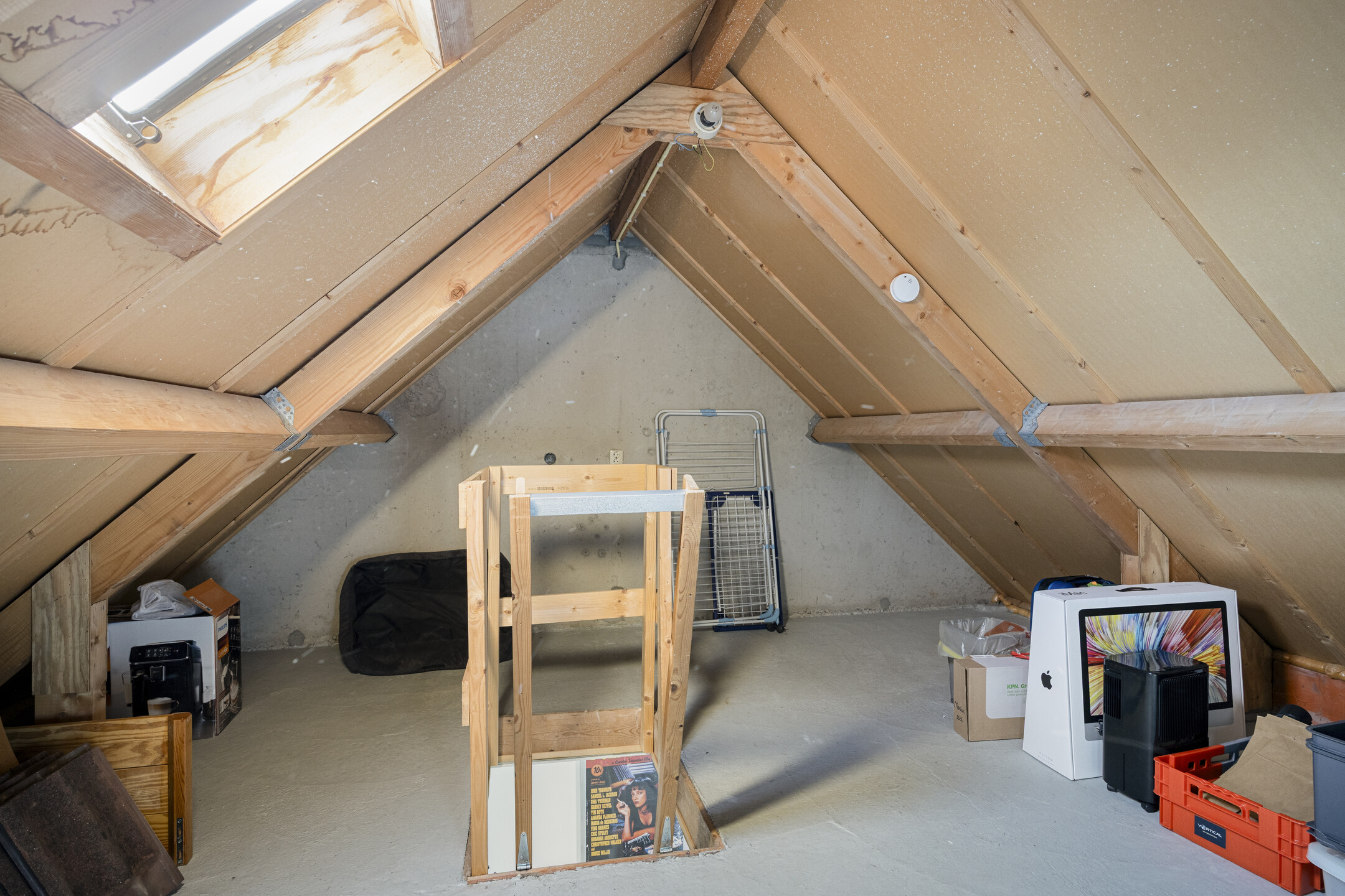Open bergzolder van ca. 11 m2, bereikbaar via vlizotrap, met C.V.-opstelplaats (Intergas, 2007), mechanische ventilatie box en dakraam. De nokhoogte is ca. 2,30 m.