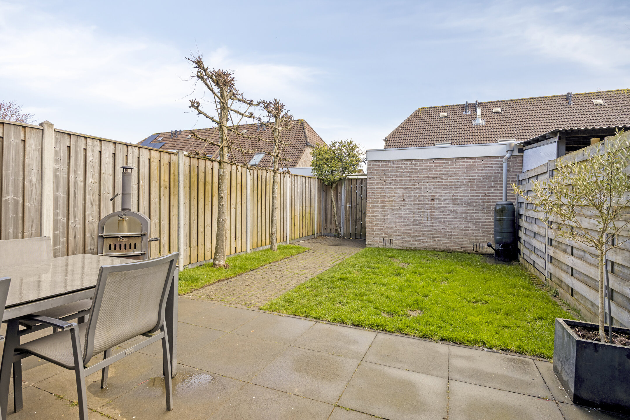 Verzorgde achtertuin op het oosten met mooi terras net grote tegels en een elektrisch zonnescherm (ca. 2024 geplaatst), nette schuttingen, achterom via poort en een stenen berging (ca. 6 m2), welke is voorzien van elektra.