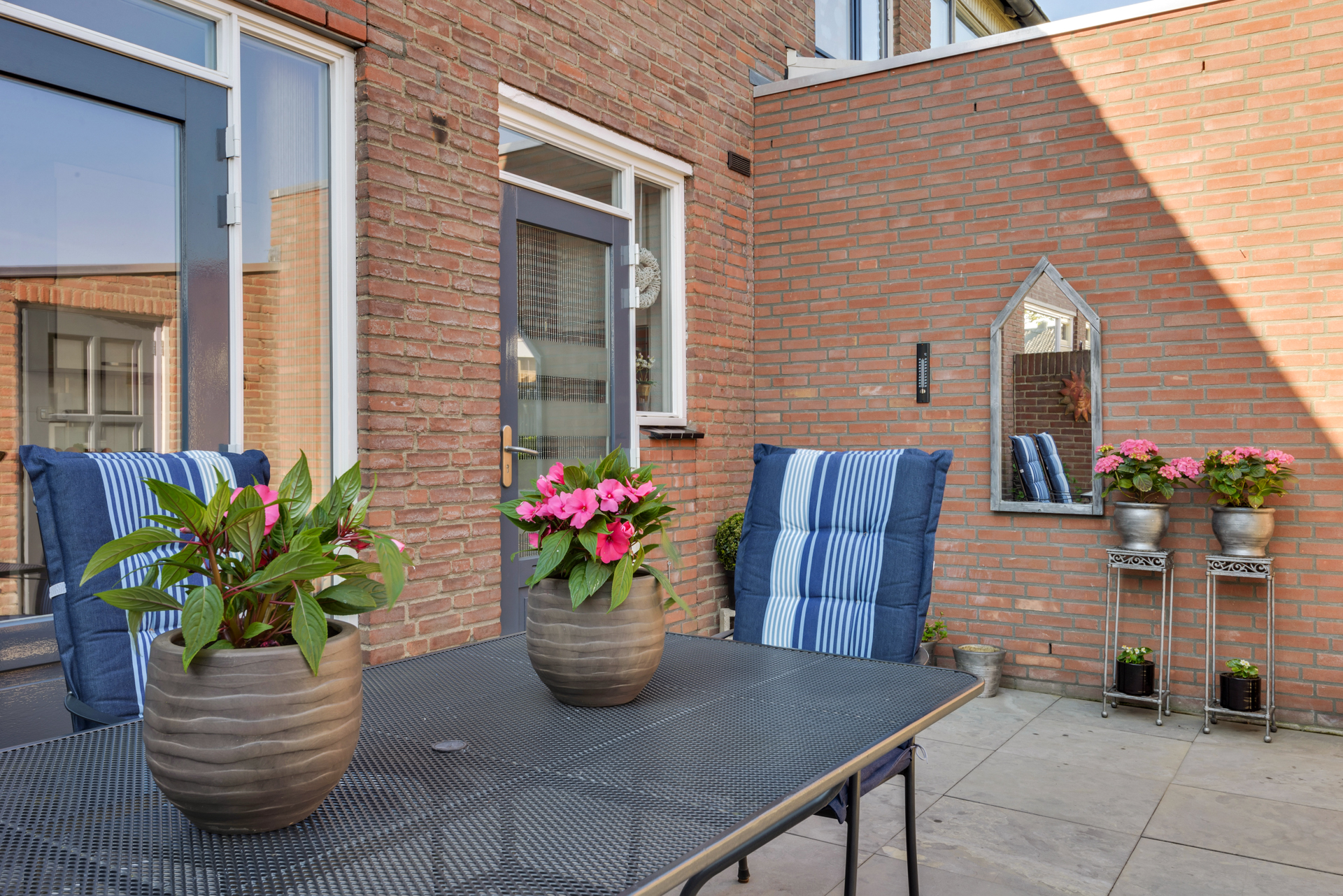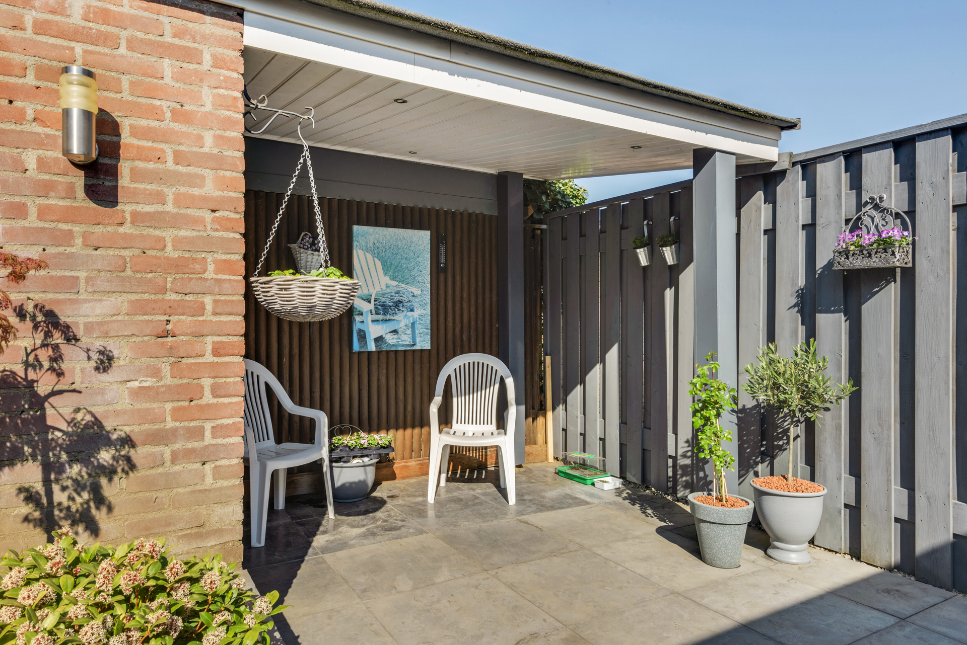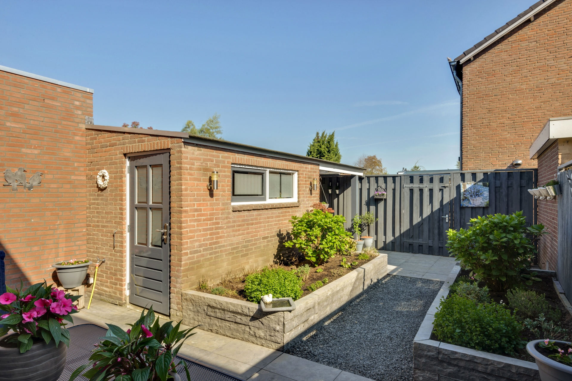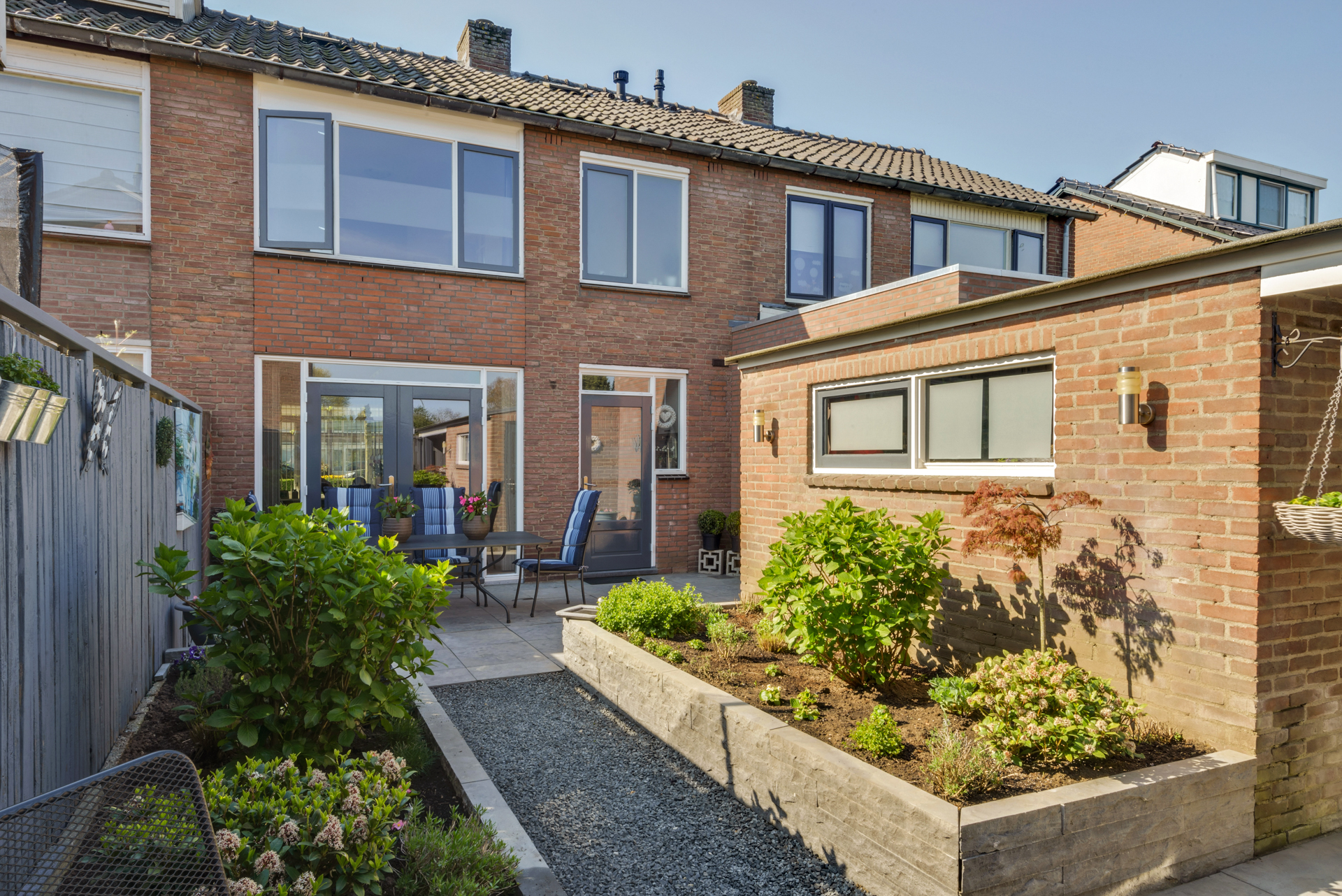 Fraai aangelegde achtertuin met terras, stenen berging, overkapping met inbouwspots en achterom. Ligging op het noorden. Aan de voorzijde vrij uitzicht over het plantsoen met nabij gelegen speeltuintje.