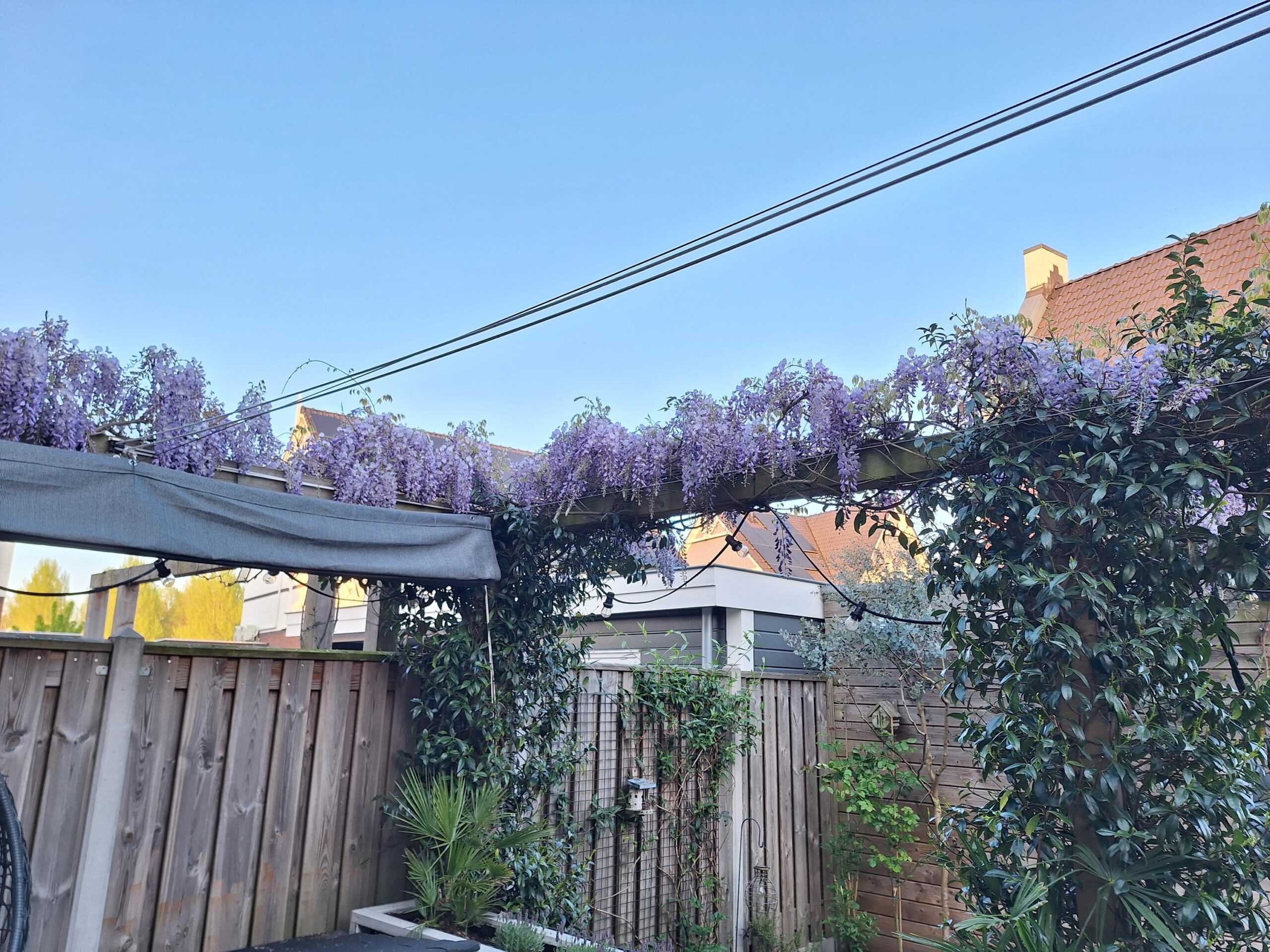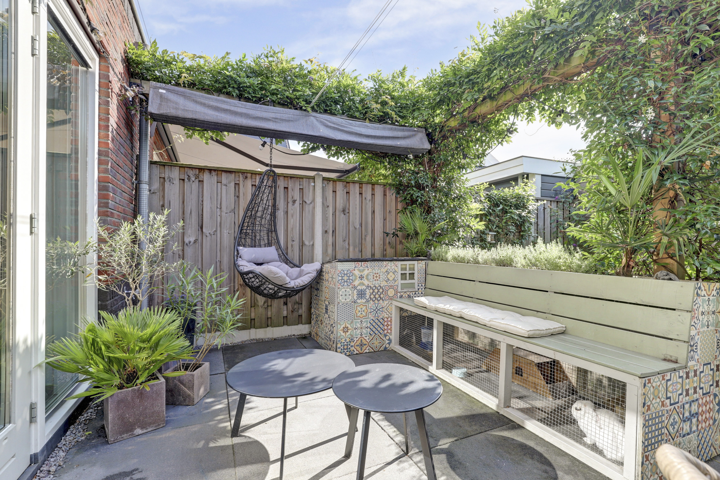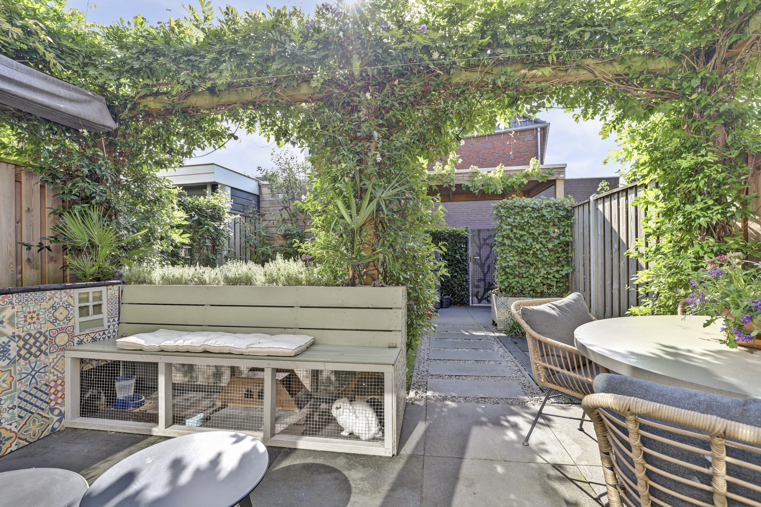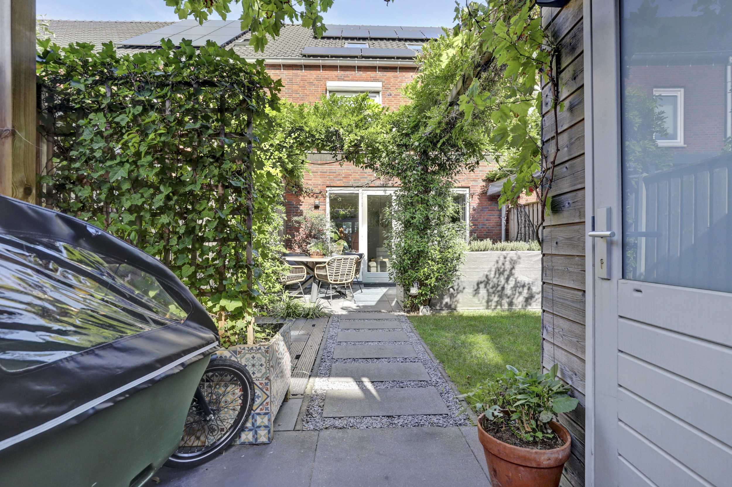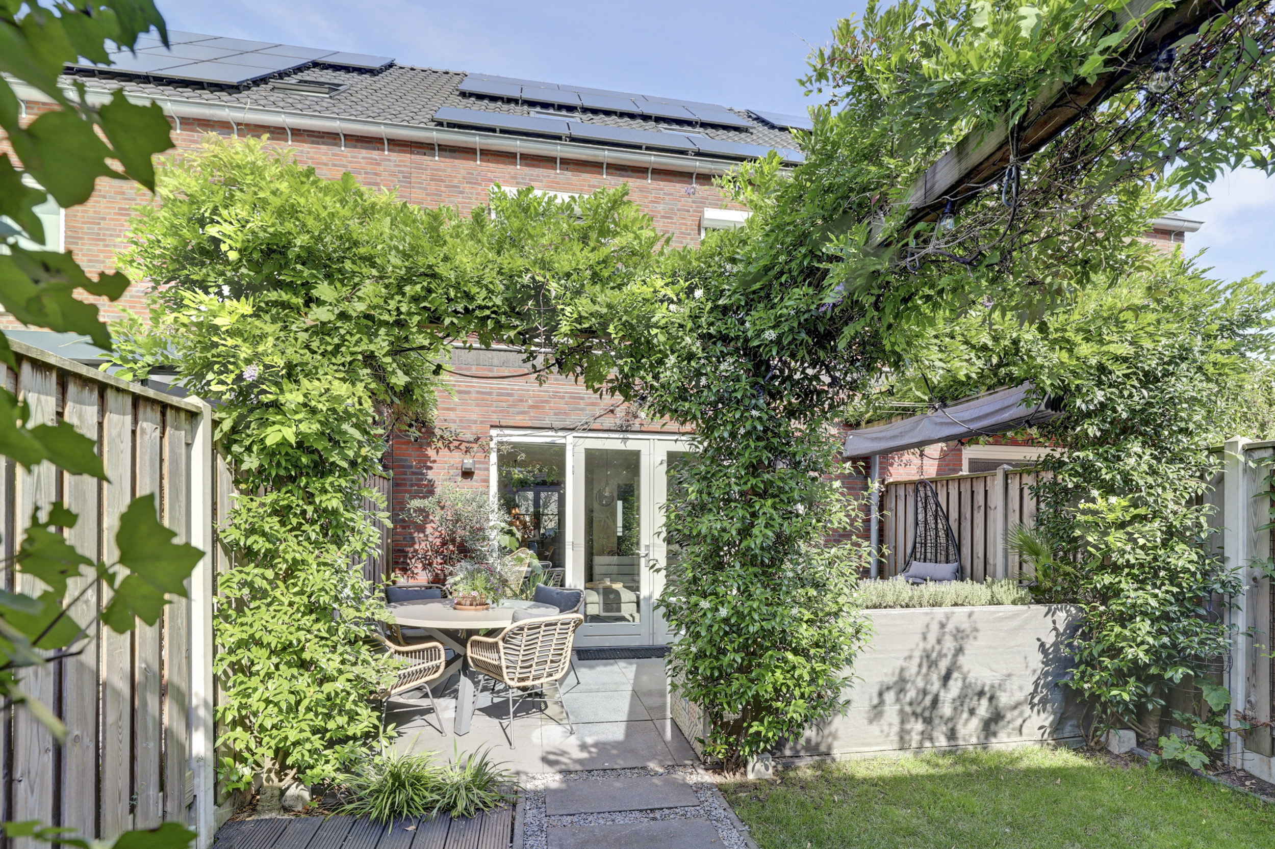 De zonnige achtertuin ligt op het zuidoosten, waardoor er van de vroege ochtend tot in de middag volop zon is. Wie liever de schaduw opzoekt, kan gebruikmaken van het aanwezige zonnescherm. De tuin is groen en modern ingericht en wordt sfeervol verfraaid door een prachtige blauwe regen die in bloei voor een charmant en kleurrijk accent zorgt. Achterin de tuin bevindt zich een houten berging, ideaal voor fietsen en tuingereedschap, met daaraan vast een praktische overkapping die extra beschutting biedt. Daarnaast beschikt de tuin over een achterom, wat het geheel extra toegankelijk maakt.