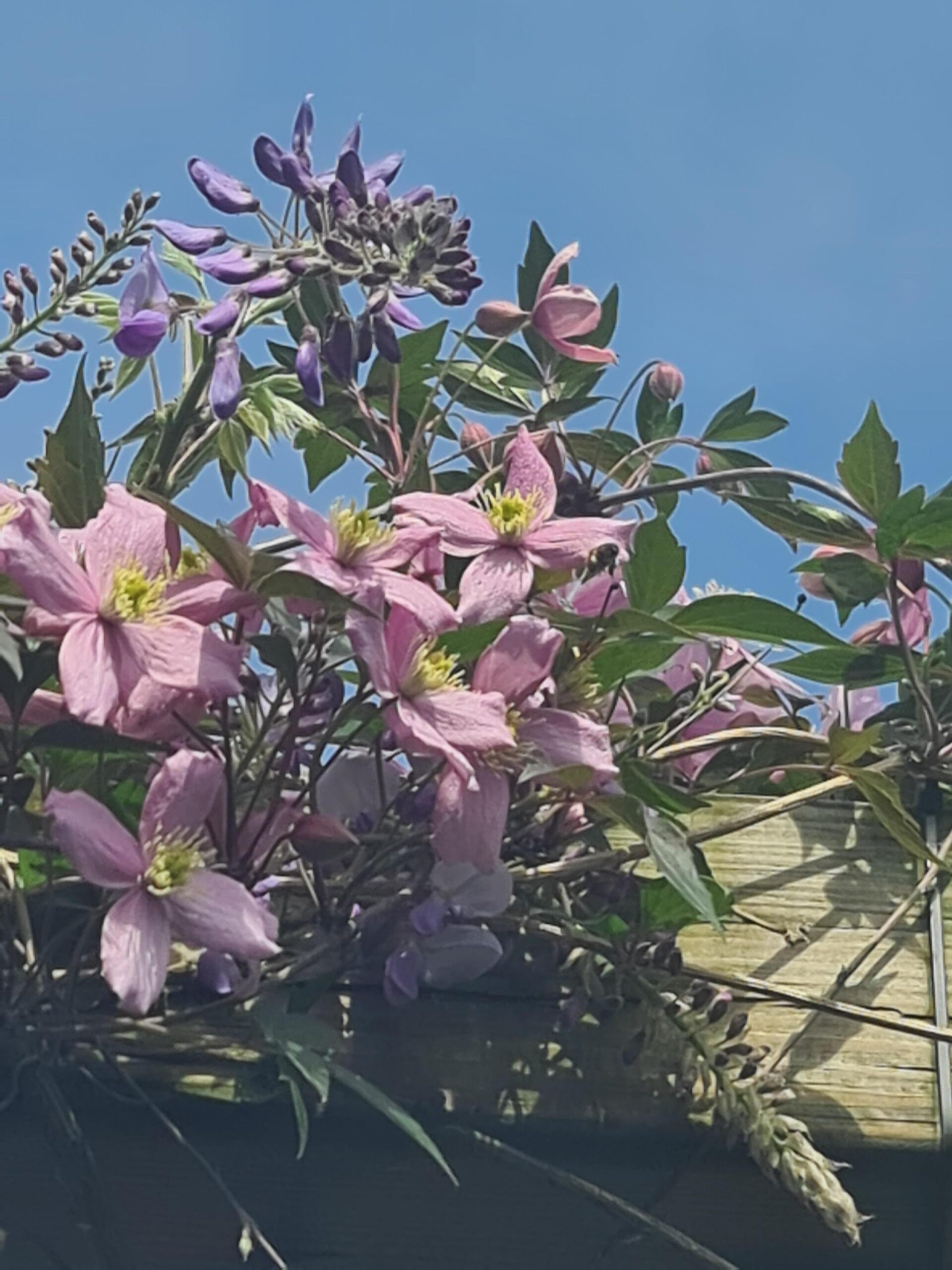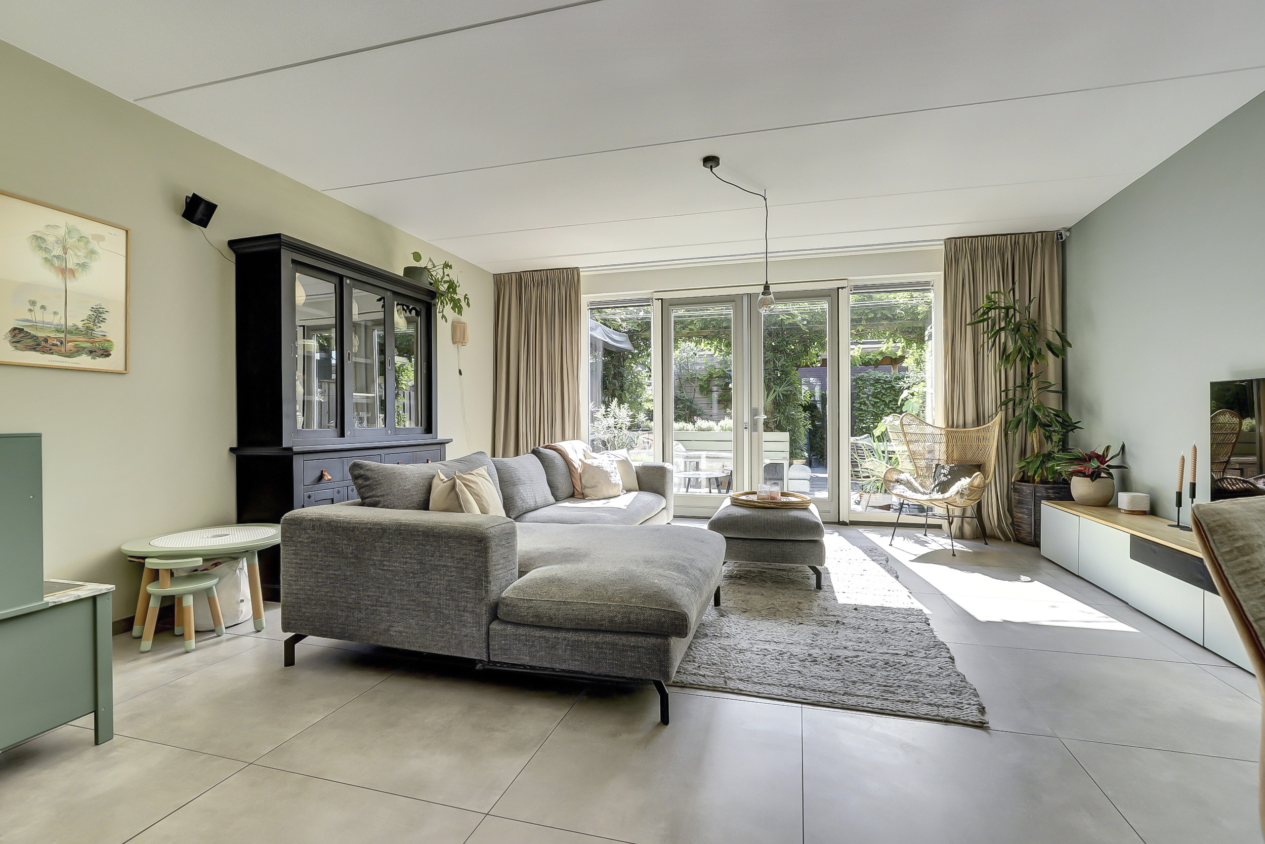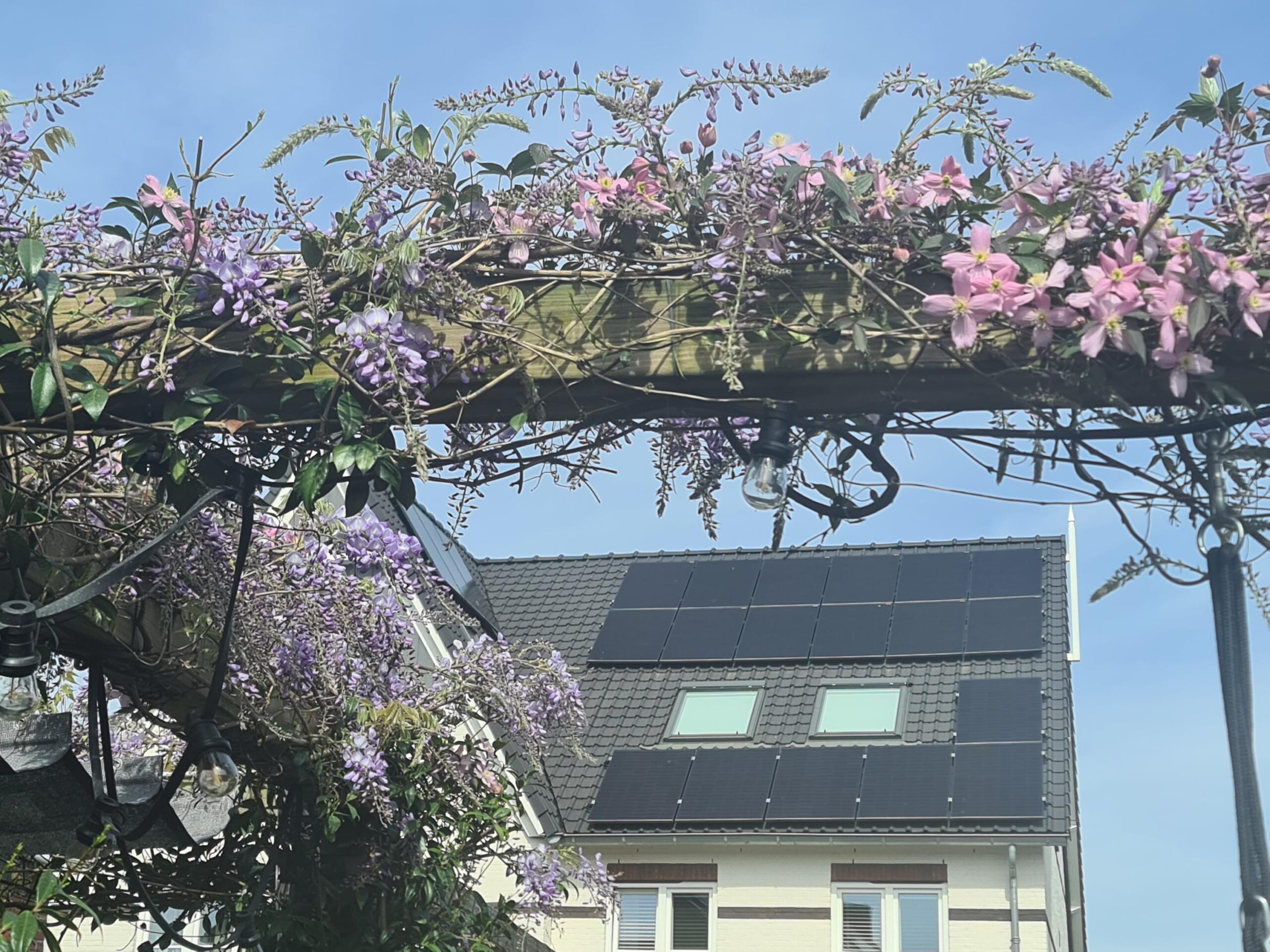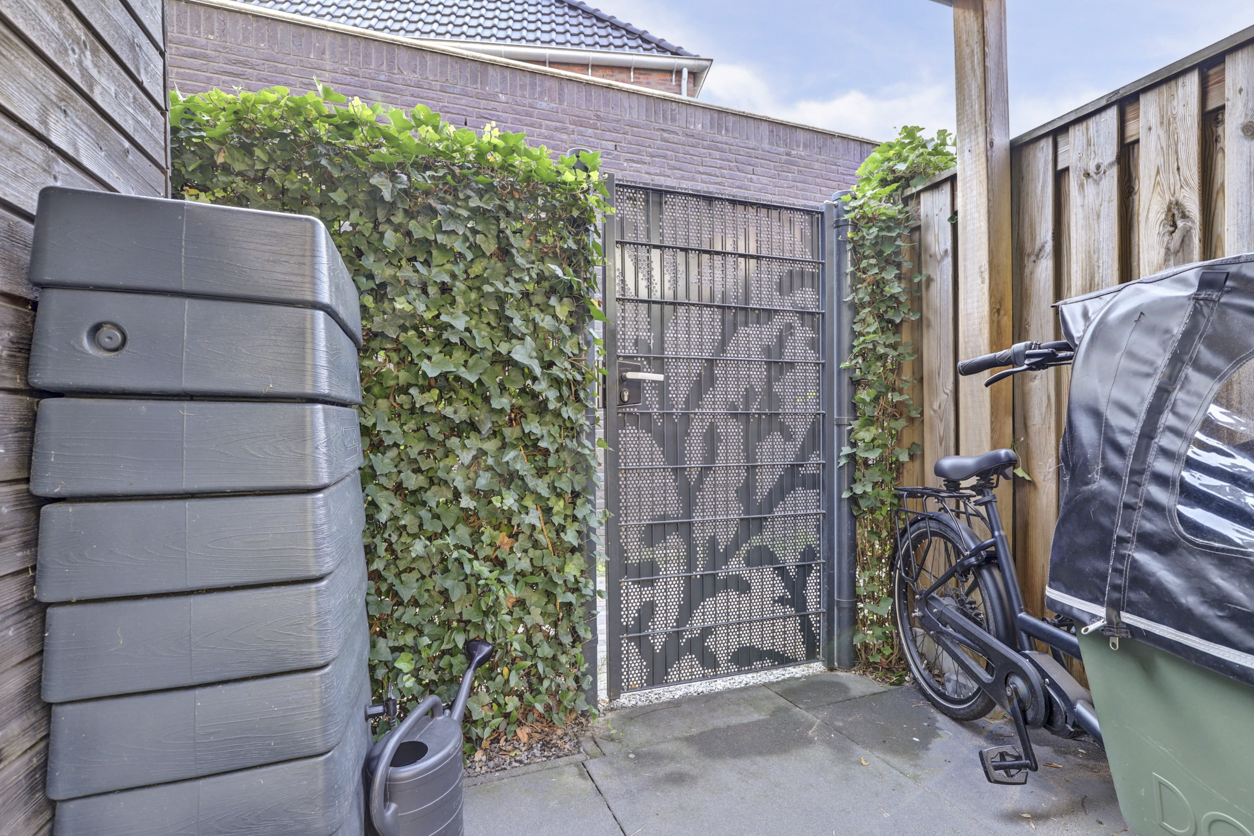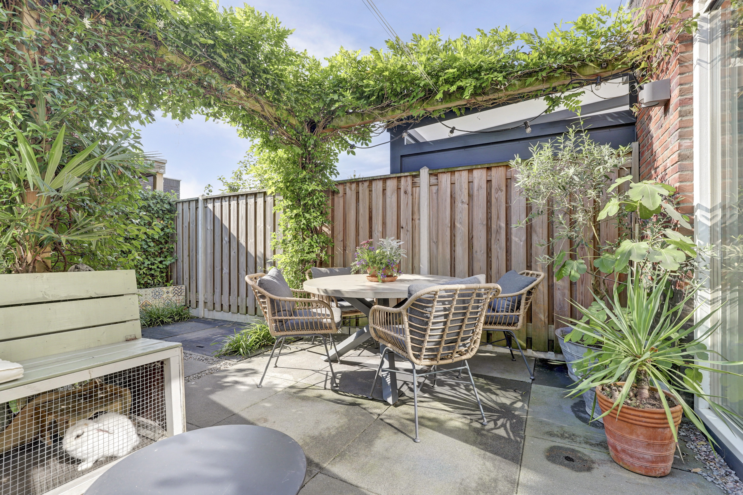 De zonnige achtertuin ligt op het zuidoosten, waardoor er van de vroege ochtend tot in de middag volop zon is. Wie liever de schaduw opzoekt, kan gebruikmaken van het aanwezige zonnescherm. De tuin is groen en modern ingericht en wordt sfeervol verfraaid door een prachtige blauwe regen die in bloei voor een charmant en kleurrijk accent zorgt. Achterin de tuin bevindt zich een houten berging, ideaal voor fietsen en tuingereedschap, met daaraan vast een praktische overkapping die extra beschutting biedt. Daarnaast beschikt de tuin over een achterom, wat het geheel extra toegankelijk maakt.