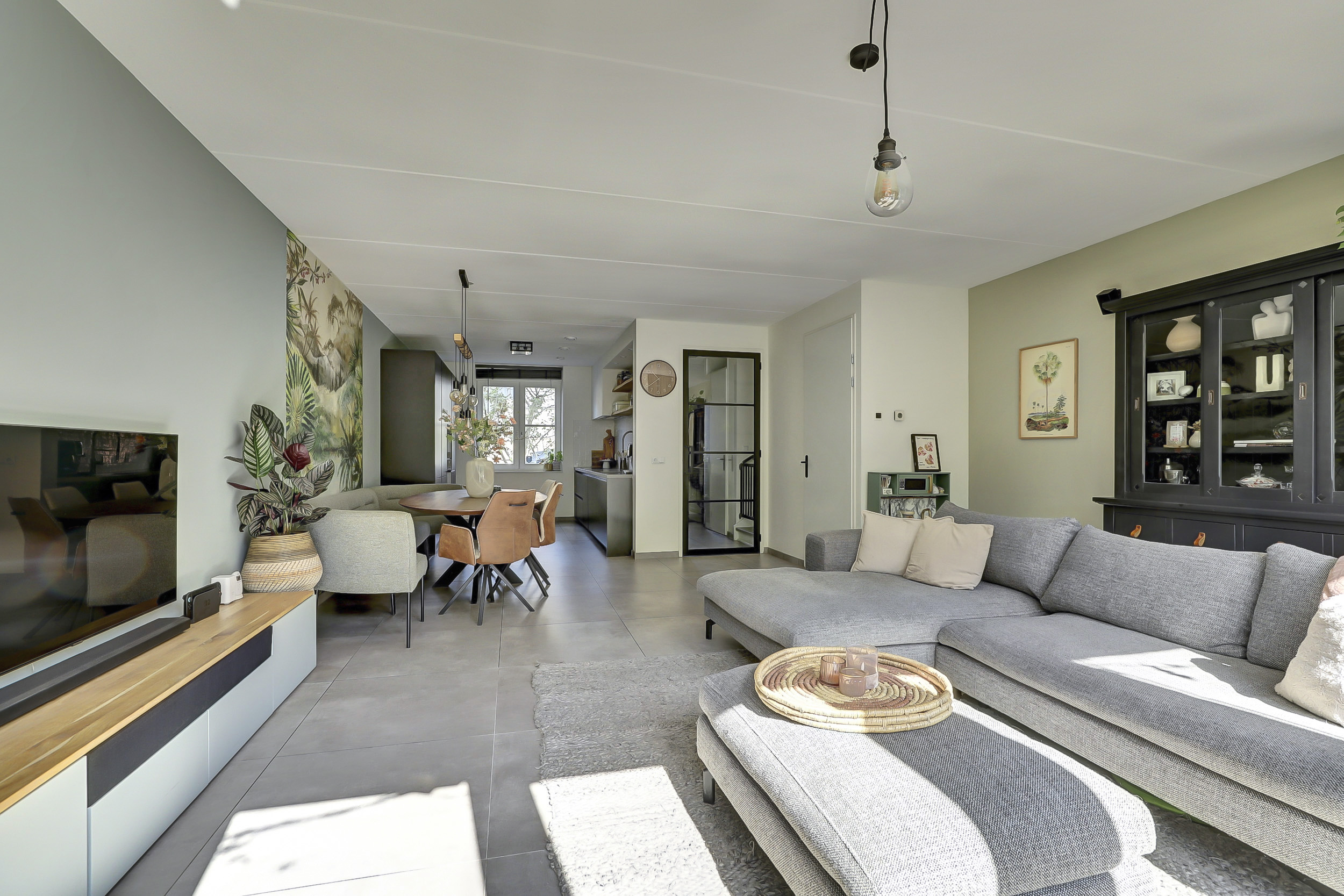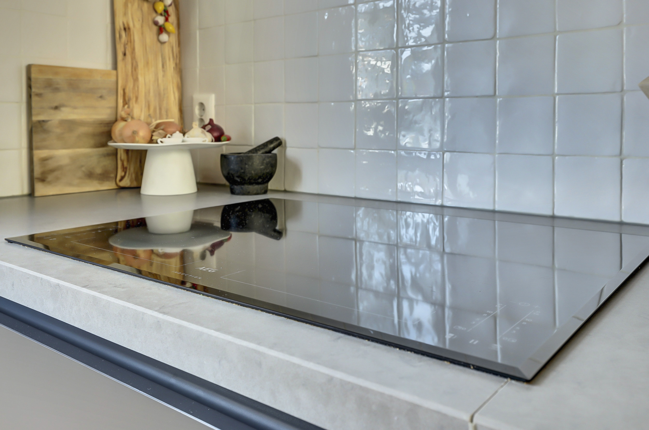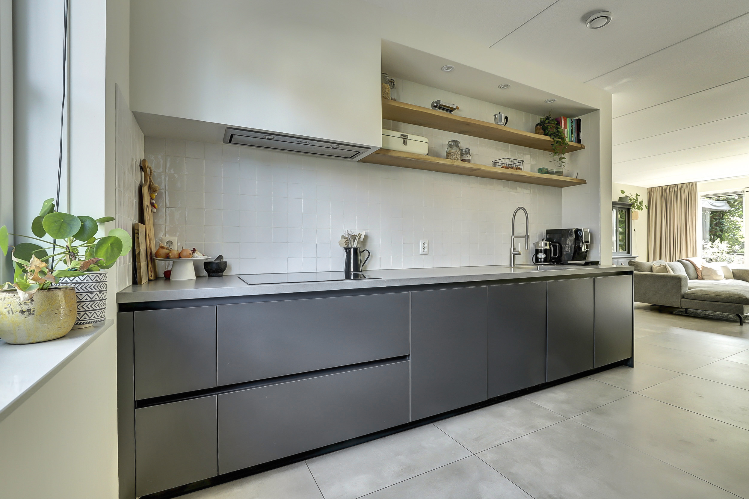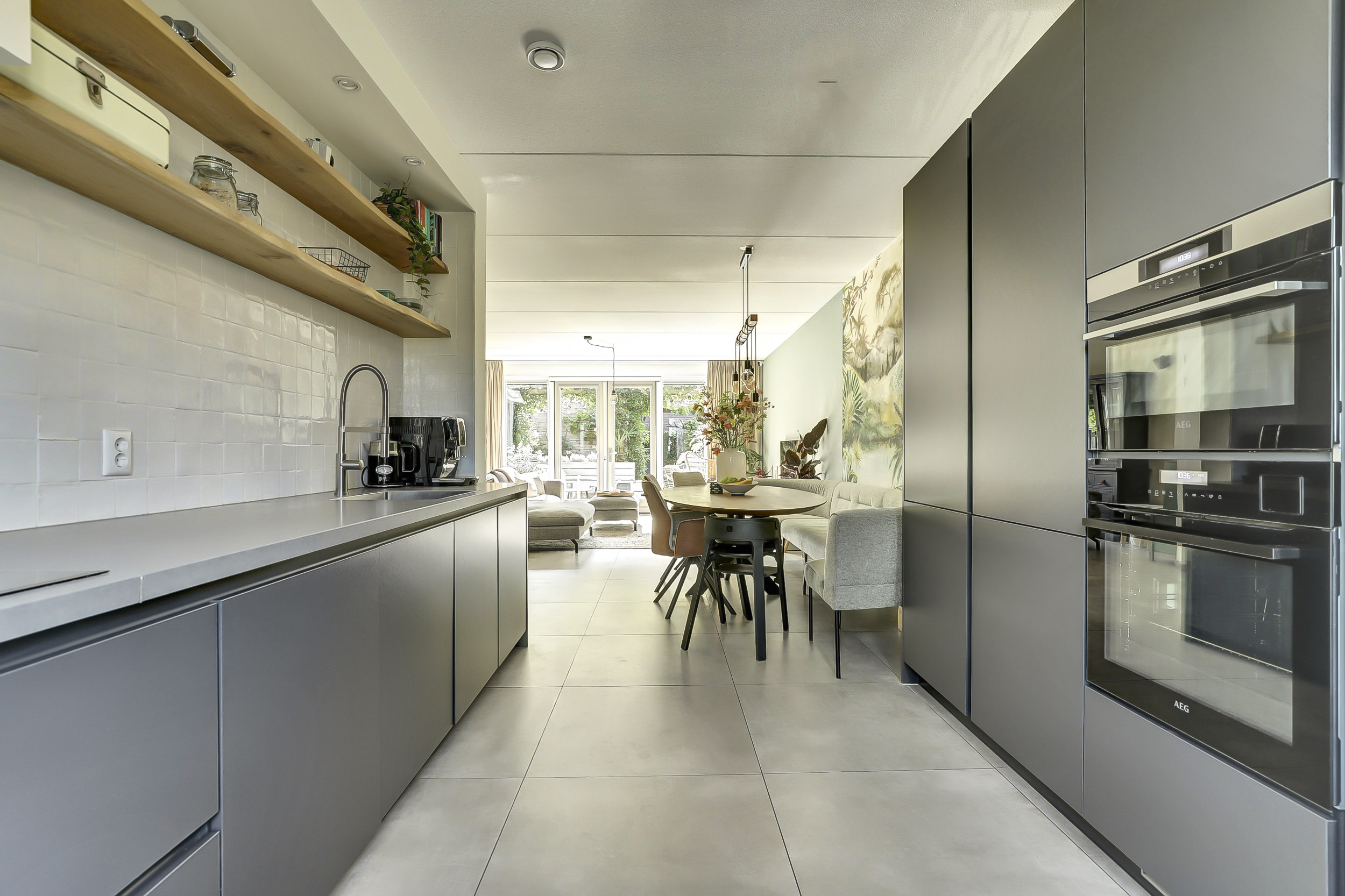 Via de entree kom je in de hal met meterkast, garderobe en toilet. De ruime woonkamer is uitgebouwd met 1,2 meter vanaf de bouw en biedt veel lichtinval. De open keuken aan de voorzijde van de woning is modern en hoogwaardig uitgevoerd. Deze is voorzien van een 4-pits inductiekookplaat met afzuigkap, een koel-vriescombinatie, vaatwasser en twee ovens: een combioven en een oven met stoomfunctie. Alle apparatuur is van AEG en het geheel wordt compleet gemaakt met een strak composieten aanrechtblad en een greeploos design, wat de keuken een luxe en mooie uitstraling geeft.