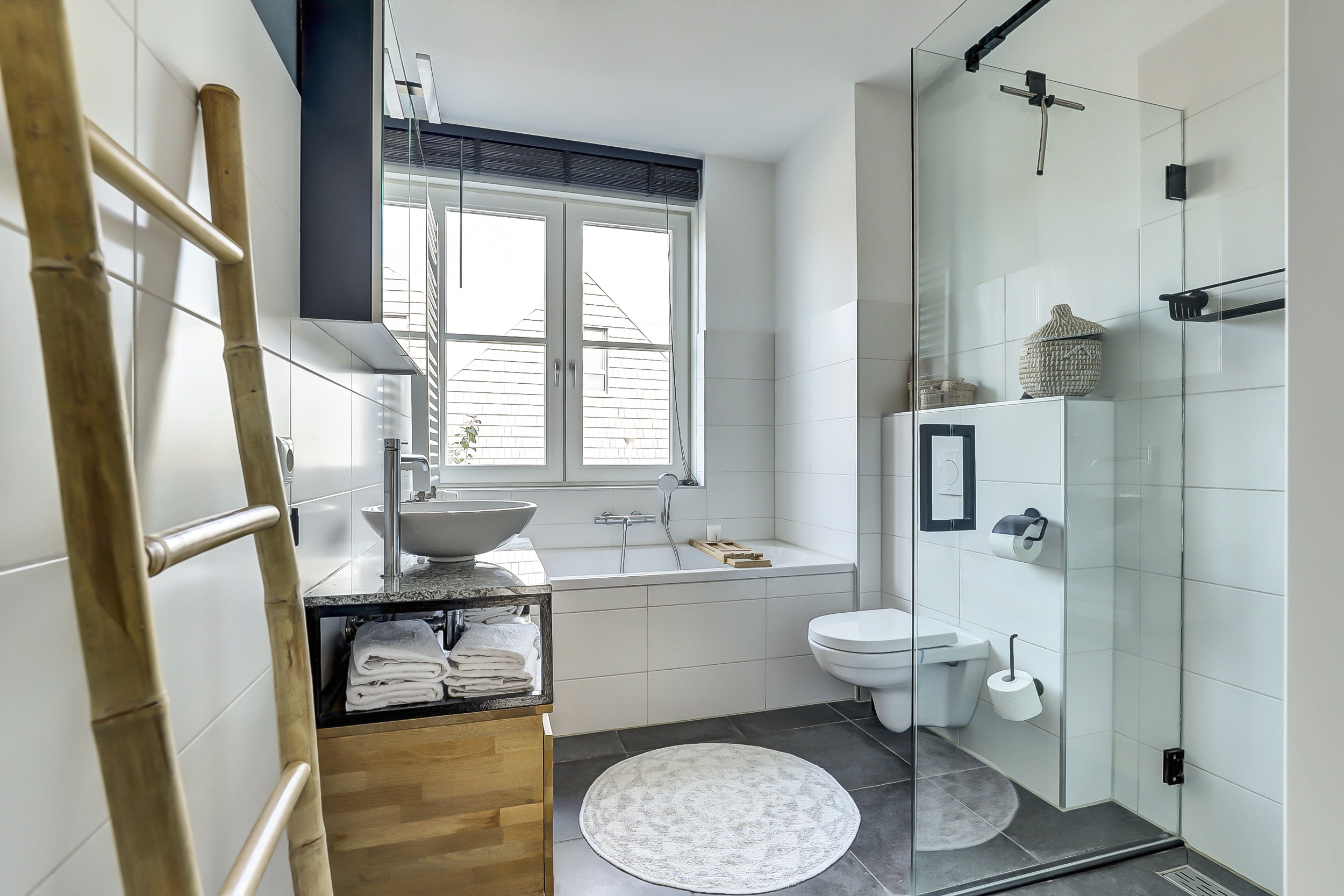 Op de eerste verdieping bevinden zich drie royale slaapkamers. De badkamer is volledig uitgerust met een ligbad, douche, wastafelmeubel en wandcloset, wat comfort en praktische functionaliteit combineert.