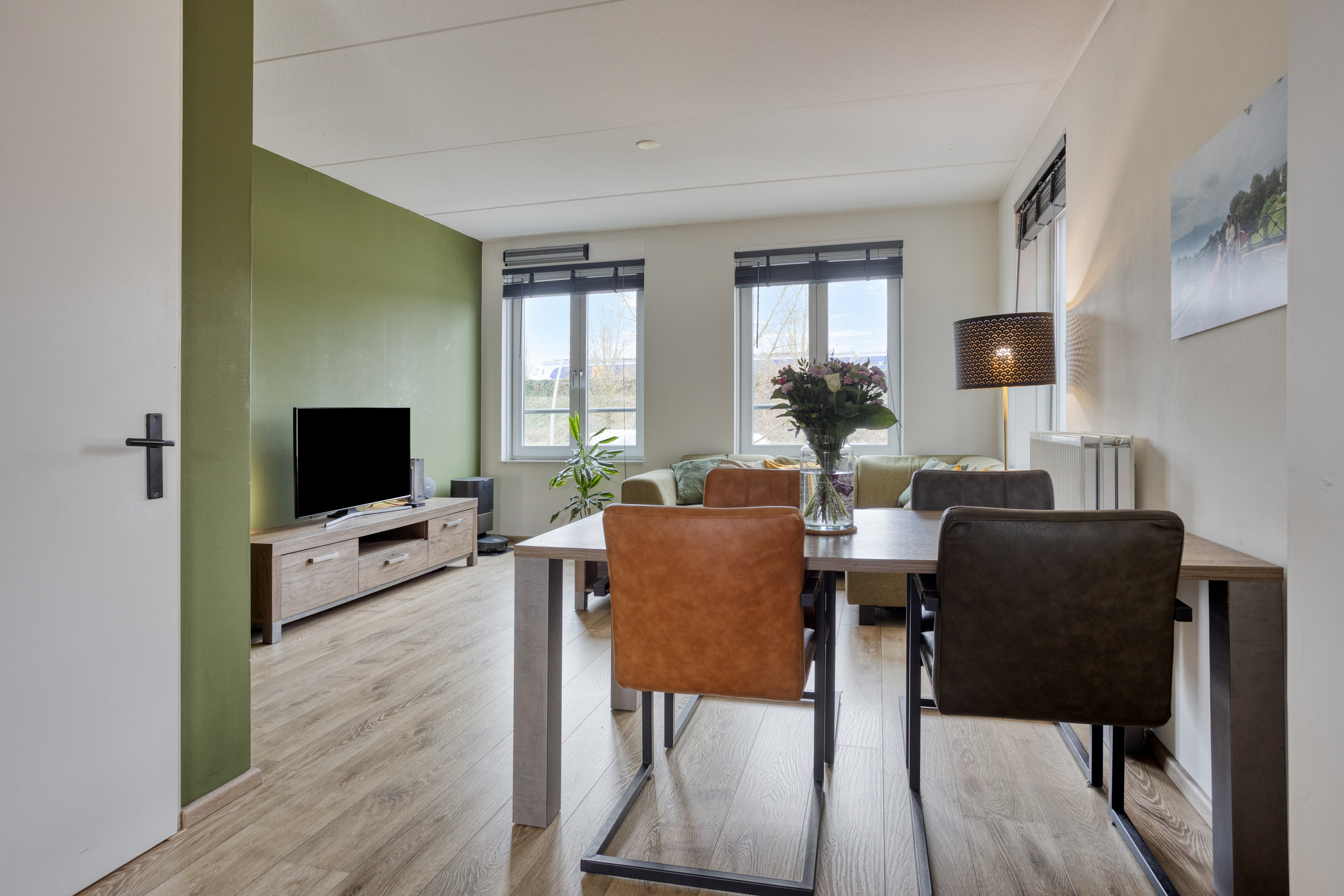 De woonkamer vormt een lichte en uitnodigende ruimte waar wonen en ontspannen centraal staan. Grote raampartijen zorgen voor een prettige hoeveelheid daglicht, waardoor de ruimte open en aangenaam aanvoelt. Vanuit de woonkamer is het balkon bereikbaar, een fijne plek om even buiten te zitten.