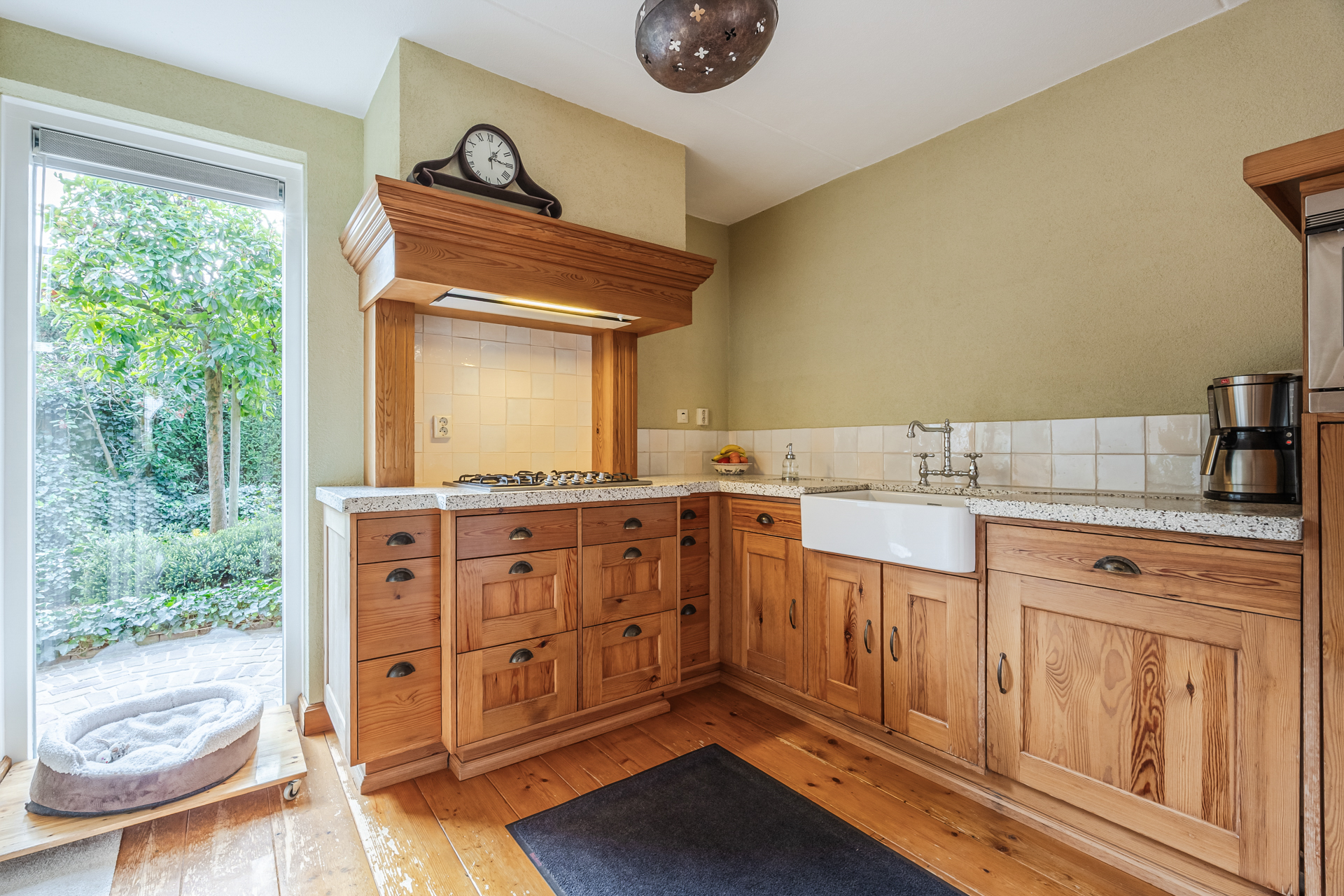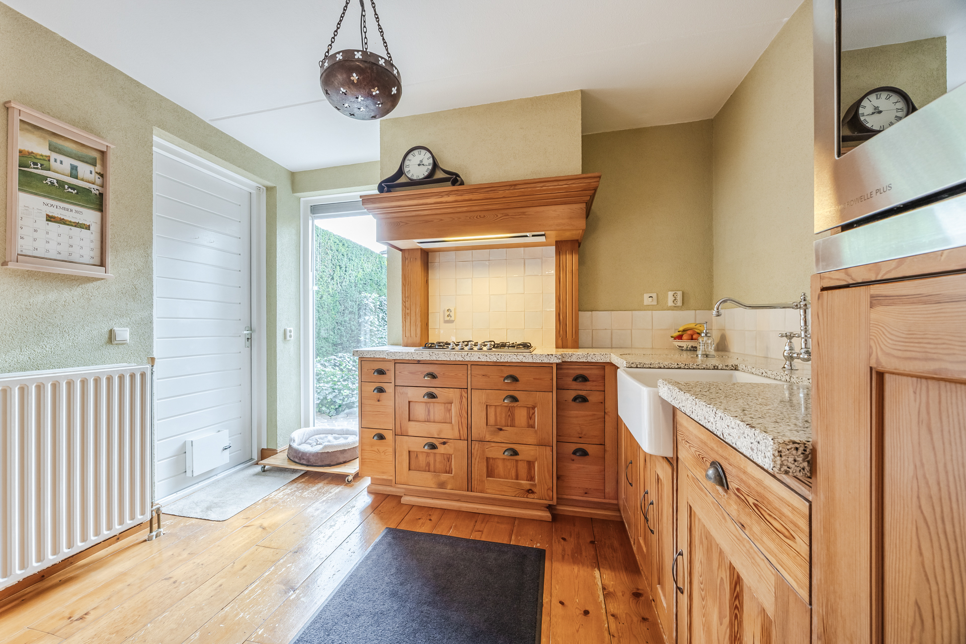 Je komt binnen in de ruime hal waar zich de trap naar de eerste verdieping bevindt, evenals het toilet. Wie hier binnenstapt, merkt het meteen: dit is een huis dat klopt. De ruime L-vormige woonkamer beschikt over een gezellige zit- en eethoek met grote ramen, openslaande deuren en een vrij uitzicht aan de voorzijde. De keuken is een sfeervolle blikvanger: ambachtelijk maatwerk, afgewerkt met een terrazzo blad en voorzien van inbouwapparatuur – stijlvol én functioneel. Aangrenzend aan de keuken vind je de bijkeuken met witgoedaansluitingen, cv-installatie en toegang tot de garage.