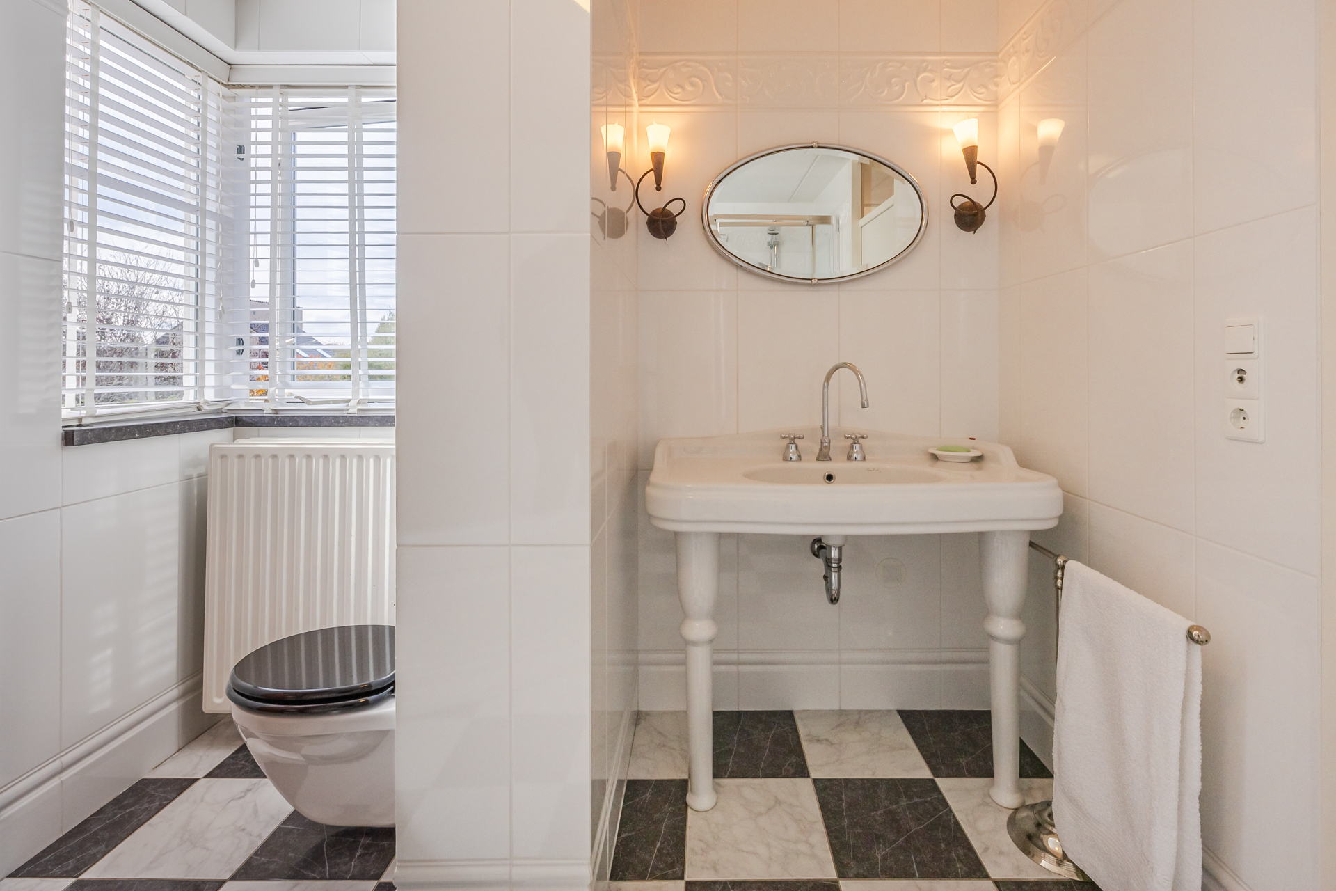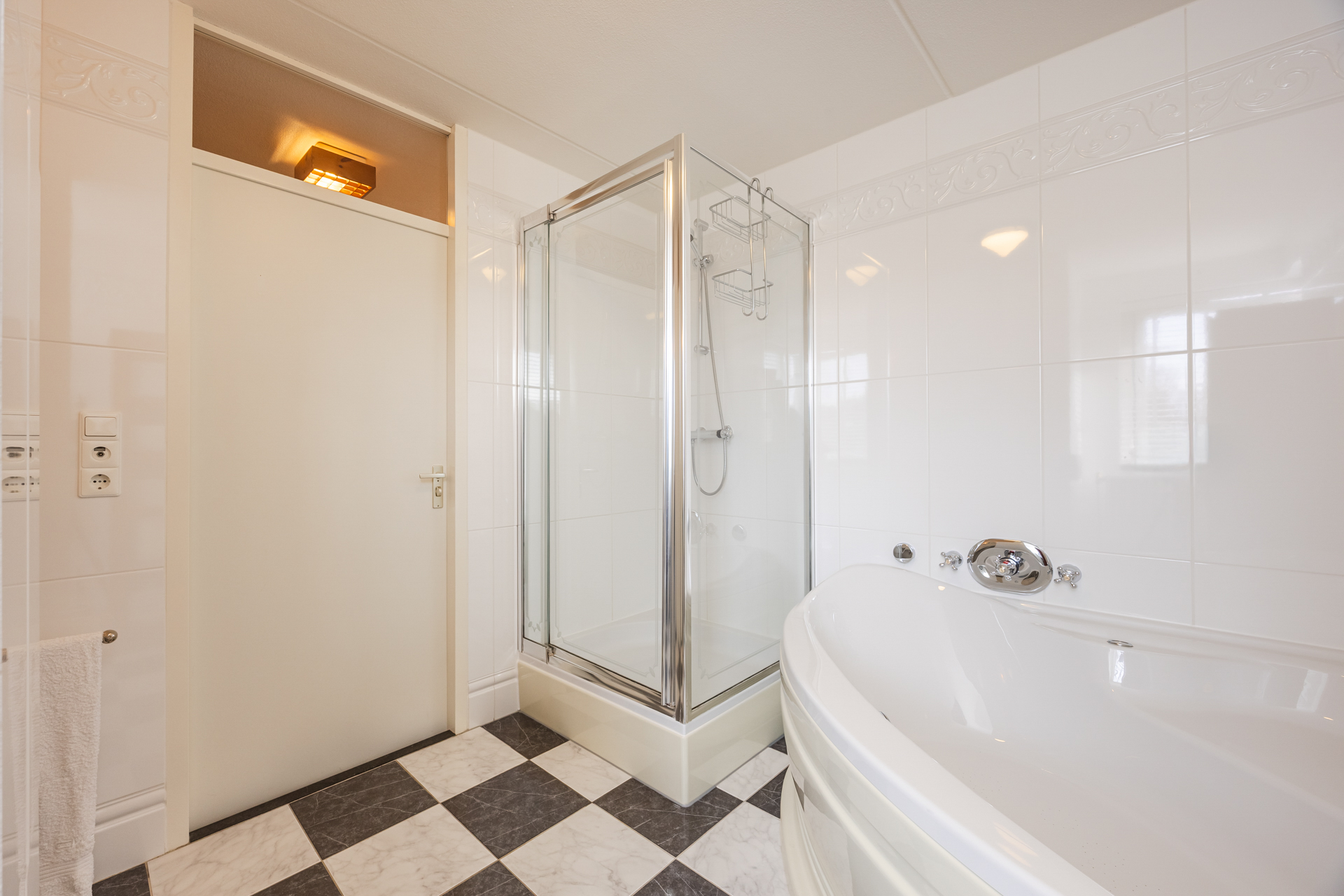 Op de eerste verdieping wachten twee ruime slaapkamers (drie slaapkamers zijn gemakkelijk te realiseren) en een nette badkamer met douche, toilet, wastafel en een luxe whirlpool ligbad met extra verwarmde bubbels en automatische droogblaas functie om heerlijk te kunnen ontspannen.