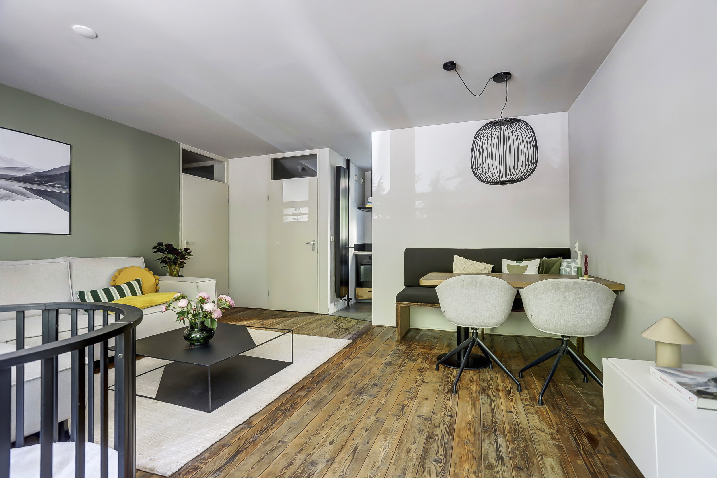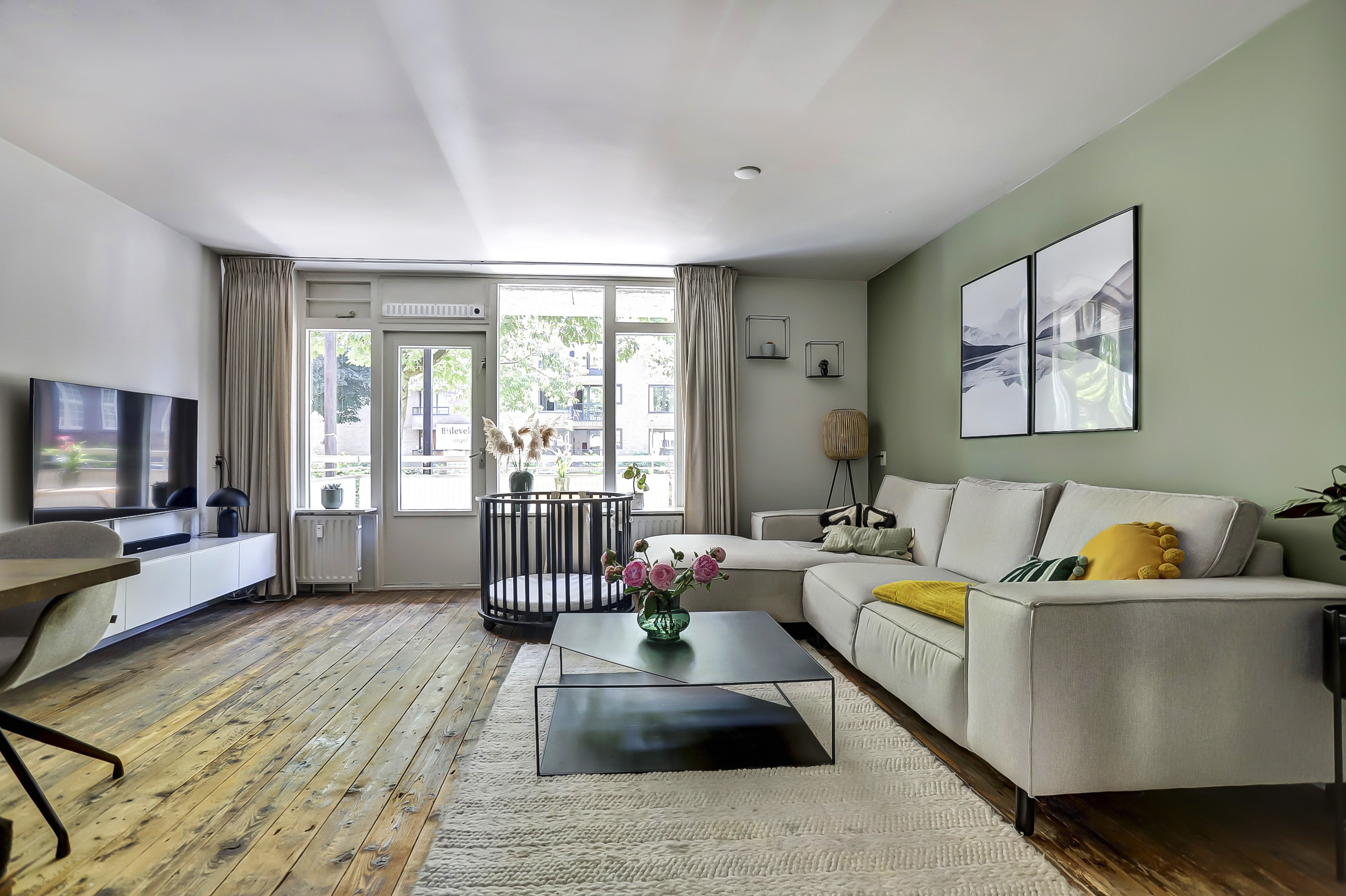 De woonkamer is ruim, met een fijne rechthoekige indeling die zich uitstekend leent voor een comfortabele zit- én eethoek. Grote raampartijen zorgen voor veel daglicht, en de openslaande deur geeft toegang tot het balkon op het zuidoosten – een ideale plek voor je ochtendkoffie of een borrel in de zon. De vloer in het hele appartement is een echte eyecatcher: een karaktervolle Franse kasteelvloer.