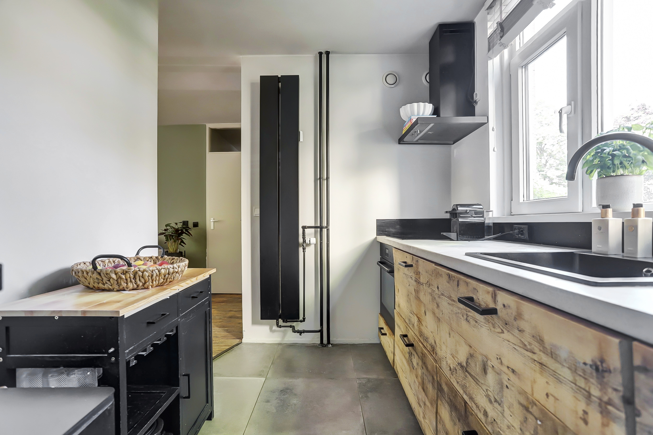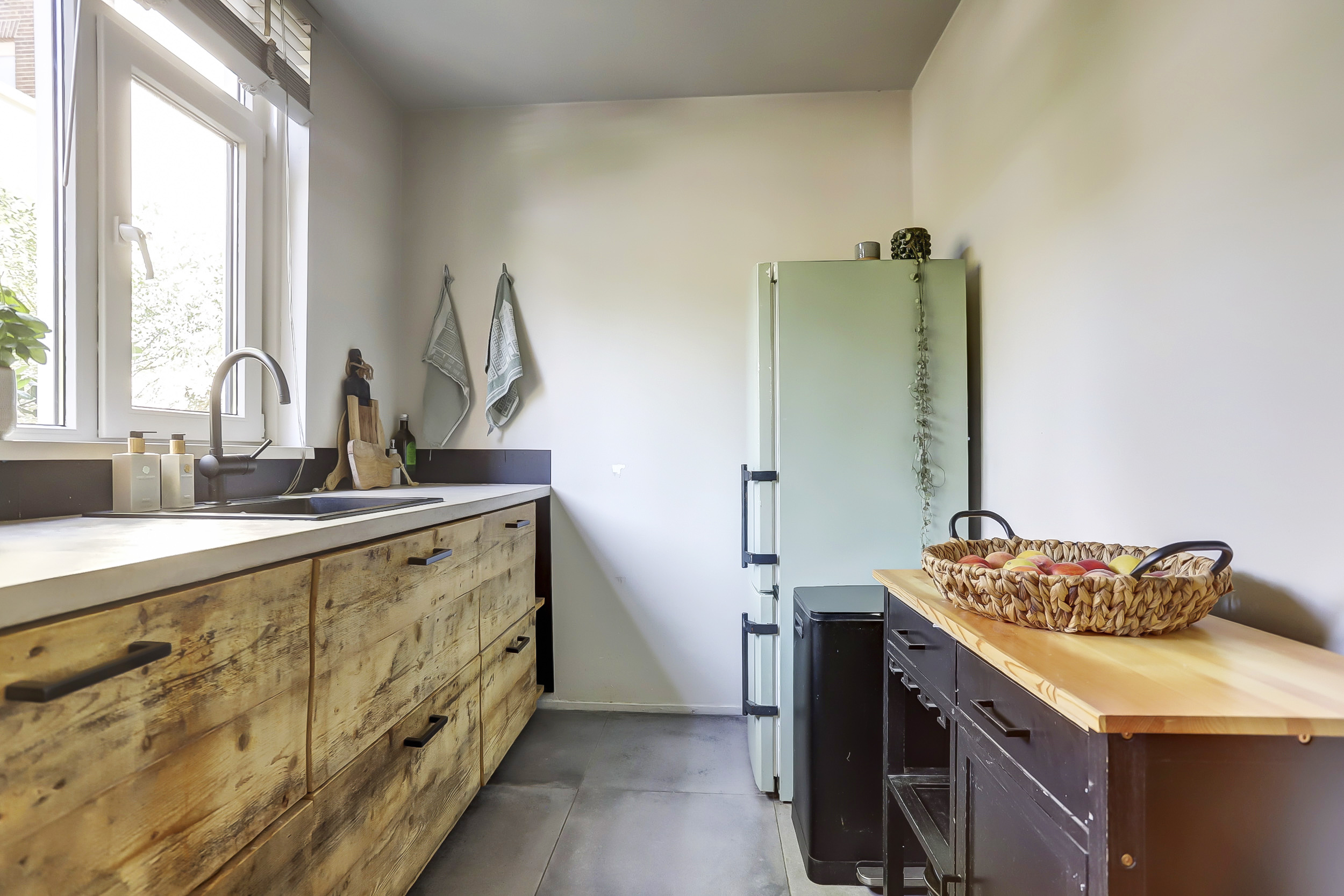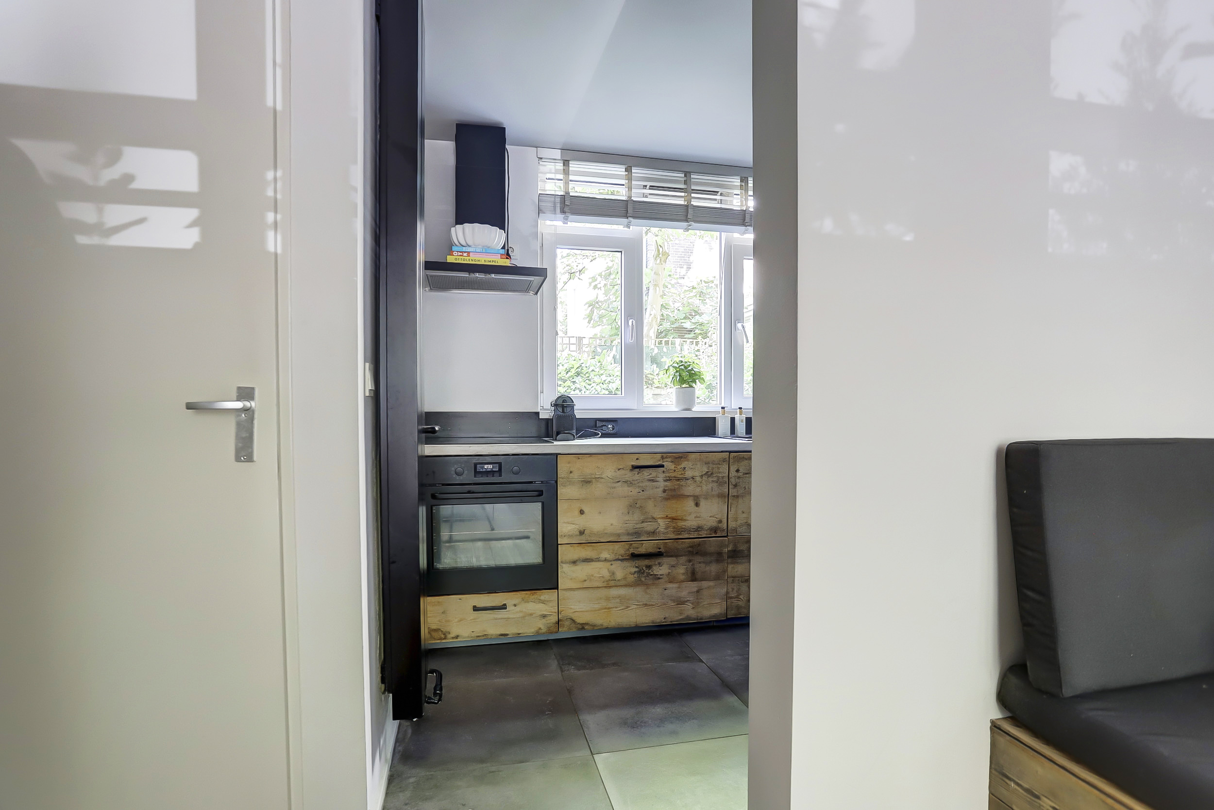 De moderne halfopen keuken (2019) is voorzien van een inductiekookplaat, afzuigkap, oven, spoelbak, vaatwasser en losse koelkast. Direct naast de keuken bevindt zich een praktische inpandige berging met aansluitingen voor wasmachine en droger.