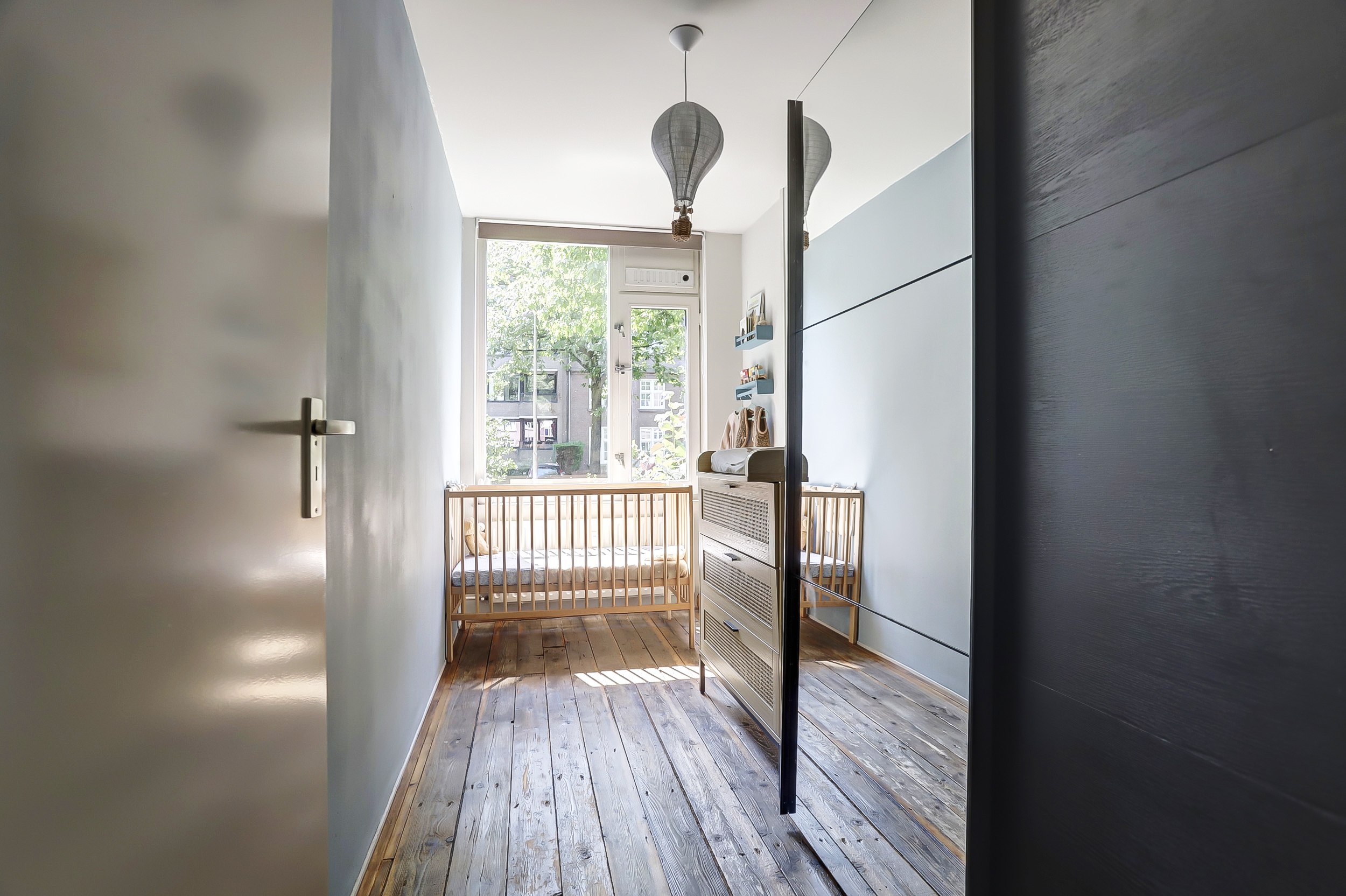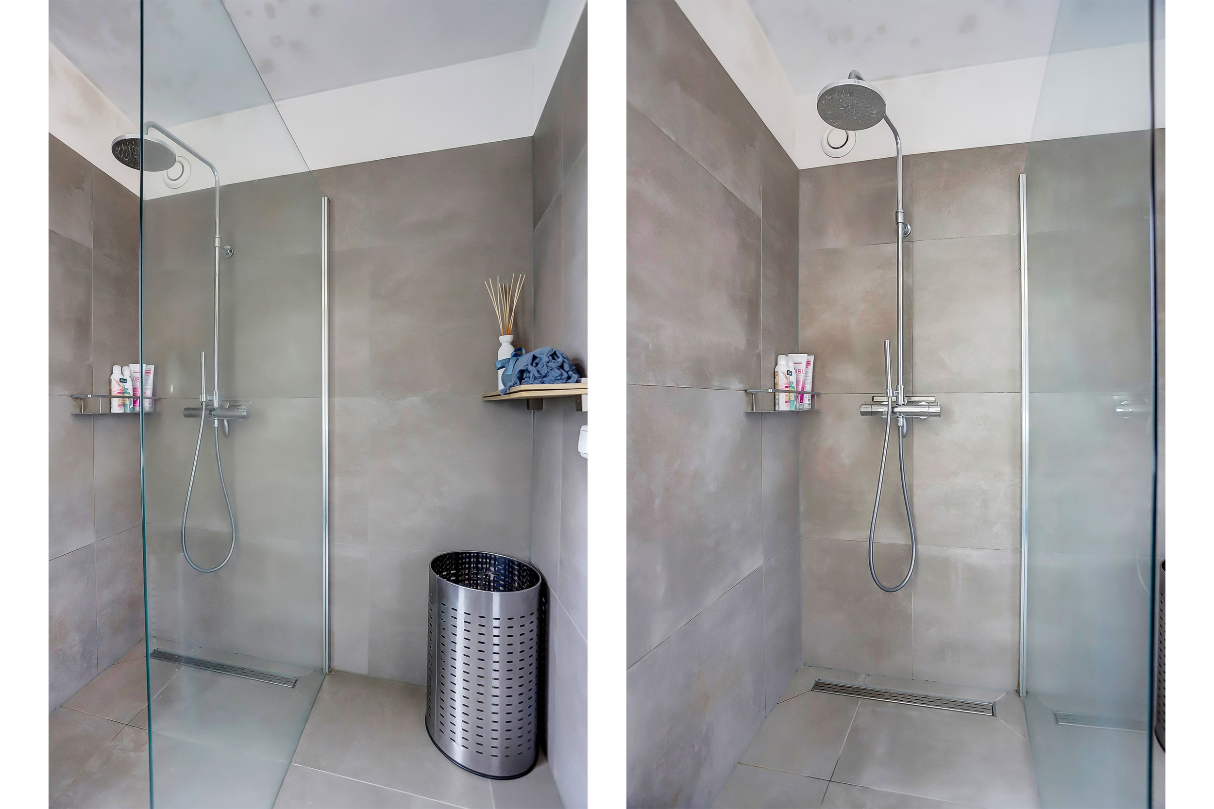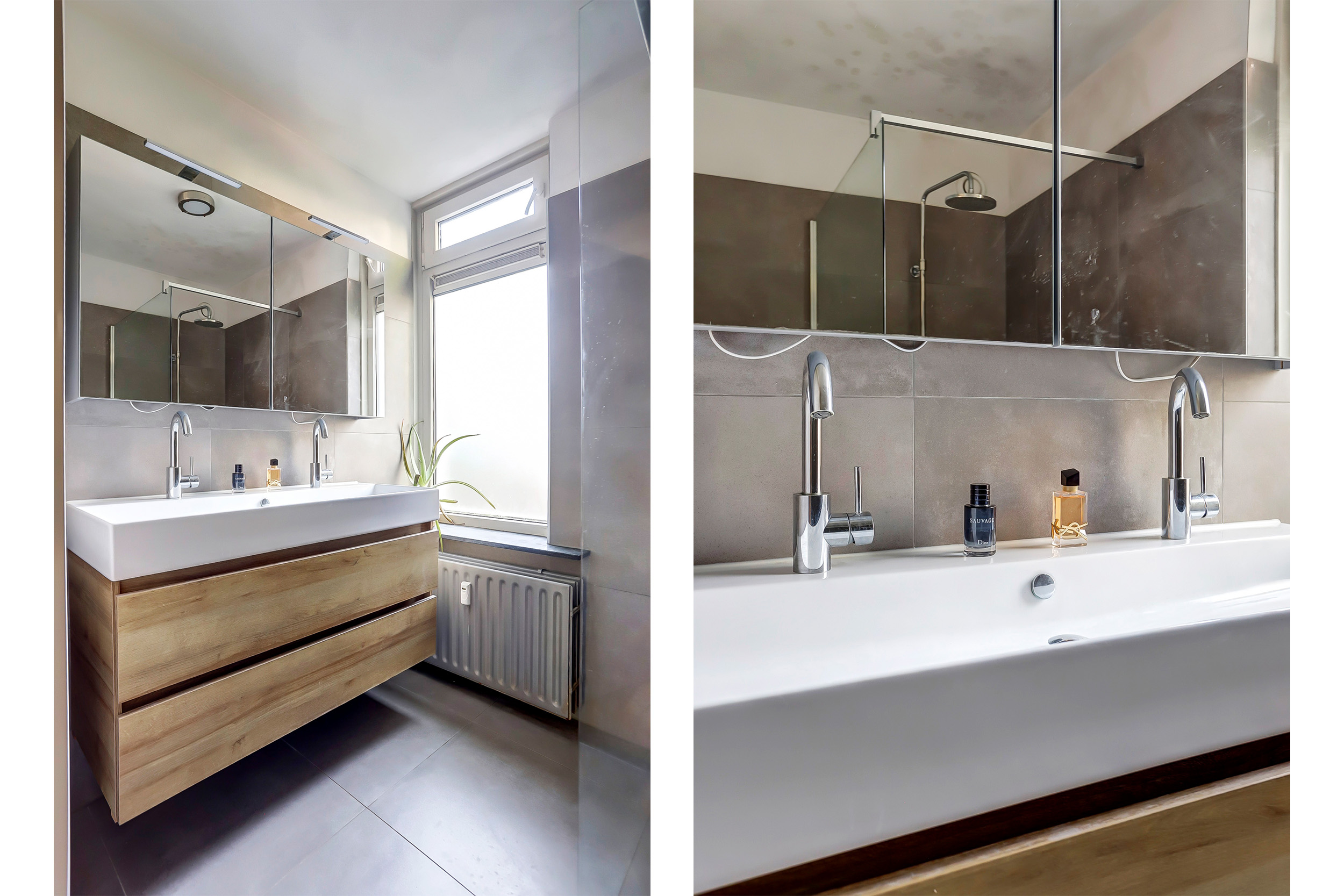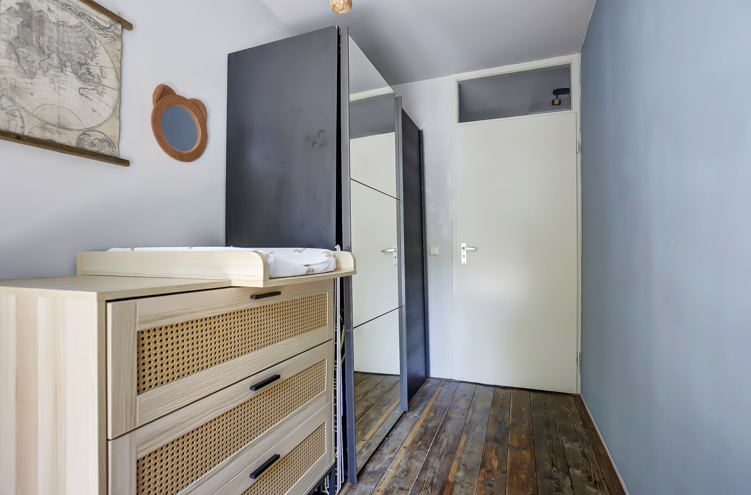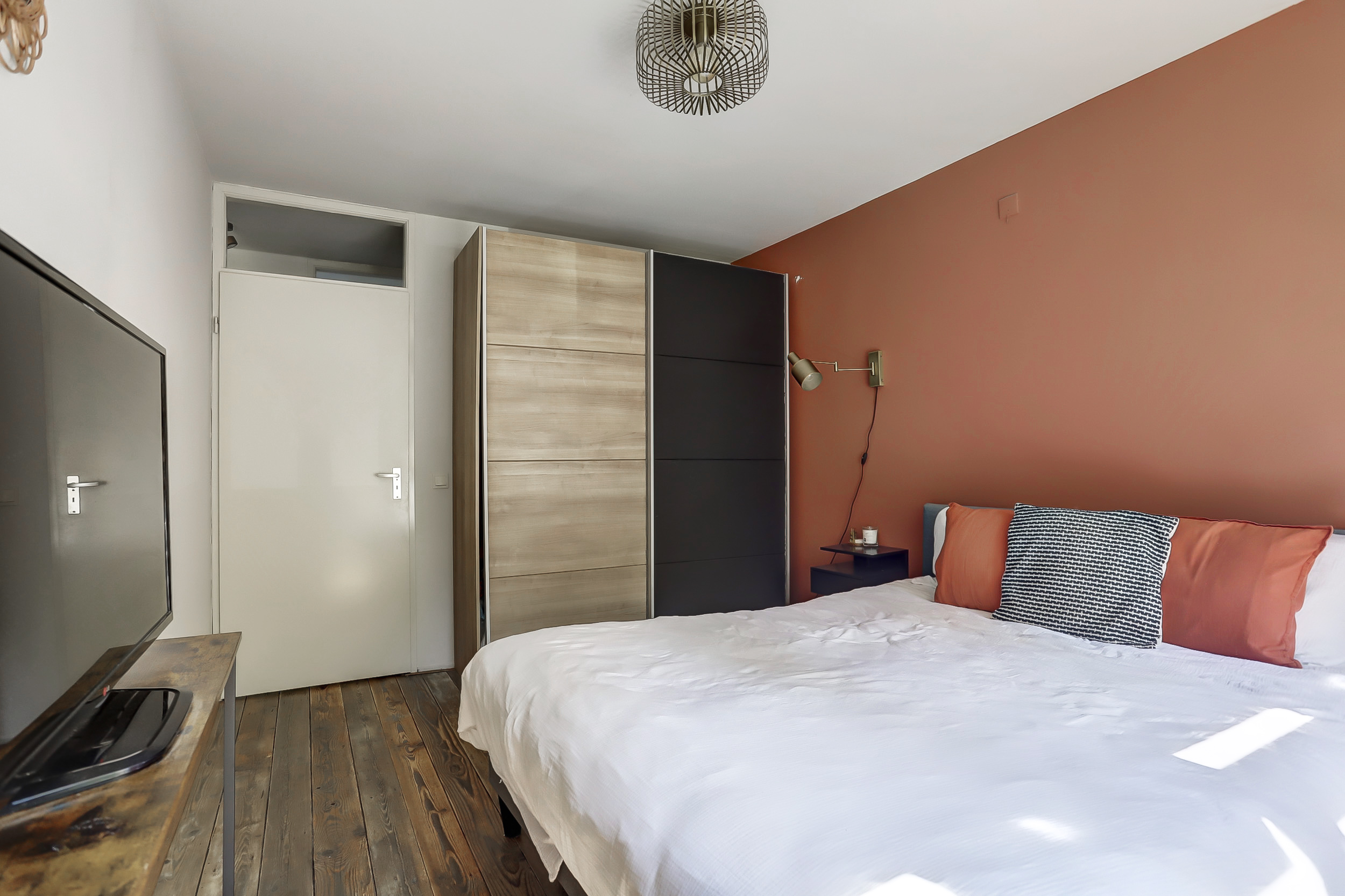 Er zijn twee slaapkamers: een ruime hoofdslaapkamer en een tweede kamer die perfect is als werkkamer, logeerkamer of kinderkamer. De badkamer (eveneens vernieuwd in 2019) is modern en functioneel, uitgerust met een wastafelmeubel met dubbele kraan en een royale inloopdouche.