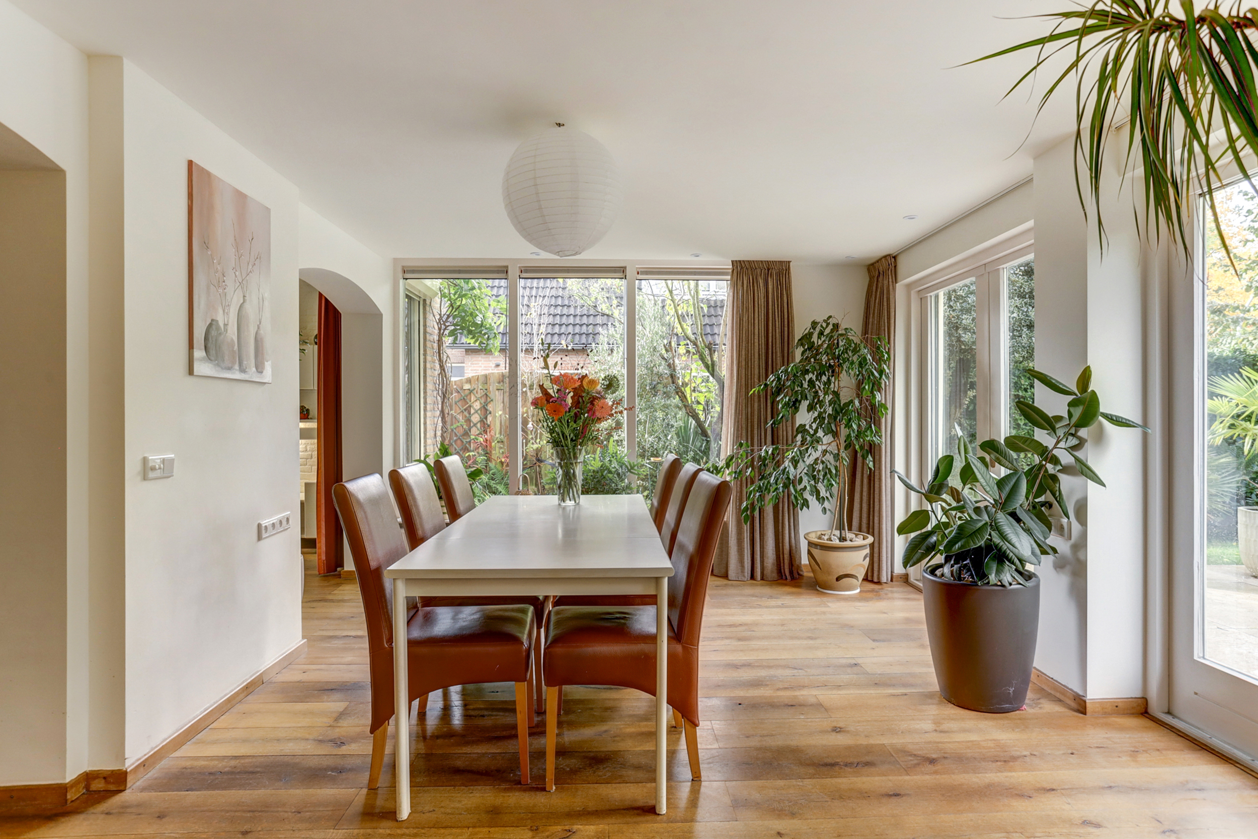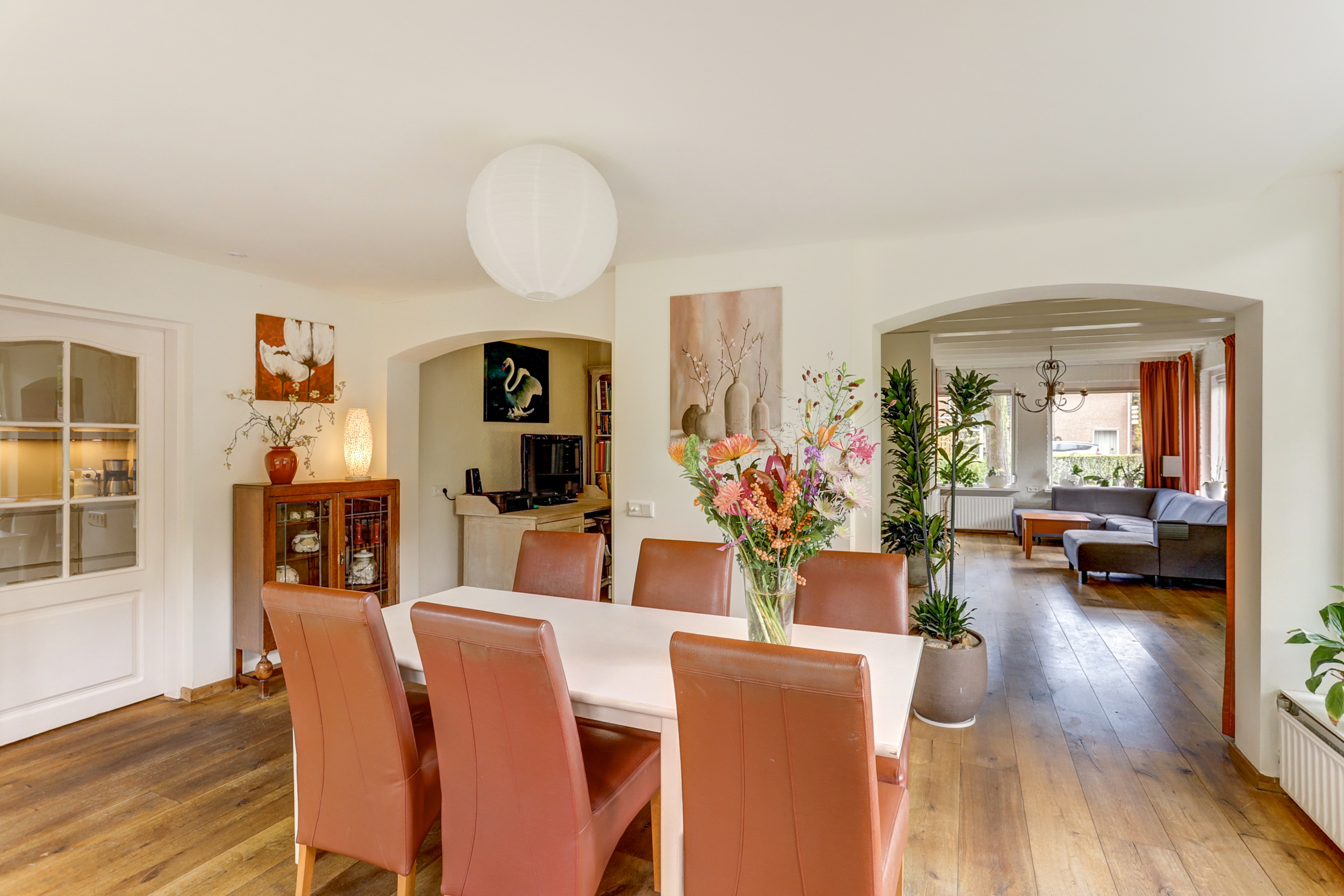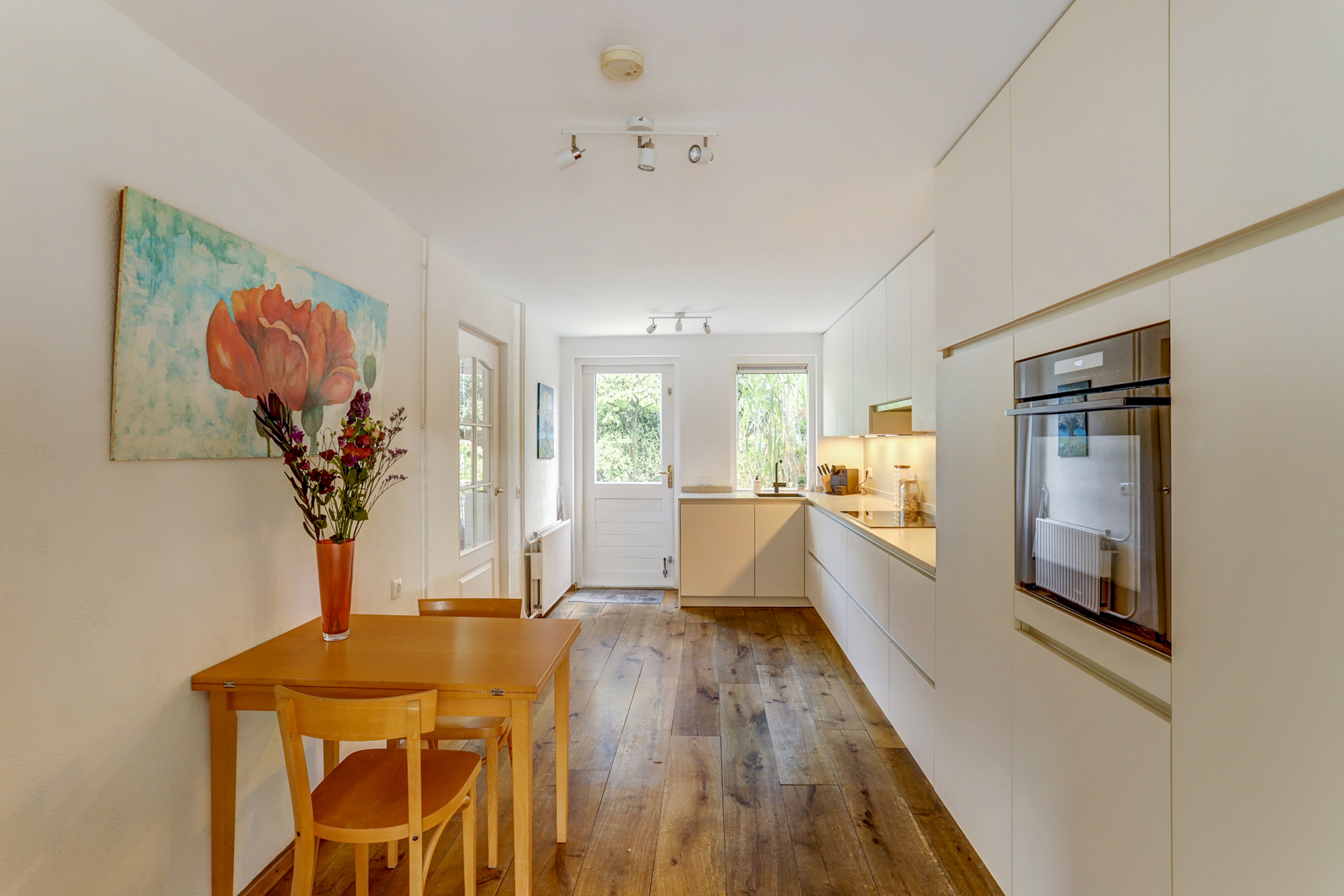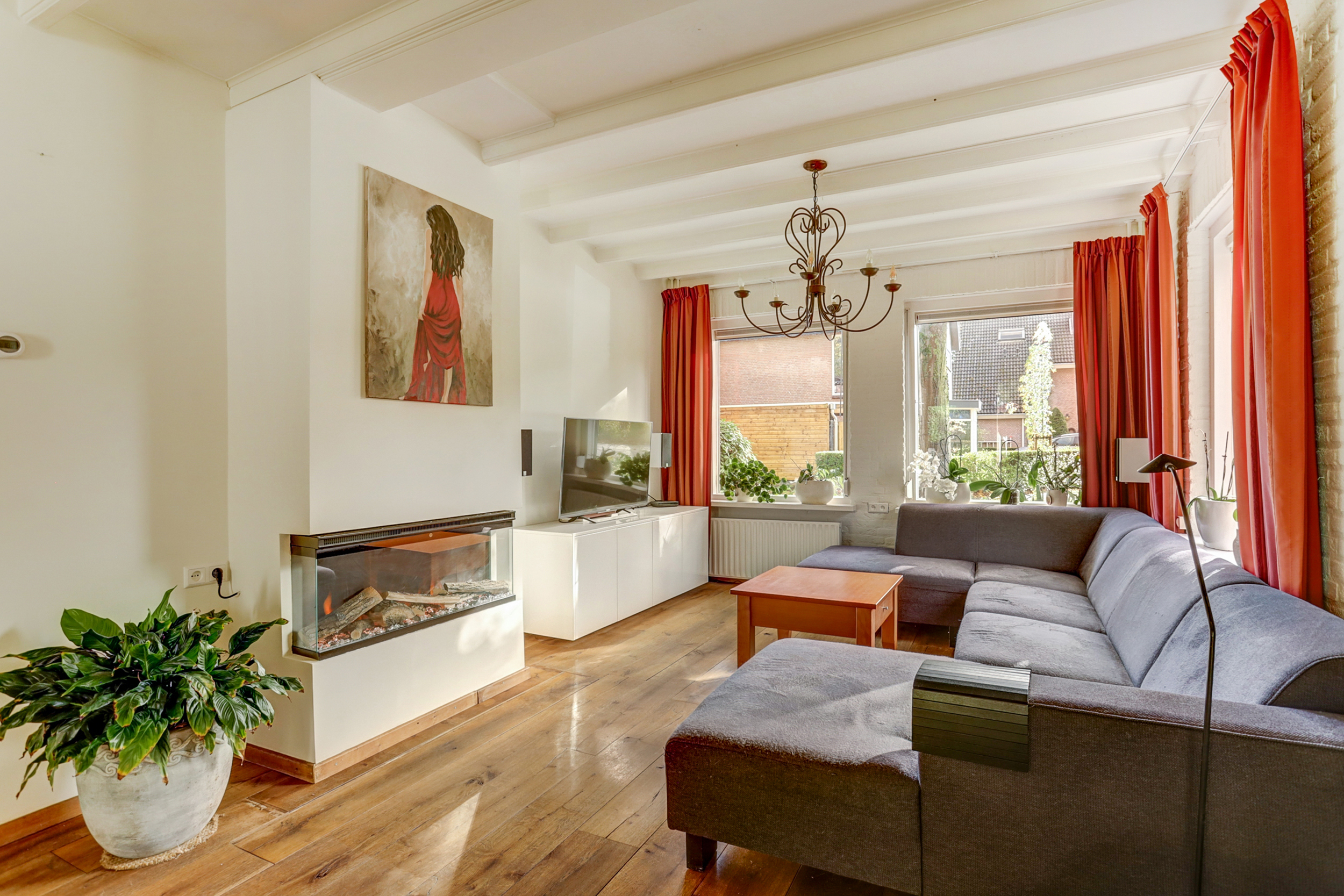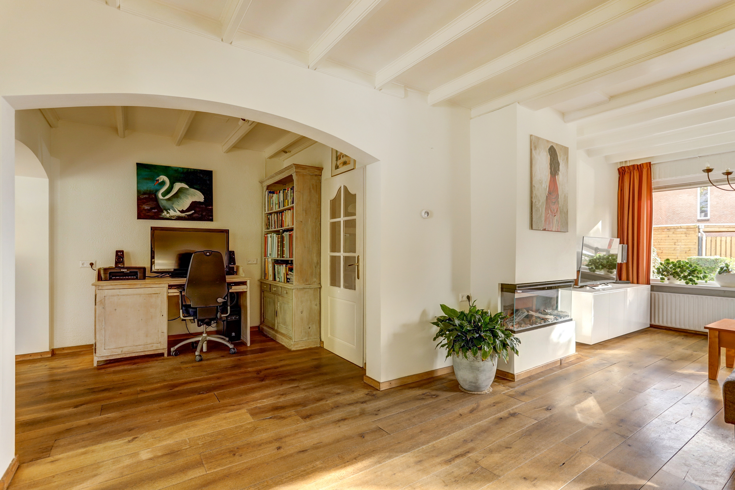 Entree/hal met garderobe nis, de meterkast, de toiletruimte met wandcloset, fontein en spotje en de trapopgang naar de 1ste verdieping. De sfeervolle en ruime woonkamer is voorzien van een eikenhouten plankenvloer, deels gestuukte wanden en deels geschilderde schoonmetselwerk wanden, sfeervol balkenplafond, elektrische haard (voorheen openhaard) en (deels elektrisch) rolluiken. Aan de achterzijde, in de uitbouw bevindt zich de royale en lichte eetkamer met dubbele openslaande deuren naar de achtertuin, houten plankenvloer, strak gestuukte wanden en plafonds, spotjes en deur naar de keuken. Tussen de woonkamer en eetkamer bevindt zich nog een extra ruimte voor bijvoorbeeld een werkplek of speelhoek. De moderne en L-vormig opgestelde keuken is in 2024 geplaatst en is van alle gemakken voorzien, o.a. veel kastruimte/lades, houten plankenvloer, close-in-boiler (2020), deur naar de achtertuin en diverse inbouwapparatuur, zoals 5-pits inductiekookplaat, afzuigkap, vaatwasser (2022), combioven, koelkast en vriezer. Vanuit de keuken is via schuifdeuren de praktische bijkeuken te bereiken met veel extra bergruimte, een pantryblokje met een wasbak met koud en warm water en de mogelijkheid om een wasmachine en droger te plaatsen.