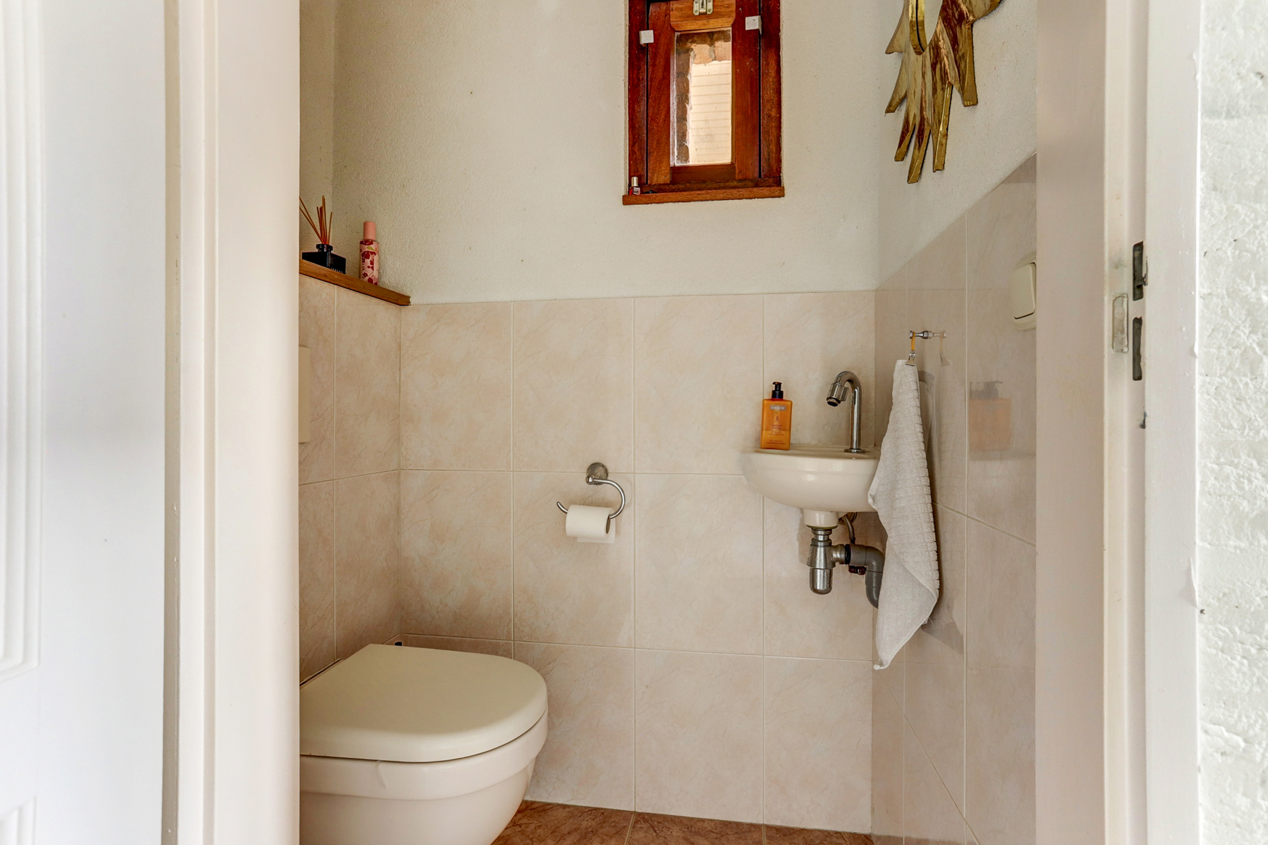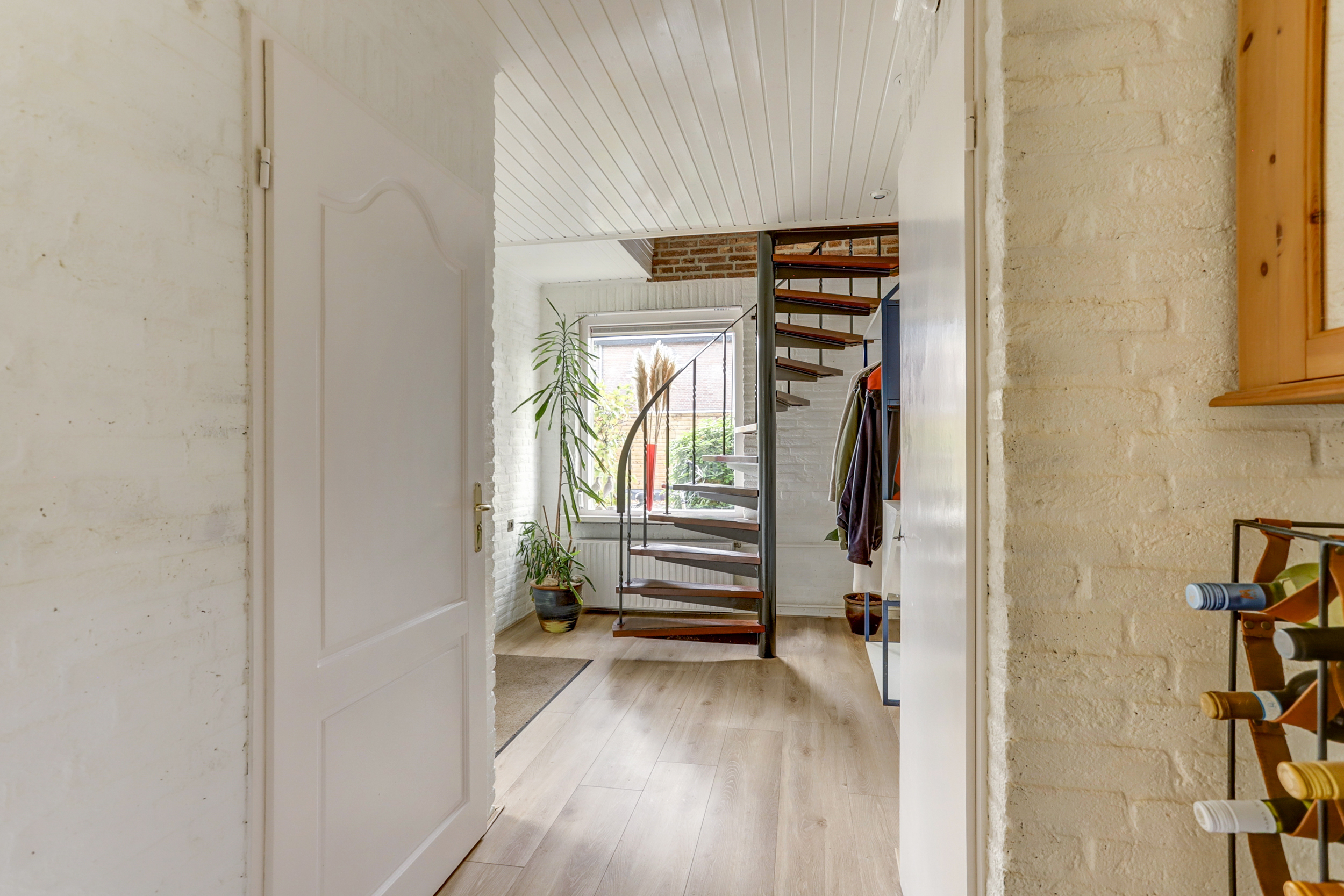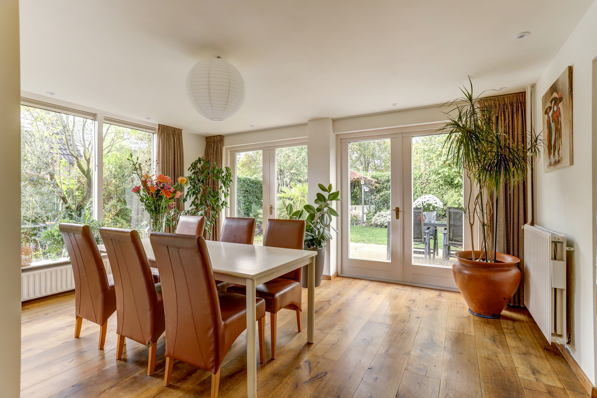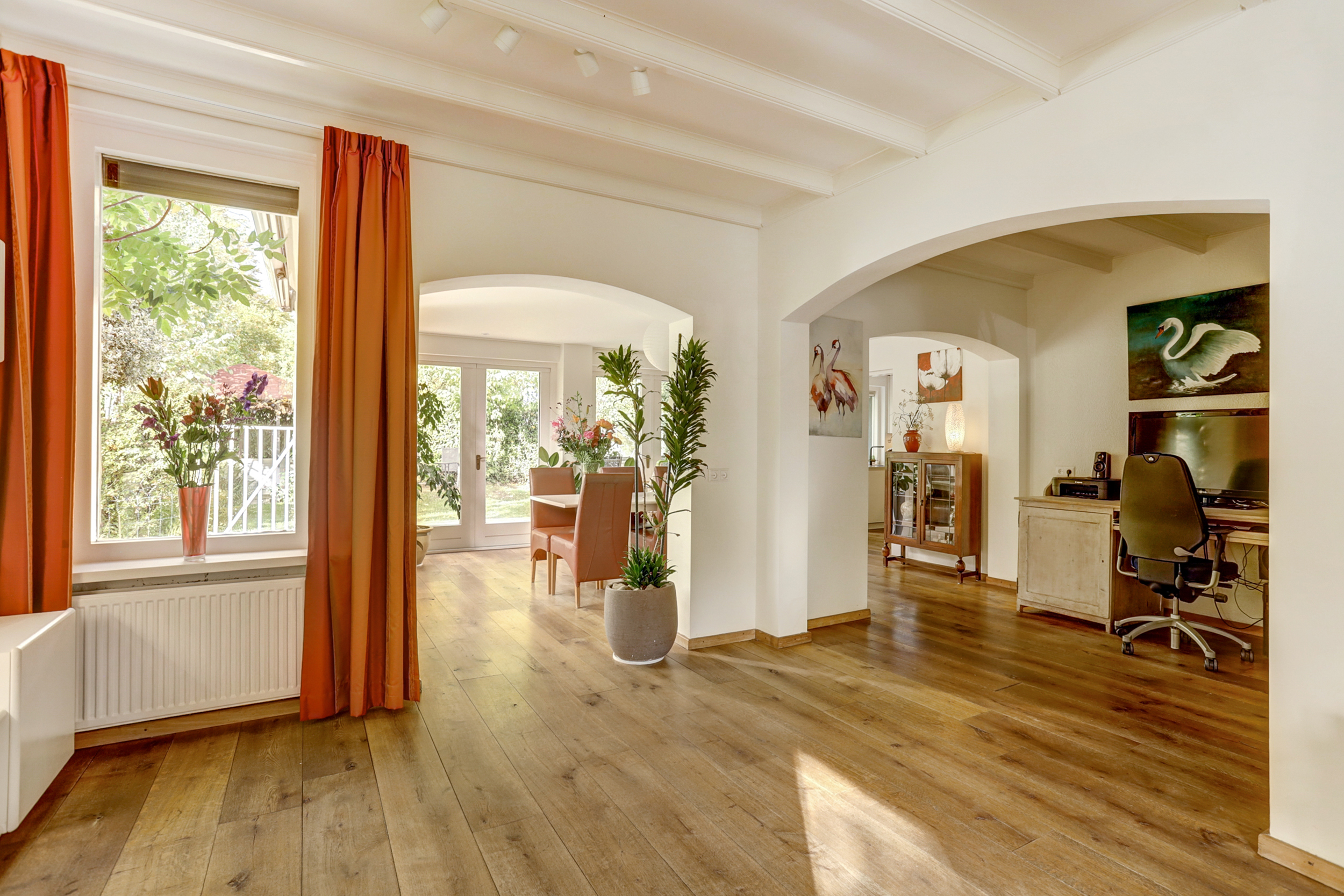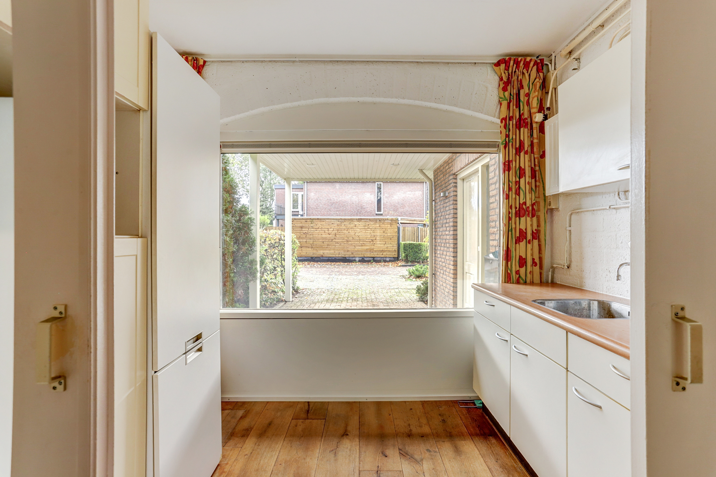 Entree/hal met garderobe nis, de meterkast, de toiletruimte met wandcloset, fontein en spotje en de trapopgang naar de 1ste verdieping. De sfeervolle en ruime woonkamer is voorzien van een eikenhouten plankenvloer, deels gestuukte wanden en deels geschilderde schoonmetselwerk wanden, sfeervol balkenplafond, elektrische haard (voorheen openhaard) en (deels elektrisch) rolluiken. Aan de achterzijde, in de uitbouw bevindt zich de royale en lichte eetkamer met dubbele openslaande deuren naar de achtertuin, houten plankenvloer, strak gestuukte wanden en plafonds, spotjes en deur naar de keuken. Tussen de woonkamer en eetkamer bevindt zich nog een extra ruimte voor bijvoorbeeld een werkplek of speelhoek. De moderne en L-vormig opgestelde keuken is in 2024 geplaatst en is van alle gemakken voorzien, o.a. veel kastruimte/lades, houten plankenvloer, close-in-boiler (2020), deur naar de achtertuin en diverse inbouwapparatuur, zoals 5-pits inductiekookplaat, afzuigkap, vaatwasser (2022), combioven, koelkast en vriezer. Vanuit de keuken is via schuifdeuren de praktische bijkeuken te bereiken met veel extra bergruimte, een pantryblokje met een wasbak met koud en warm water en de mogelijkheid om een wasmachine en droger te plaatsen.
