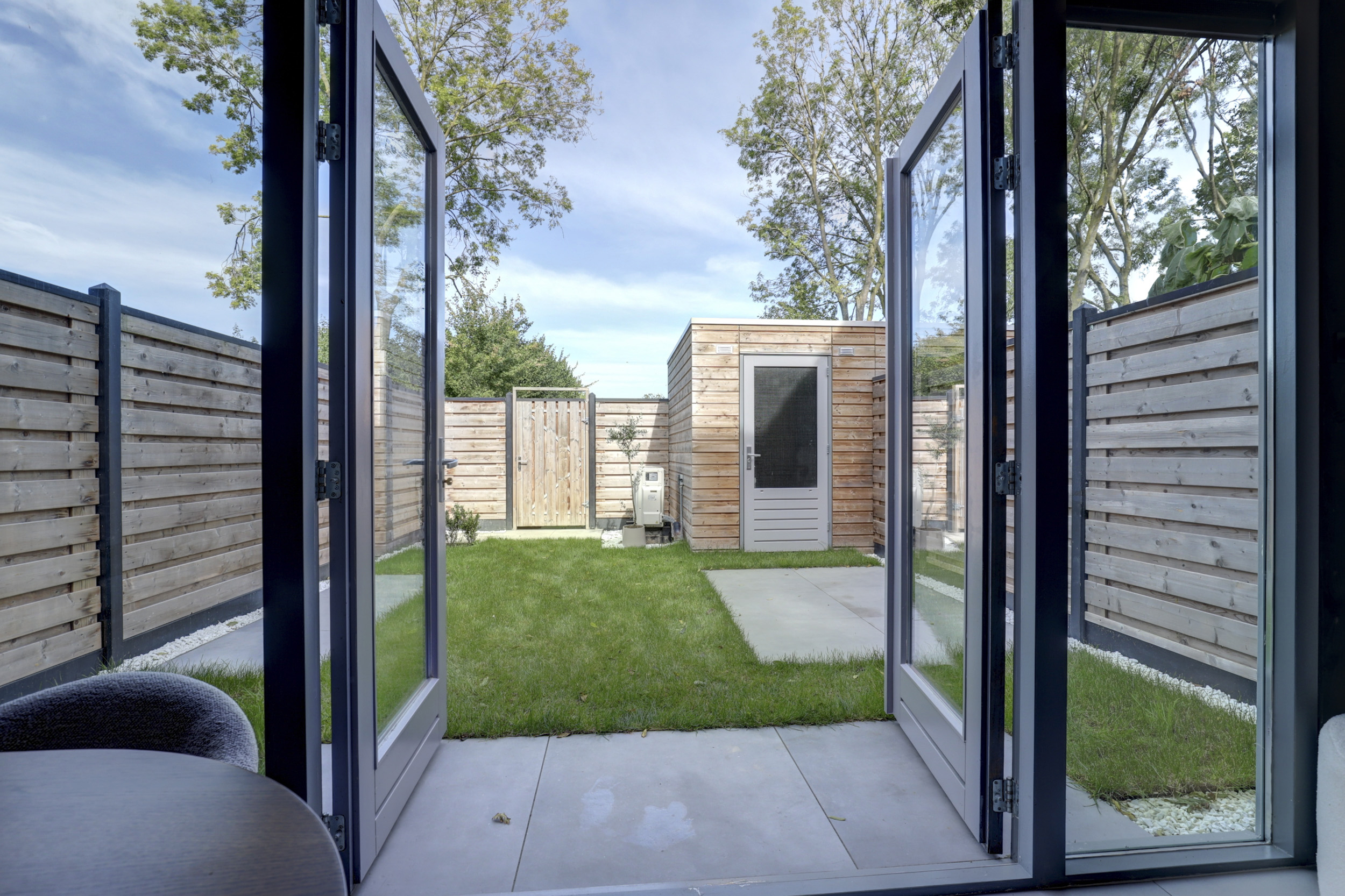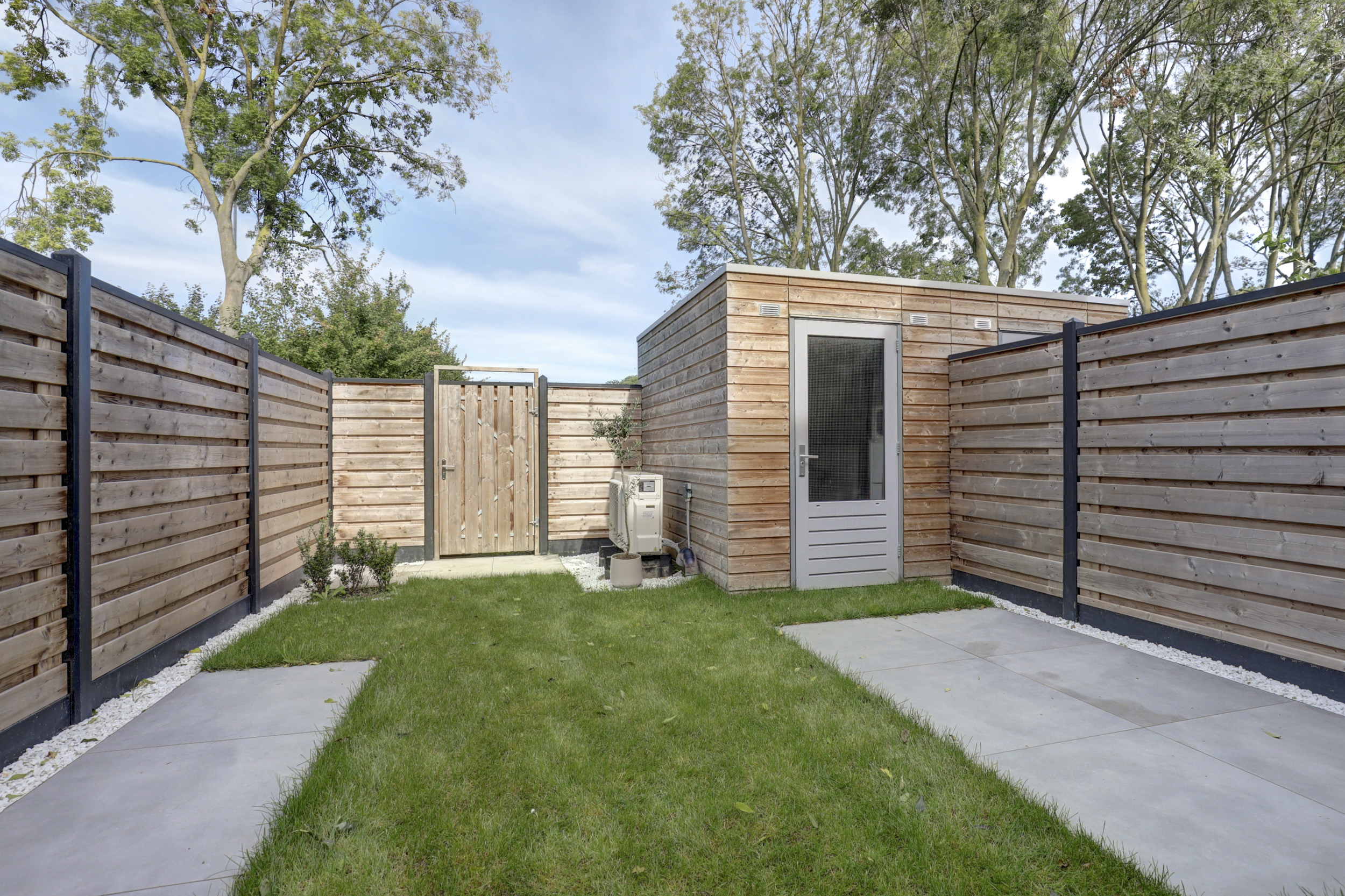 – Achtertuin met achterom en houten berging met elektra