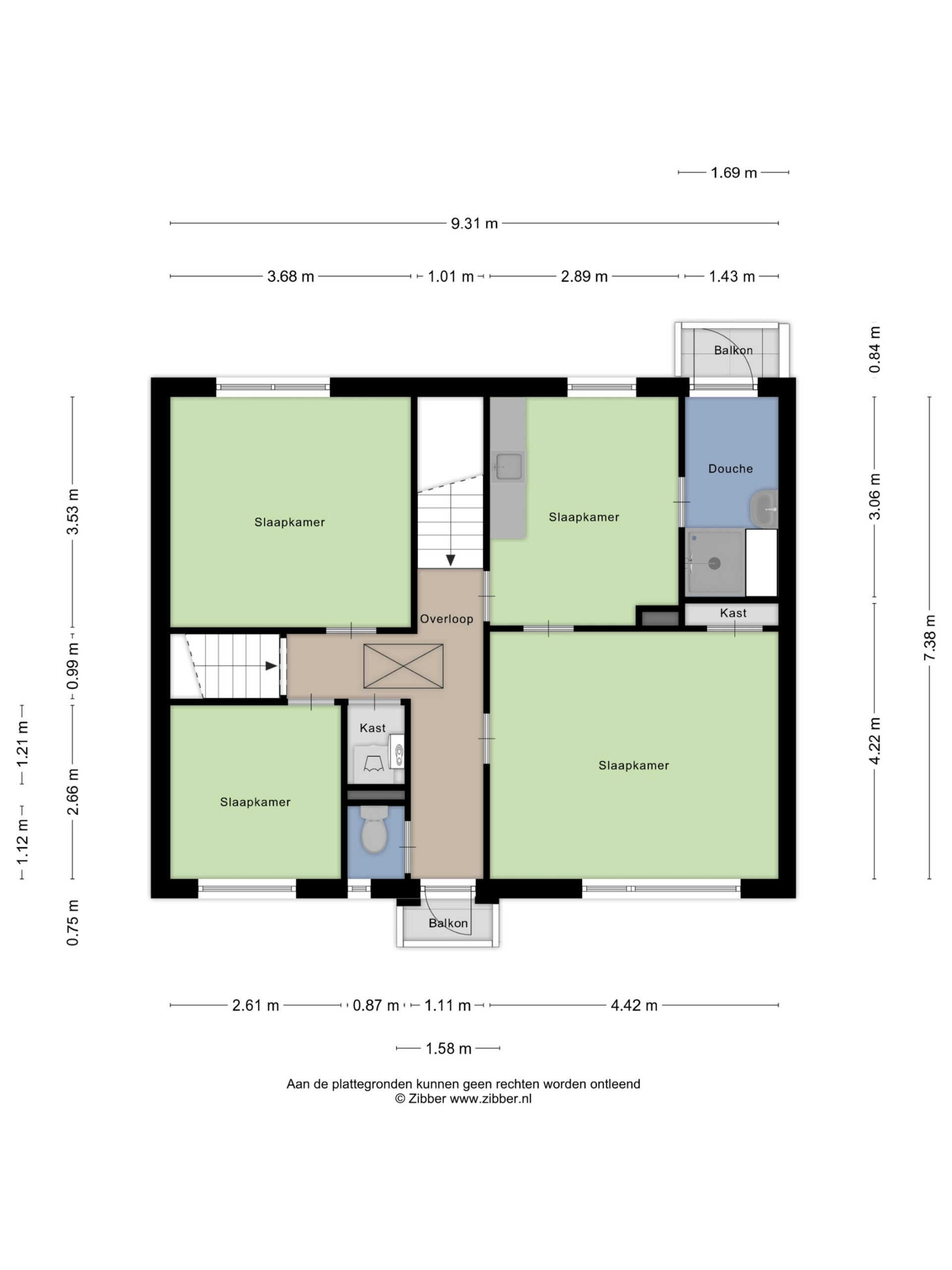 Gang met toiletruimte, aan voorzijde een balkonnetje op de avondzon, cv.kast en tevens is hier de wasmachineaansluiting gesitueerd, toegang tot 4 slaapkamers waarvan één met origineel keukenblokje en aansluitend de eenvoudige badkamer met douche, wastafel en balkonnetje aan de achterzijde met ochtendzon. Trapafgang naar de begane grond en achteruitgang aan de Wulpstraat (=voormalige entree bovenwoning)