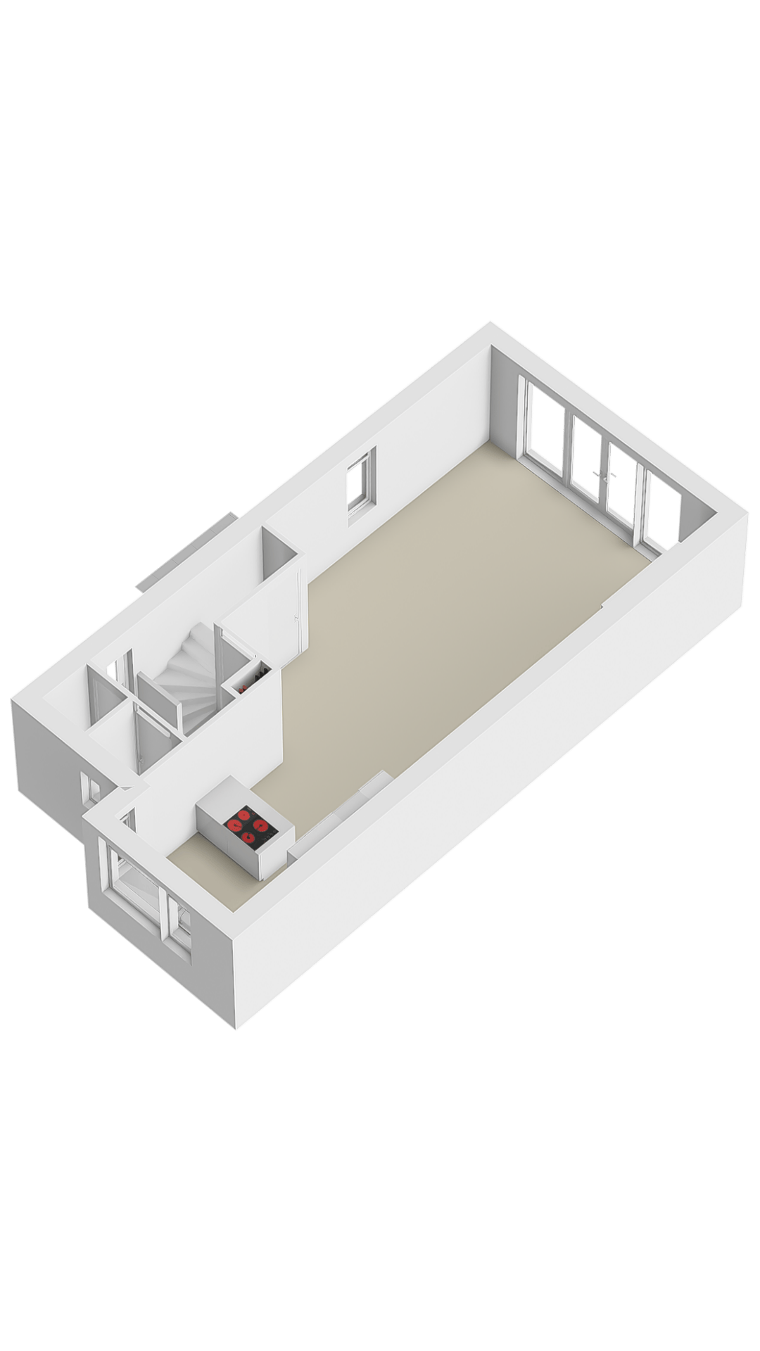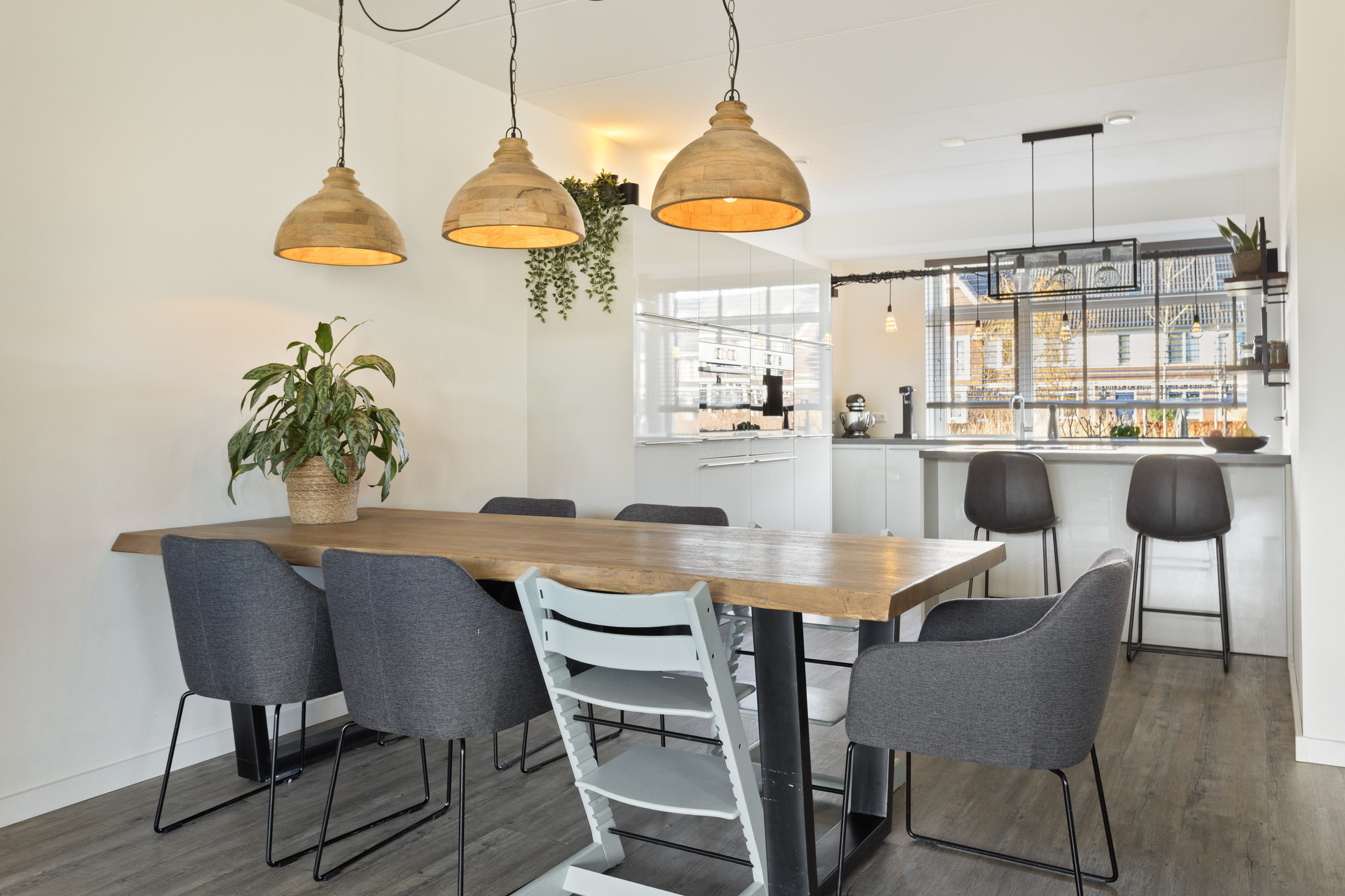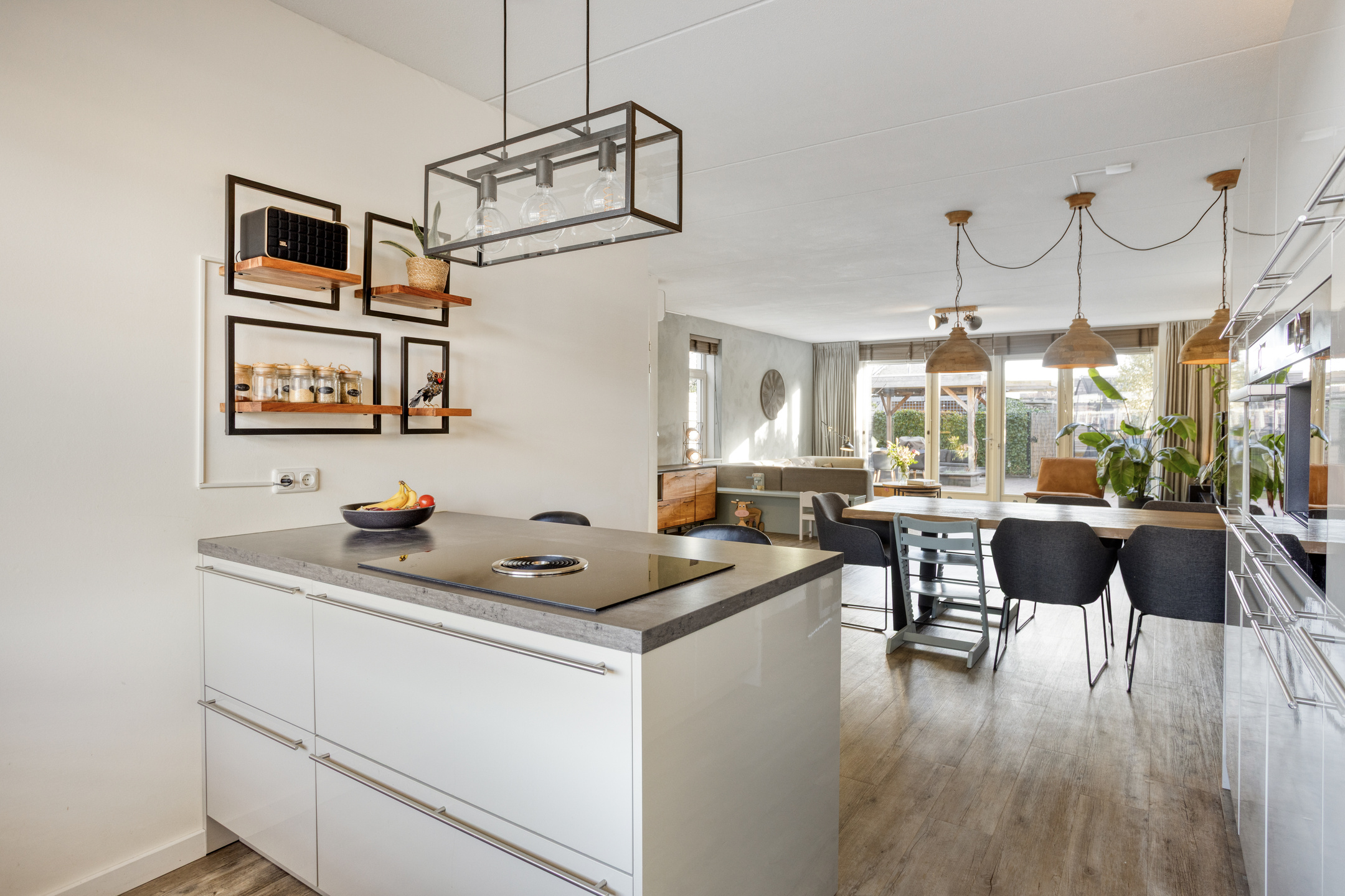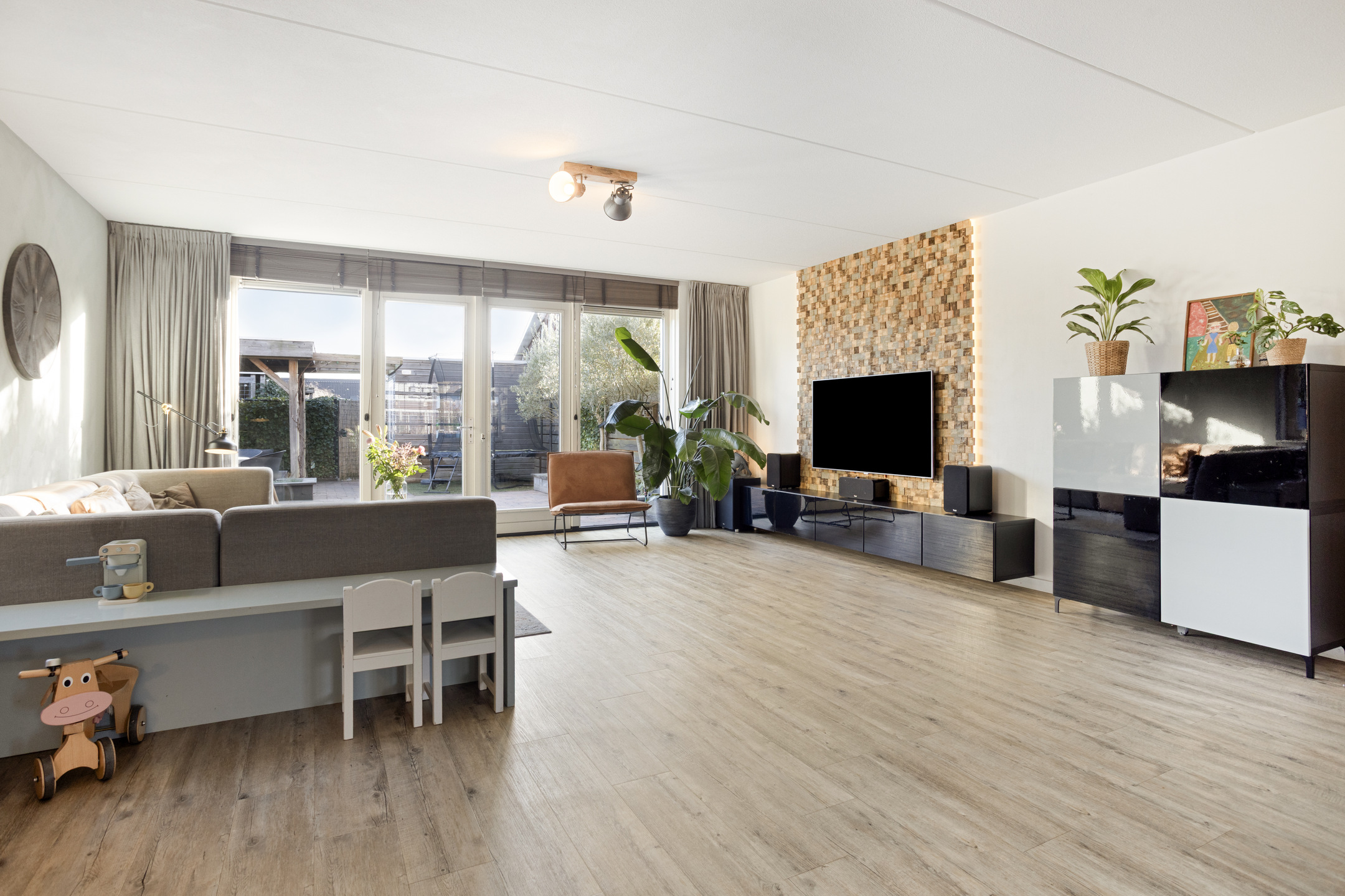 Aan de achterzijde bevindt zich de woonkamer, die dankzij een uitbouw van 2,40 meter en een extra zijraam opvallend licht en ruimtelijk aanvoelt. Er is meer dan genoeg plek voor een grote eettafel en een comfortabele zithoek. Op mooie dagen zet je de openslaande deuren open en betrek je de tuin direct bij de woning. Praktisch is de ruime trapkast in de woonkamer voor extra bergruimte en de verdeler voor de vloerverwarming. De gehele begane grond is voorzien van een comfortabele pvc-vloer met vloerverwarming.