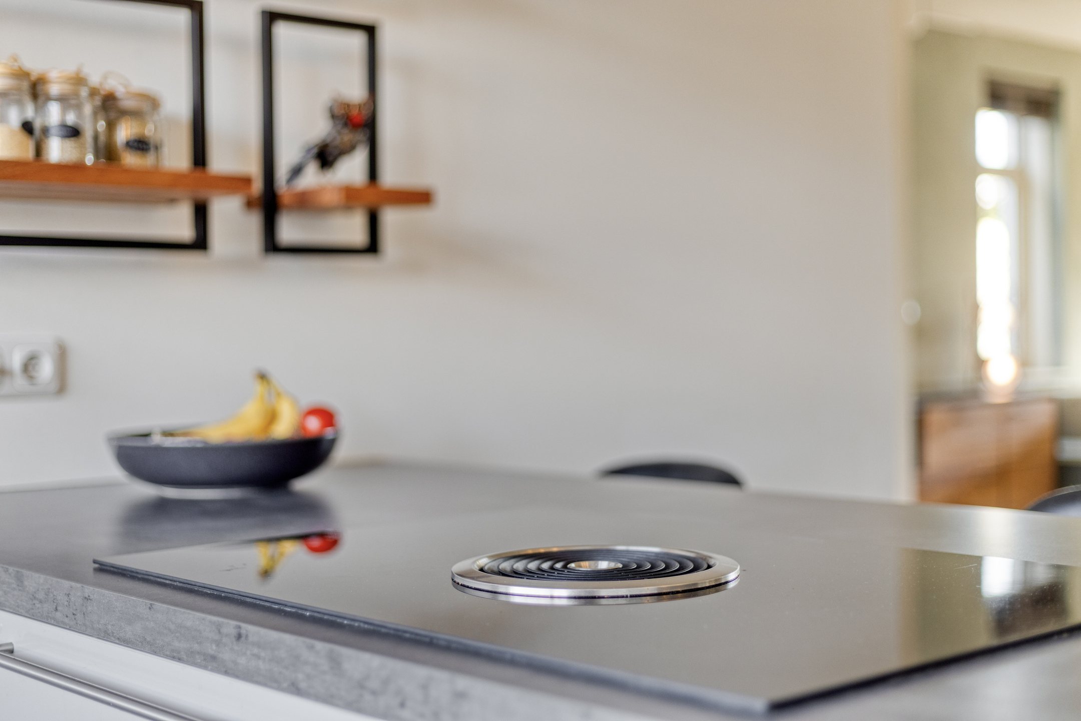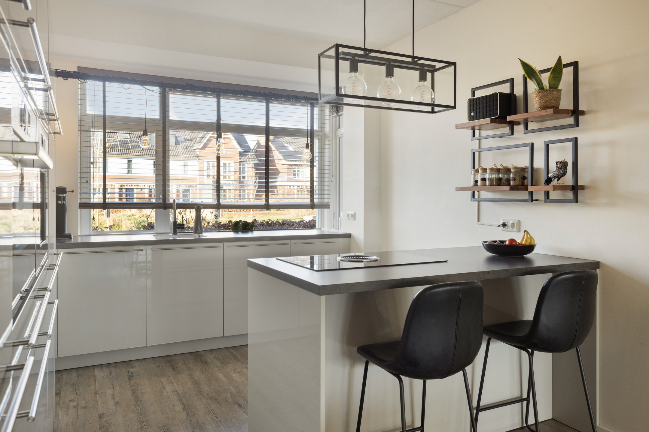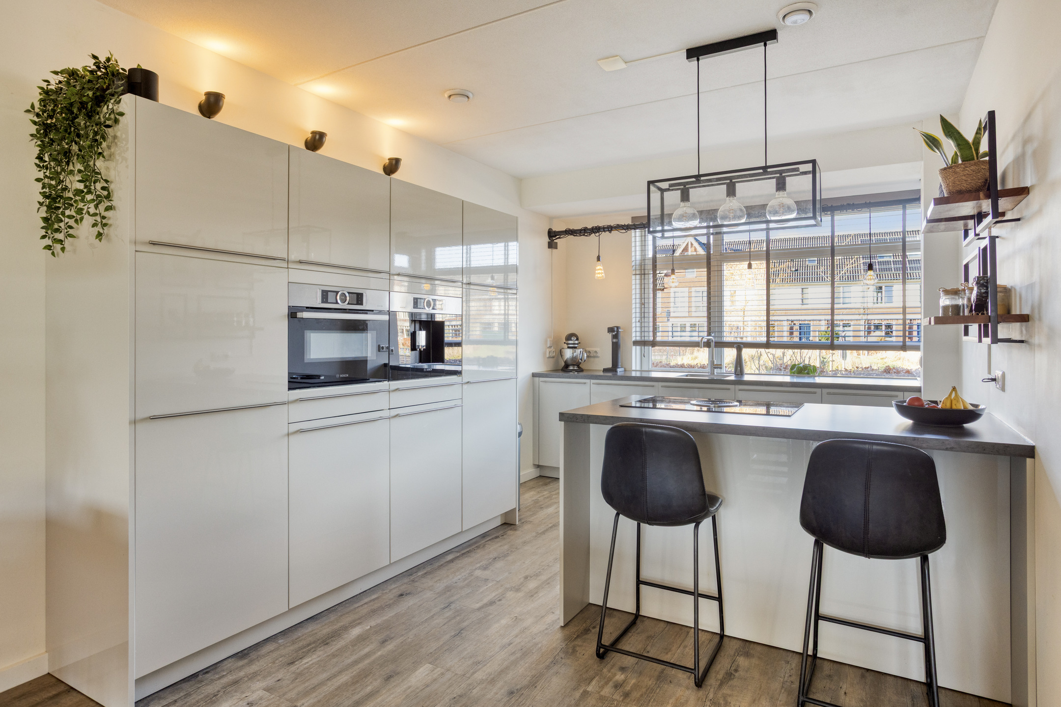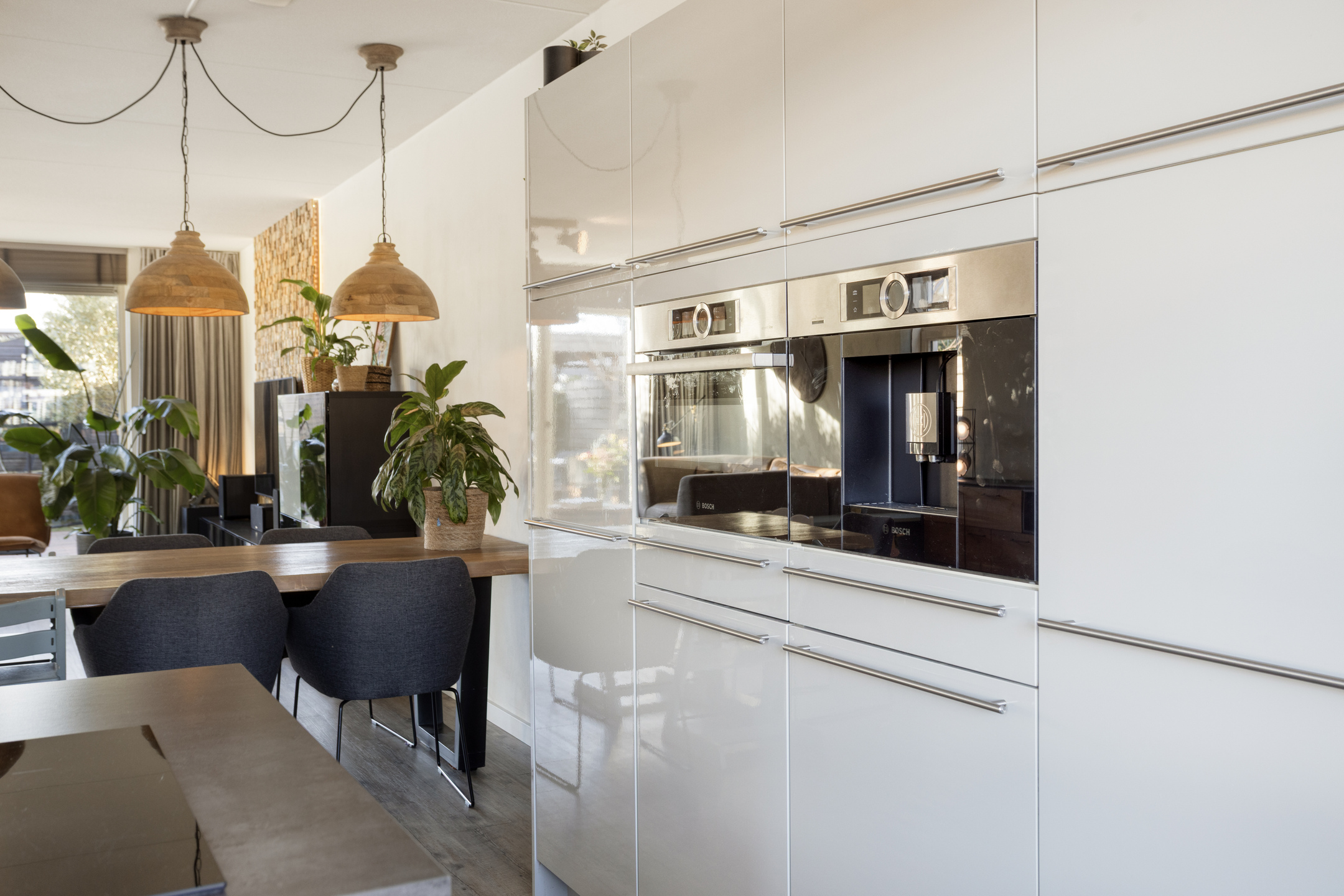 De begane grond is ingericht als een royale leefruimte waar koken, eten en ontspannen in elkaar overlopen. In de hal vind je de meterkast, het toilet en de trapopgang. De blikvanger aan de voorzijde van de woning is de luxe open keuken met schiereiland. Terwijl je hier kookt kijk je vrij uit over het groen. Het park voor de deur voelt als een verlengstuk van je eigen voortuin: een veilige speelplek voor kinderen of gewoon een heerlijk groen uitzicht. De keuken is compleet uitgerust met Bosch inbouwapparatuur, zoals een ingebouwde koffiemachine en met een Bora inductiekookplaat.