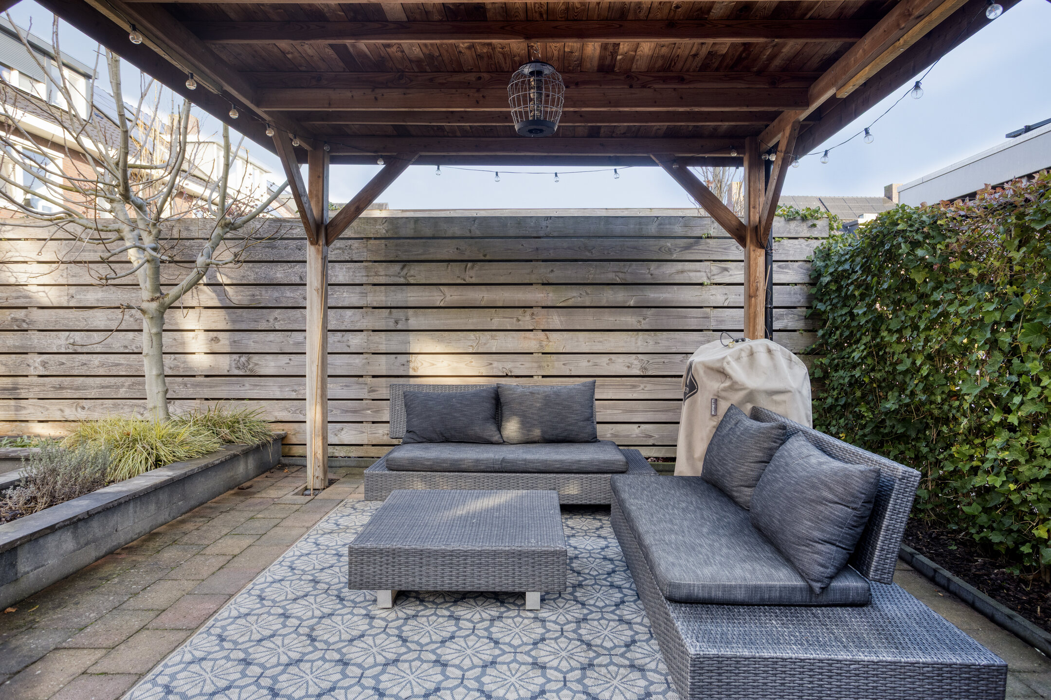 Het buitenleven begint in je eigen fraai aangelegde achtertuin (ca. 80 m2) op het zuidoosten. Hier geniet je al vroeg in het jaar van de zon, zeker onder de sfeervolle overkapping die ruimte biedt voor een royale loungehoek. Achterin staat de houten berging en er is een praktische achterom.