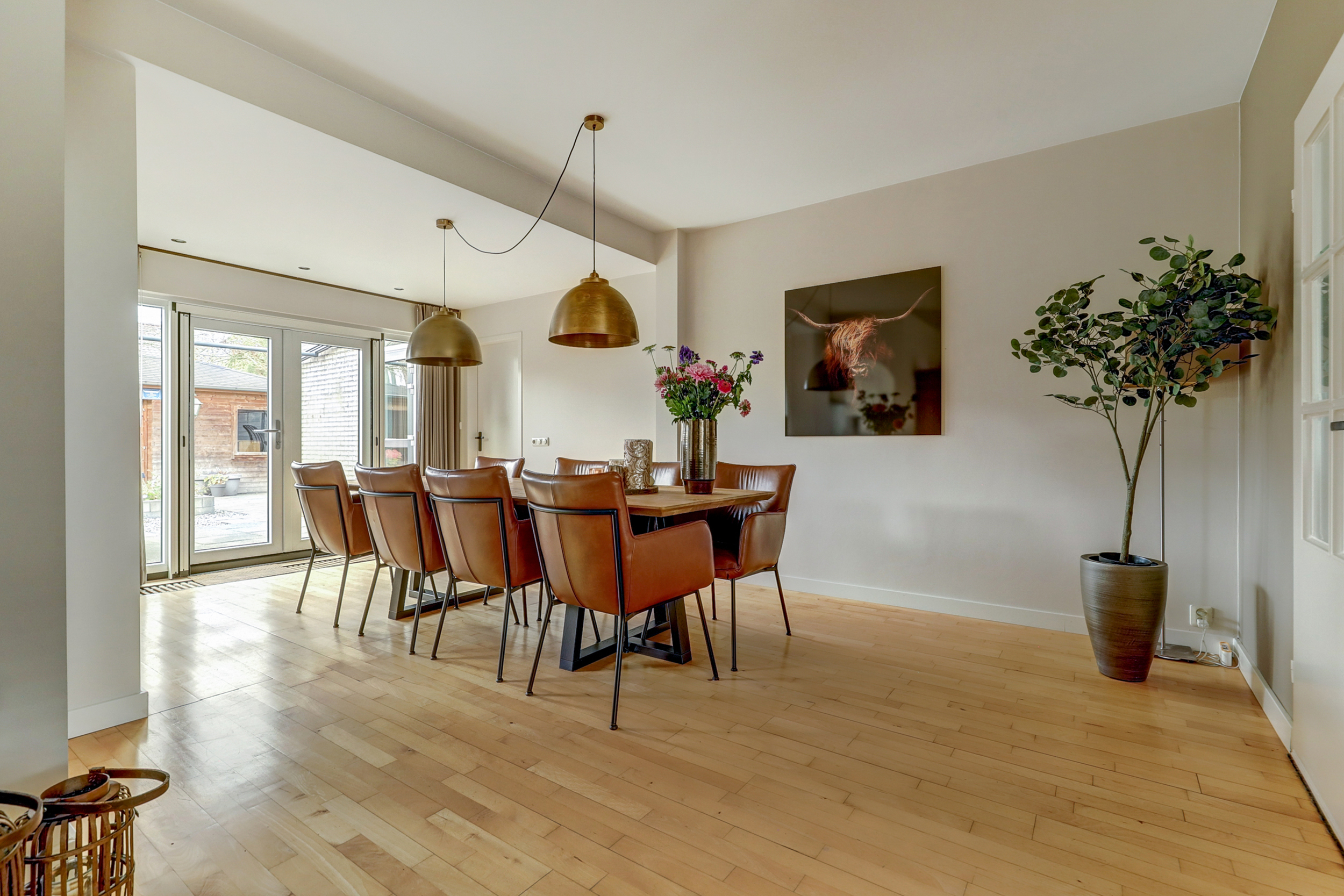 Je komt binnen via de entree en hal met een toiletruimte (2011) met vrij hangend toilet en fonteintje, plus een vernieuwde meterkast. De woonkamer voelt ruim en logisch ingedeeld, met een houten vloer en een uitgebouwde eetkamer aan de achterzijde. Die uitbouw geeft je precies wat je zoekt: extra leefruimte voor een grote eettafel, lange avonden tafelen en genoeg plek om te leven zonder dat het vol aanvoelt.