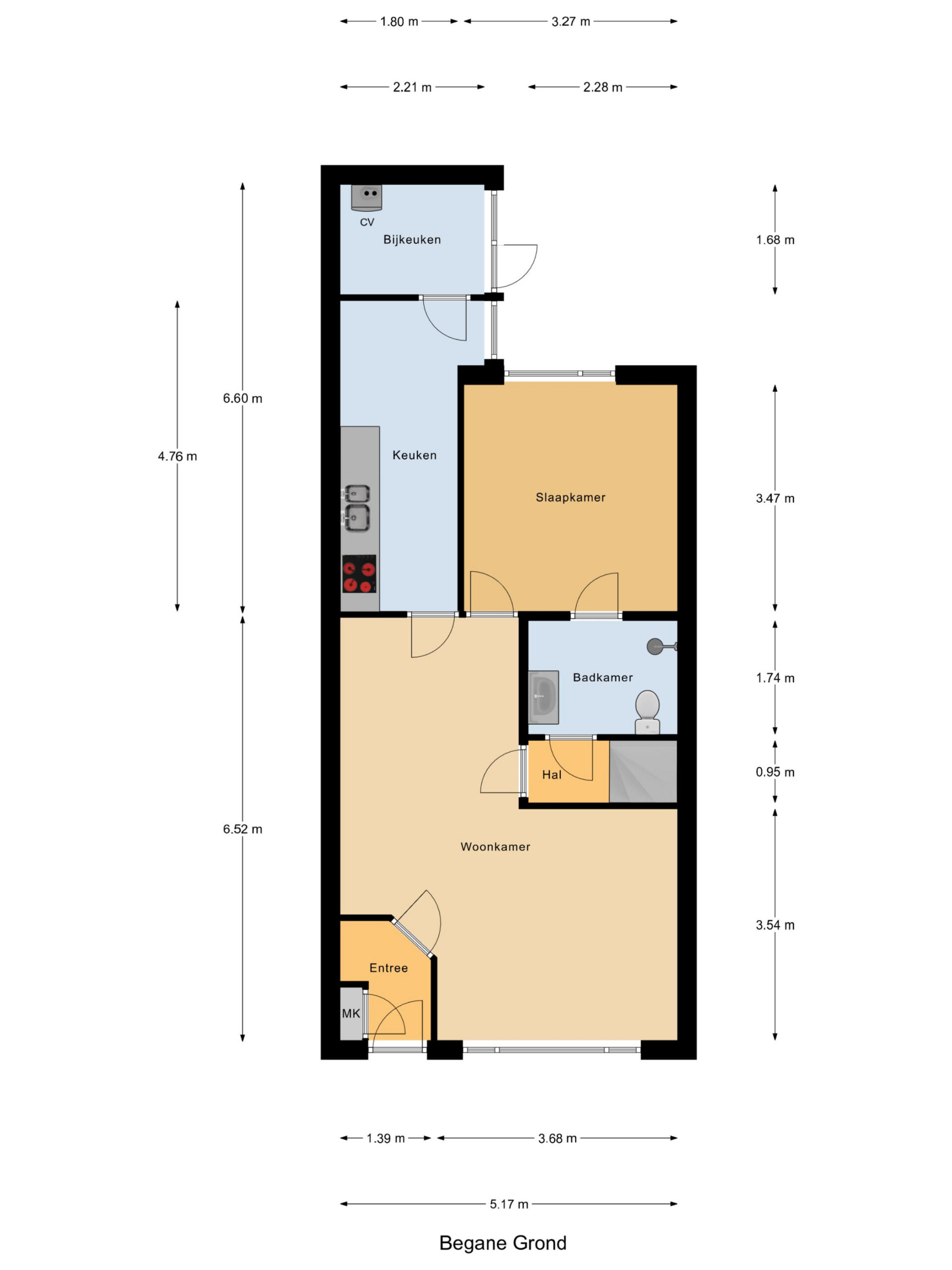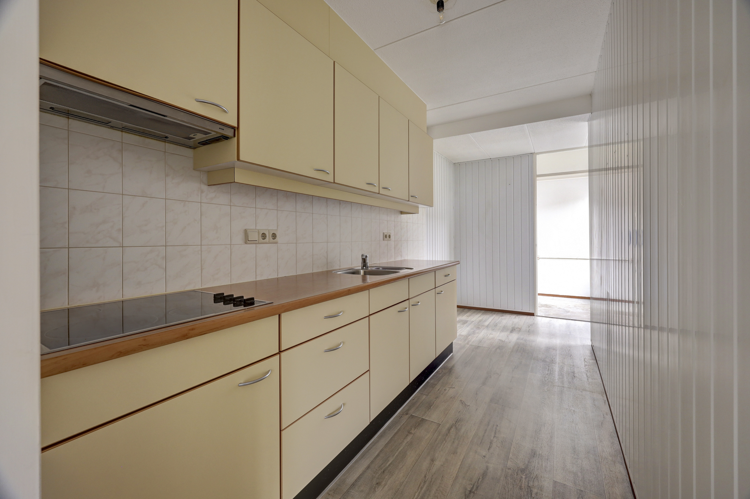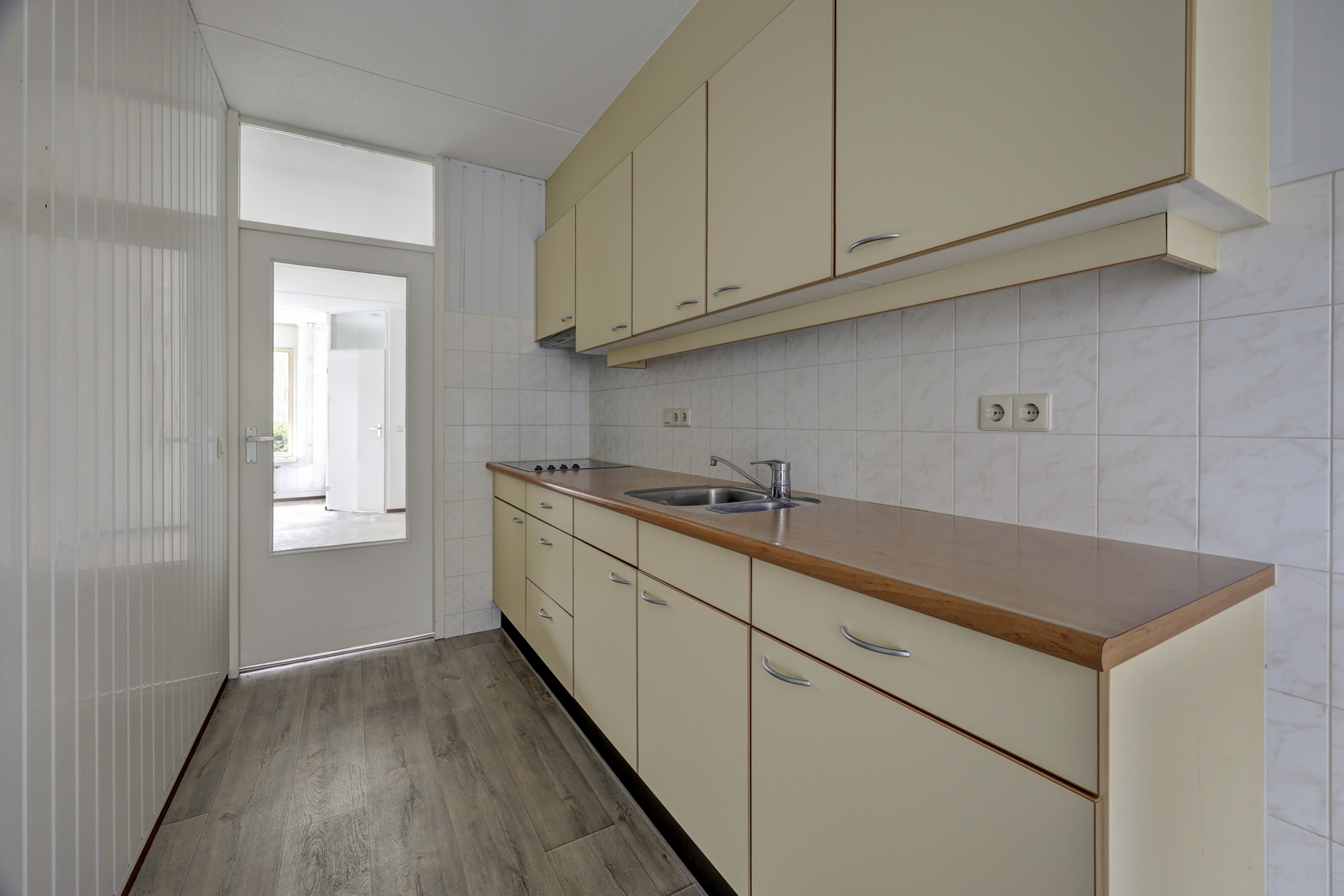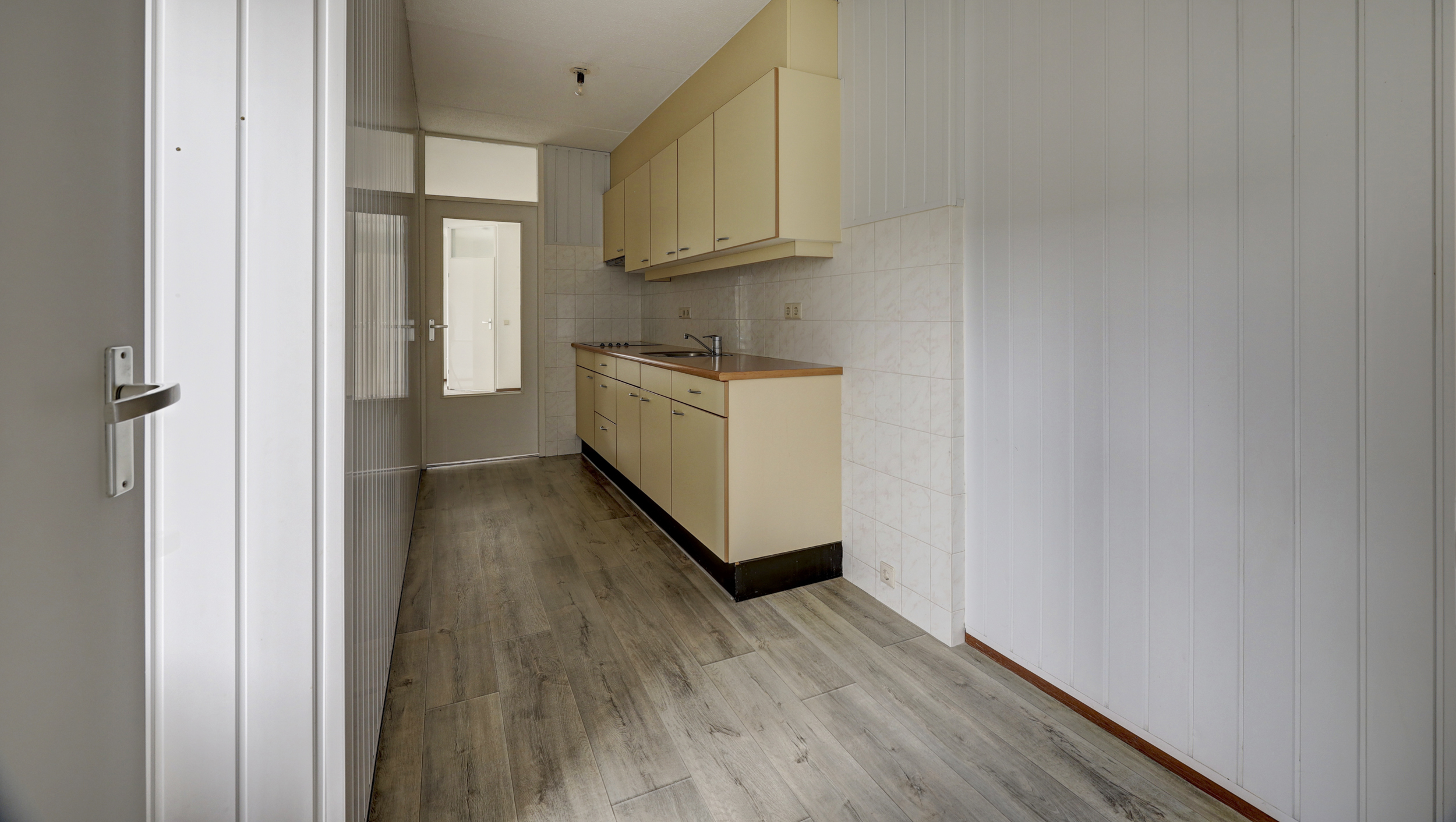 Via de hal met meterkast kom je de woning binnen. Aan de voorzijde bevindt zich de woonkamer, die dankzij de grote raampartij prettig licht en ruim aanvoelt. Aan de achterzijde ligt de dichte keuken in een praktische basisopstelling.