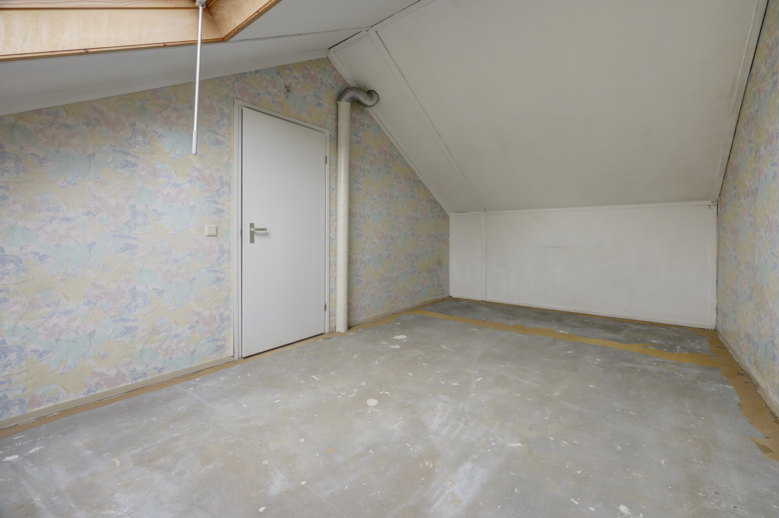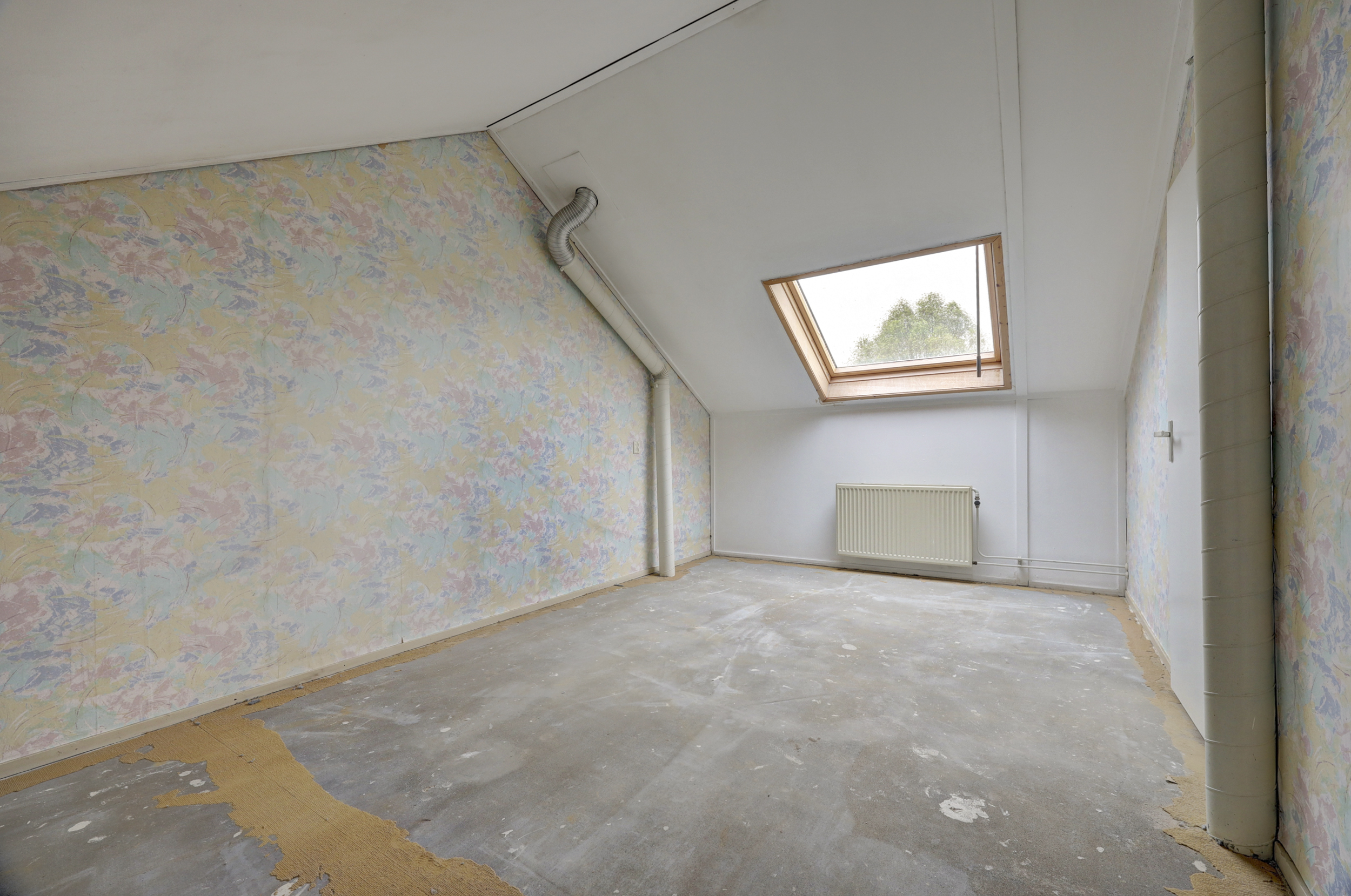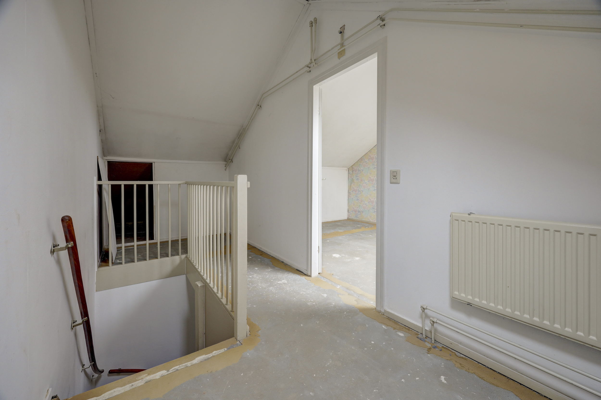 Eerste verdieping: overloop met een dakraam en bergruimte achter de knieschotten. Daarnaast bevindt zich op deze verdieping een ruime slaapkamer (circa 16 m2) met een groot dakraam en tevens bergruimte achter de schotten.