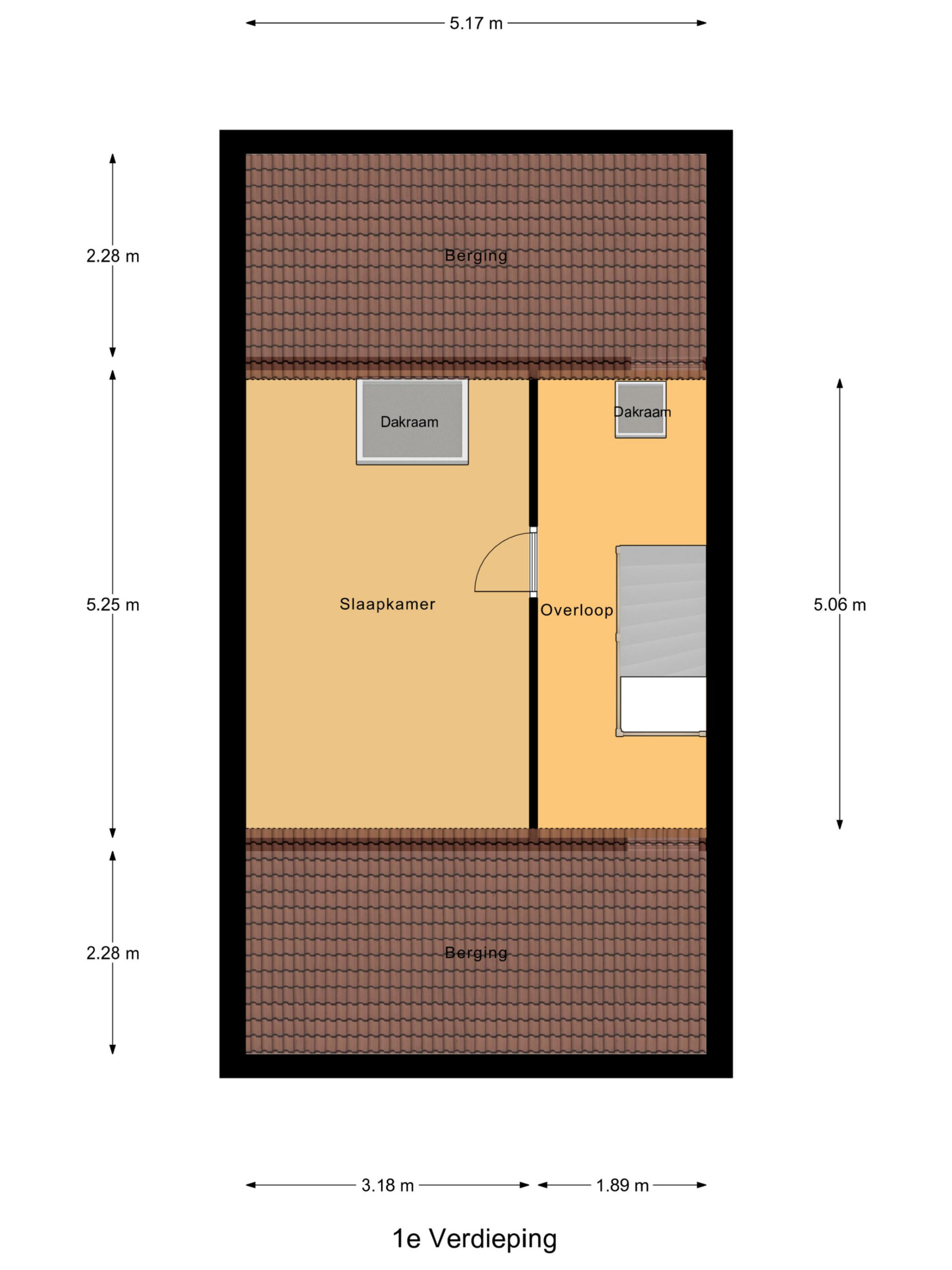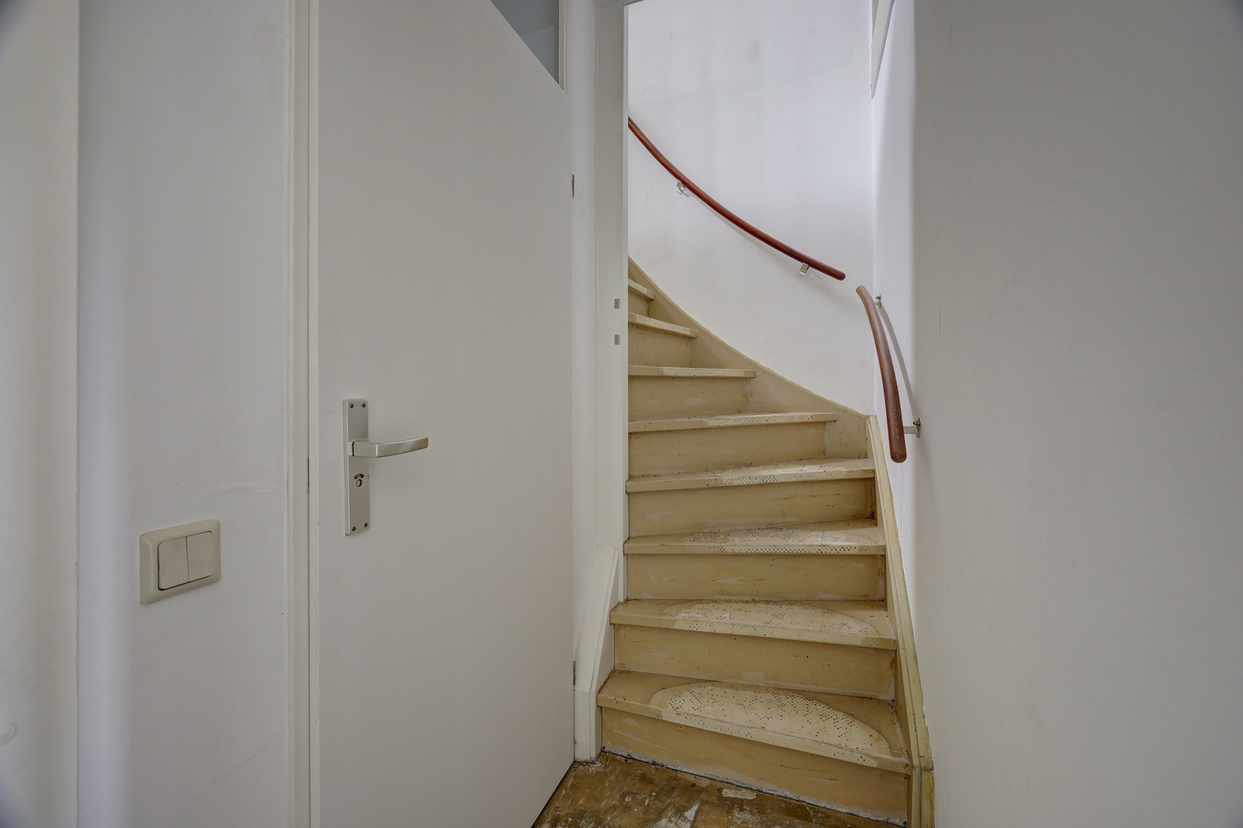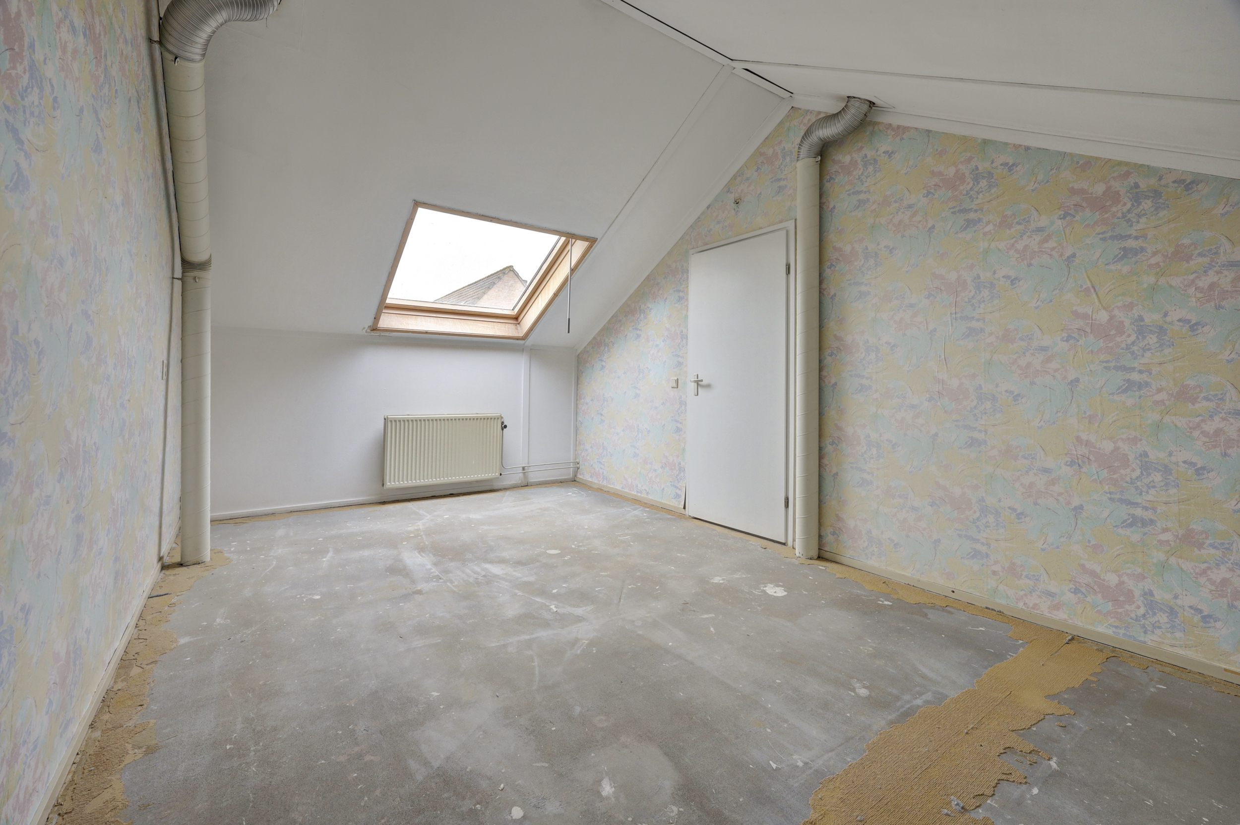 Eerste verdieping: overloop met een dakraam en bergruimte achter de knieschotten. Daarnaast bevindt zich op deze verdieping een ruime slaapkamer (circa 16 m2) met een groot dakraam en tevens bergruimte achter de schotten.
