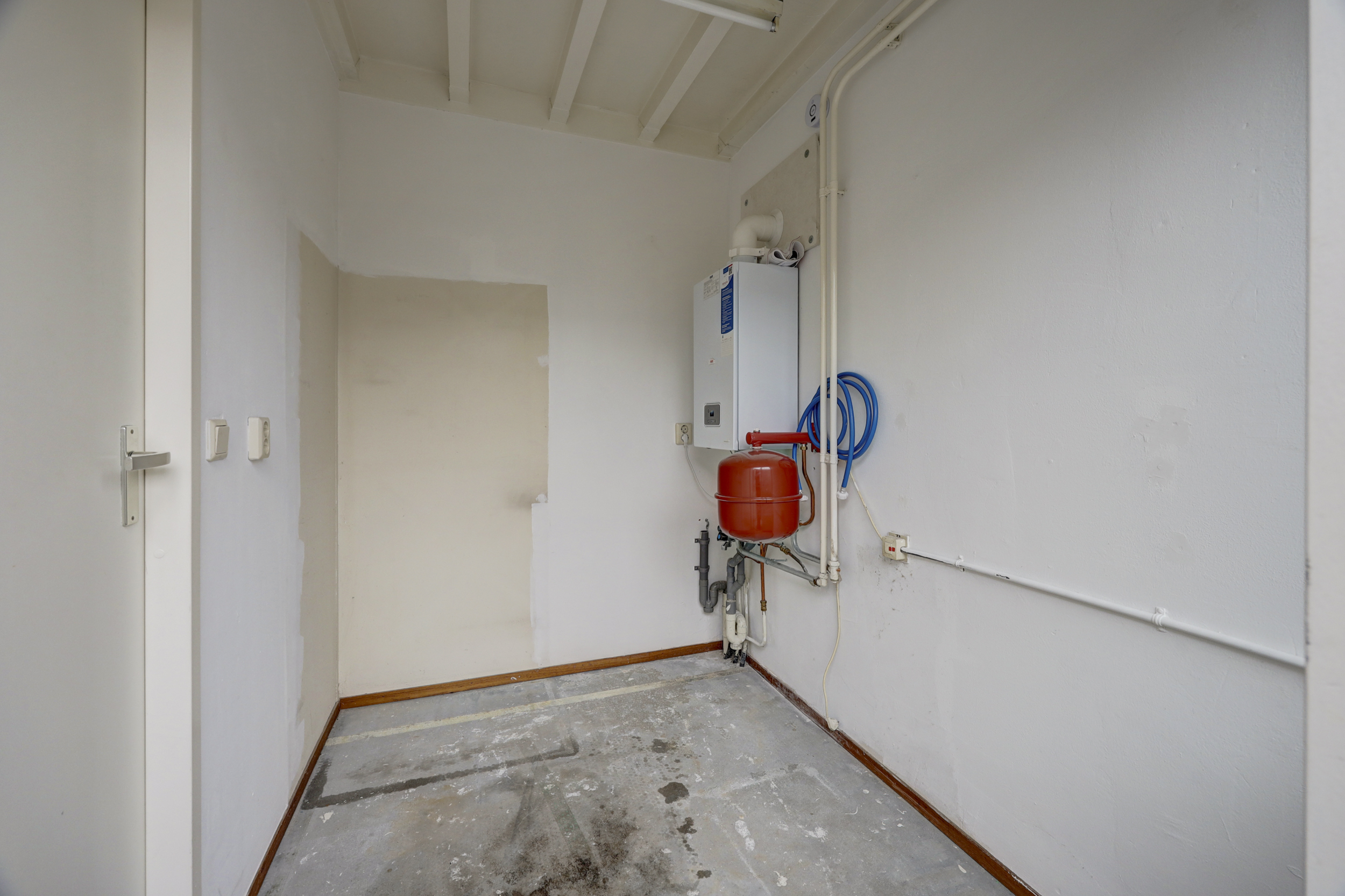 Aansluitend vind je de bijkeuken, waar de c.v.-ketel is geplaatst (AWB Thermomaster, 2024, eigendom). Vanuit hier heb je ook toegang tot de achtertuin.