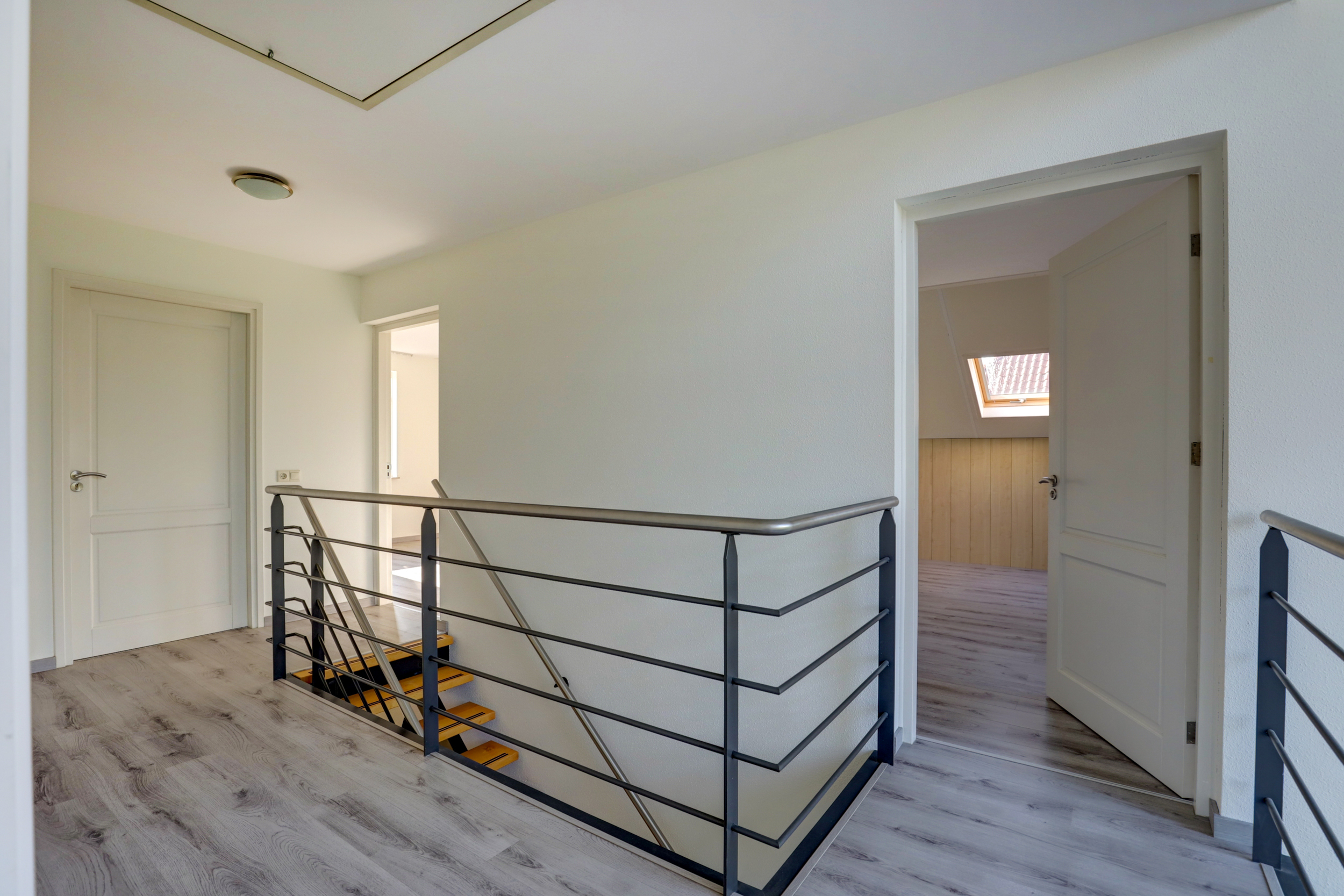 Via de mooie trapgang kom je op de vide die licht en ruimte uitstraalt door de afwerking en de hoogte. Vanuit de overloop zijn de 4 slaapkamers en de badkamer te bereiken. De 4 slaapkamers zijn ruim en voorzien van laminaatvloer met vloerverwarming, eigen thermostaat per kamer, kunststof draaikiepramen en deels knieschotten voor extra bergruimte en dakvensters. De badkamer heeft een inloopdouche, wandcloset, wastafelmeubel, designradiator, vloerverwarming en eigen thermostaat.