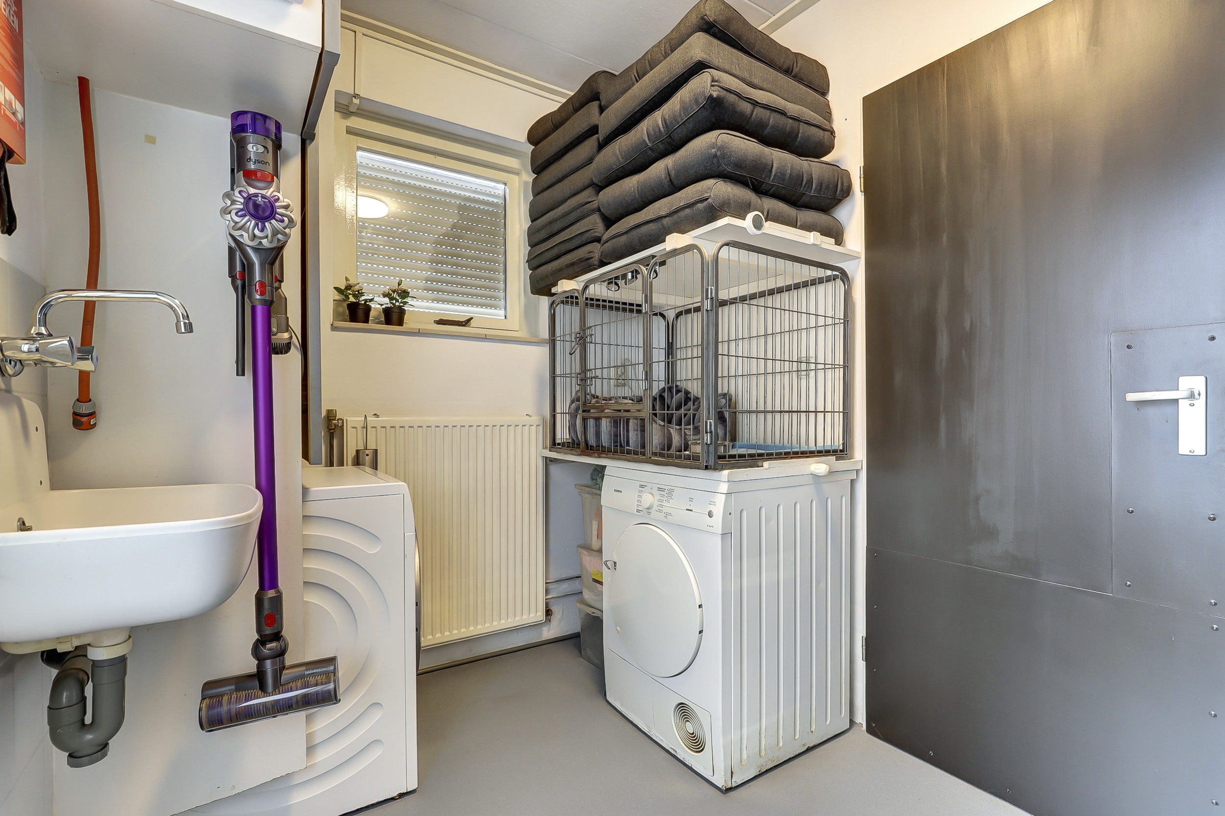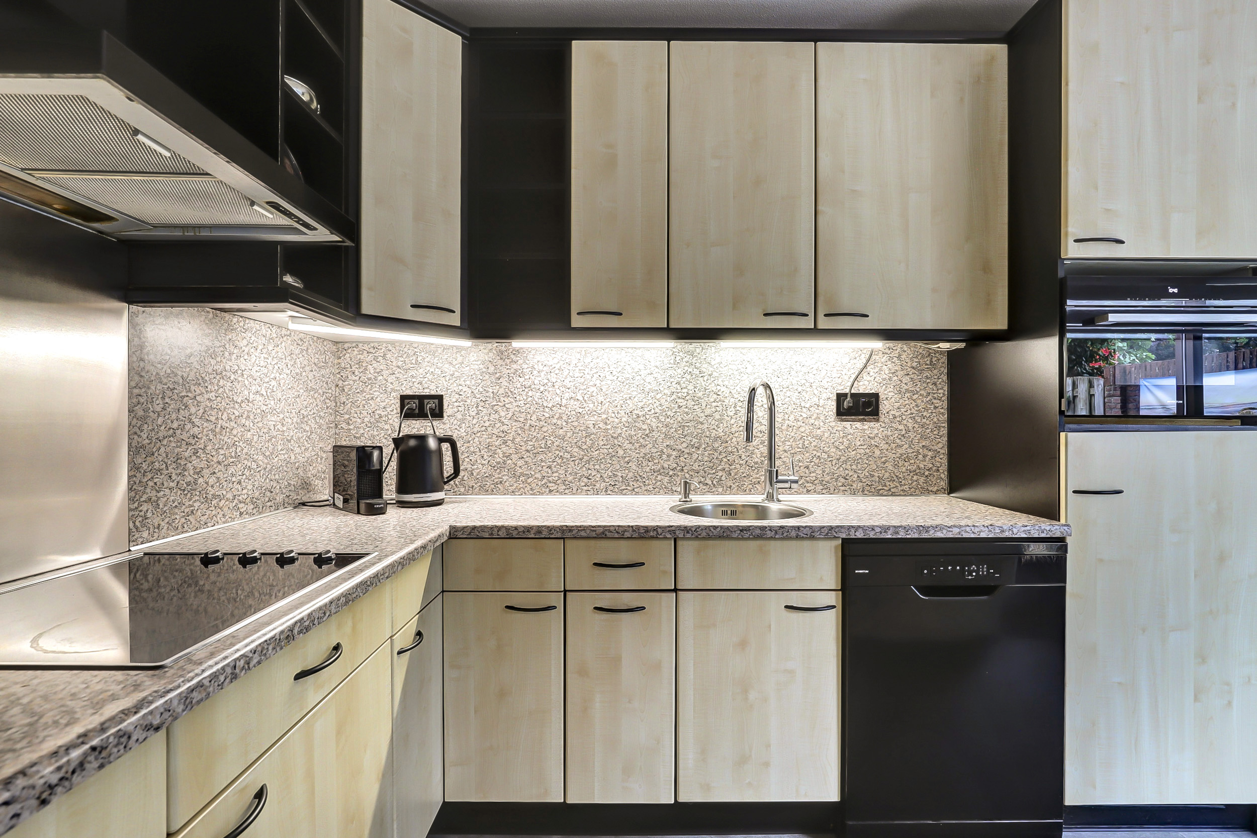 Aan de achterzijde bevindt zich de keuken (1995), die van alle gemakken is voorzien. Zo is er een koelkast (2020), een 4-pitsinductiekookplaat (1995), een combi-oven en een vaatwasser (2024) aanwezig. Aangrenzend aan de keuken vind je de bijkeuken met aansluitingen voor wasmachine en droger, en toegang tot zowel de ruime berging/garage als de zonnige achtertuin.