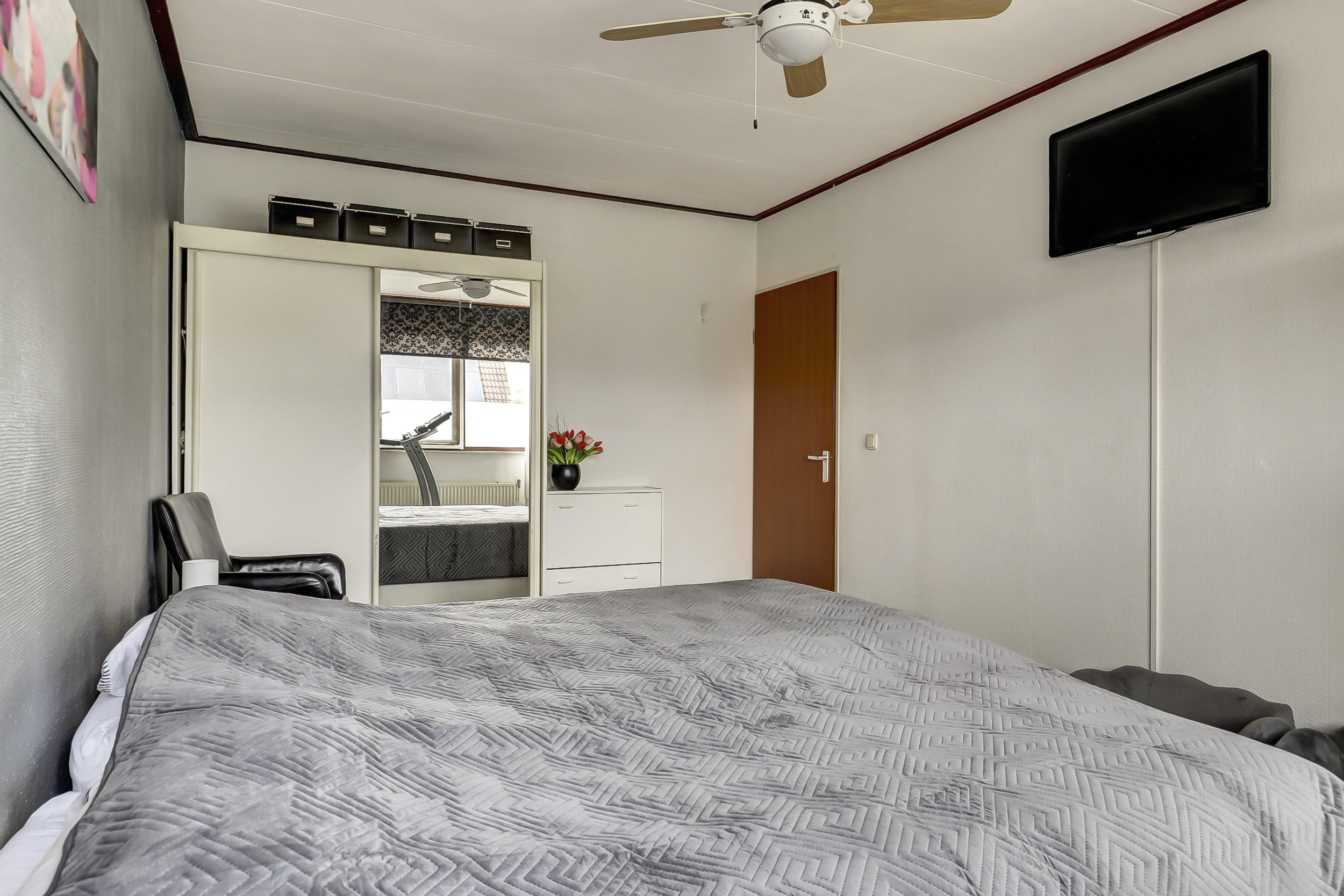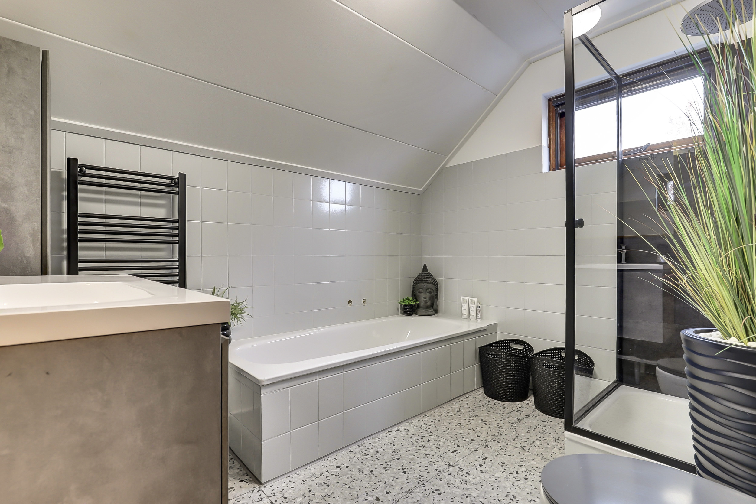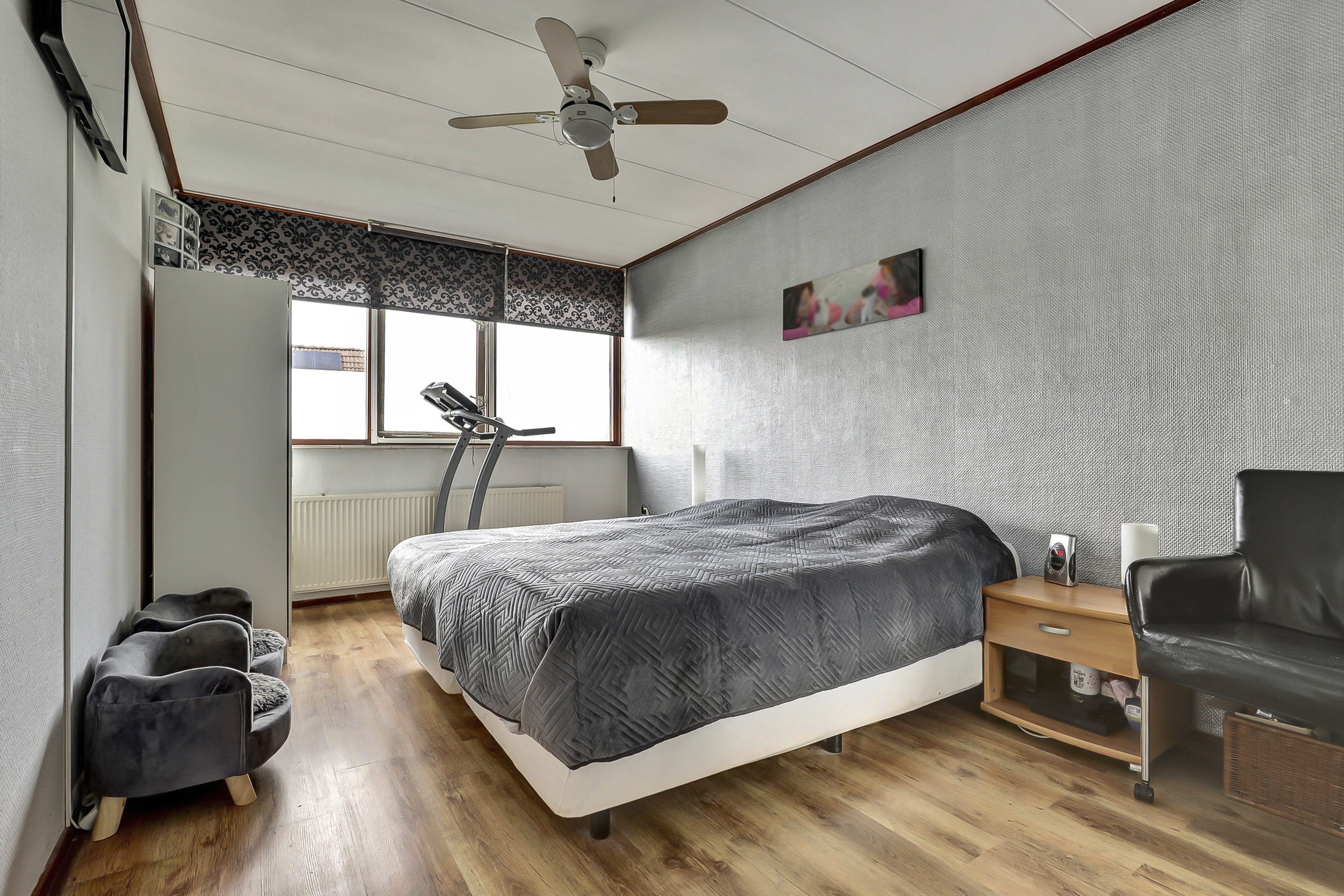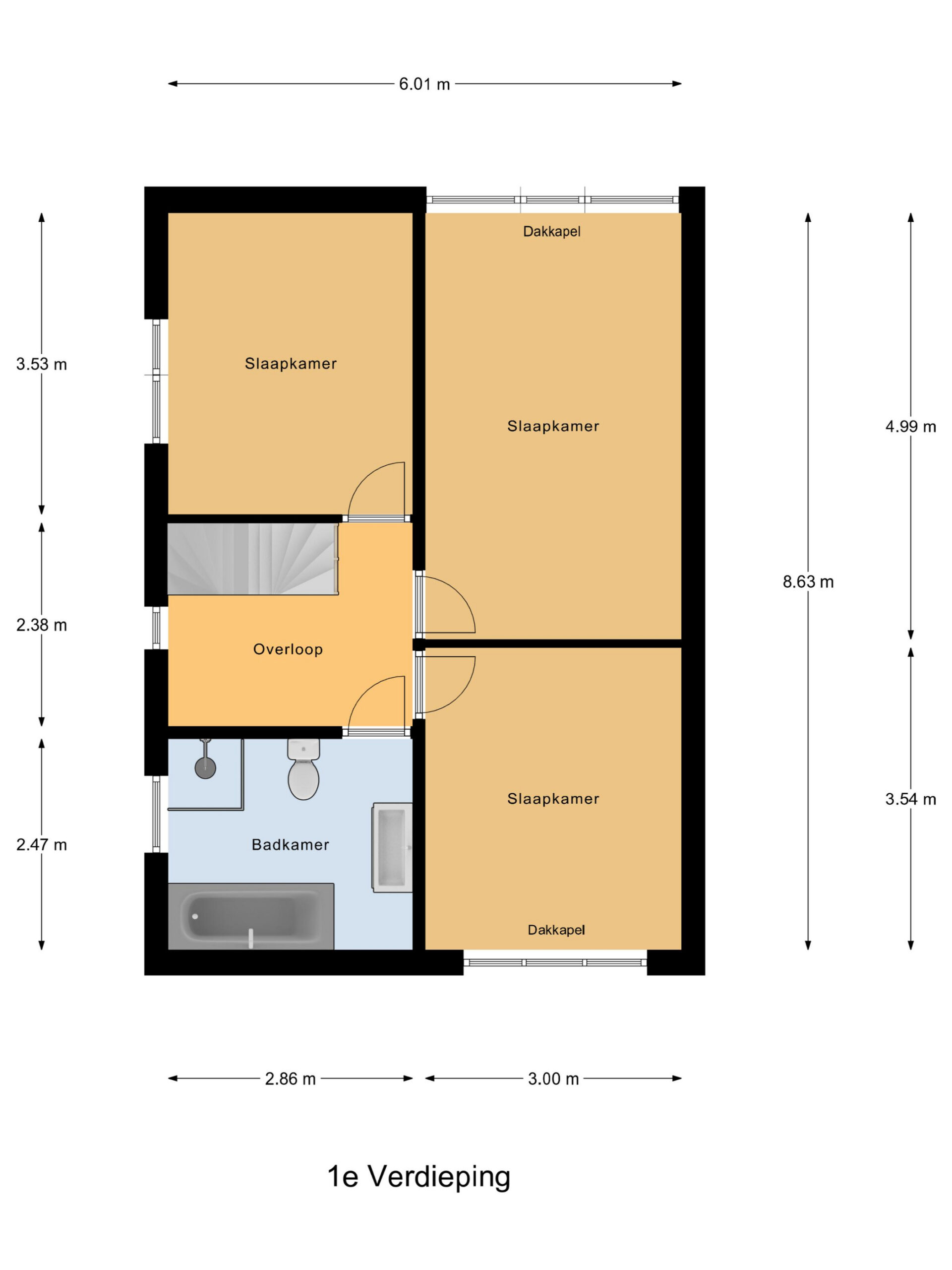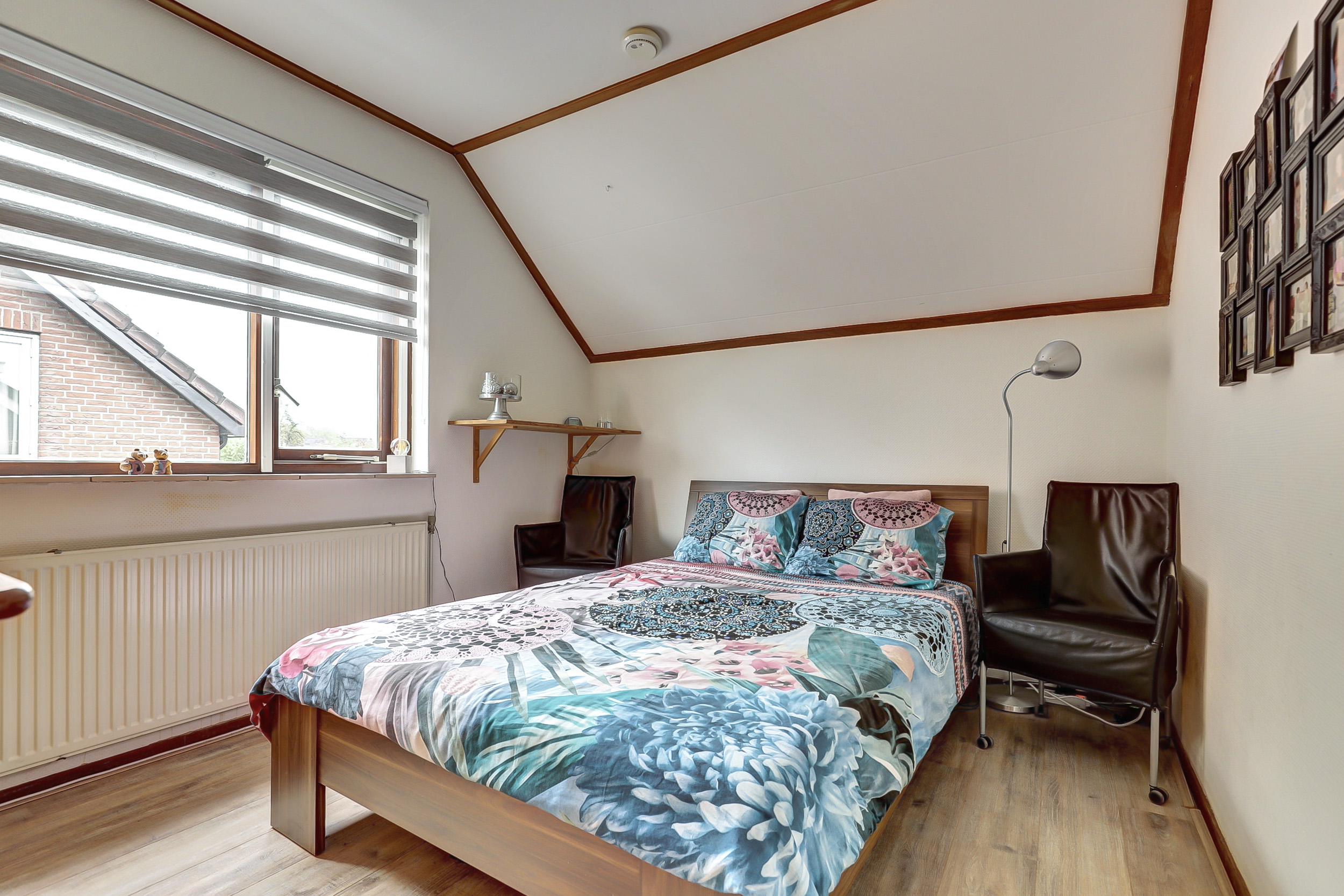 Op de eerste verdieping bevinden zich drie slaapkamers. Zowel aan de voorzijde als aan de achterzijde is er een dakkapel, wat zorgt voor extra ruimte en lichtinval. De zeer ruime badkamer, gedeeltelijk gerenoveerd in 2024, is voorzien van een douche, ligbad en een wastafel met meubel.
