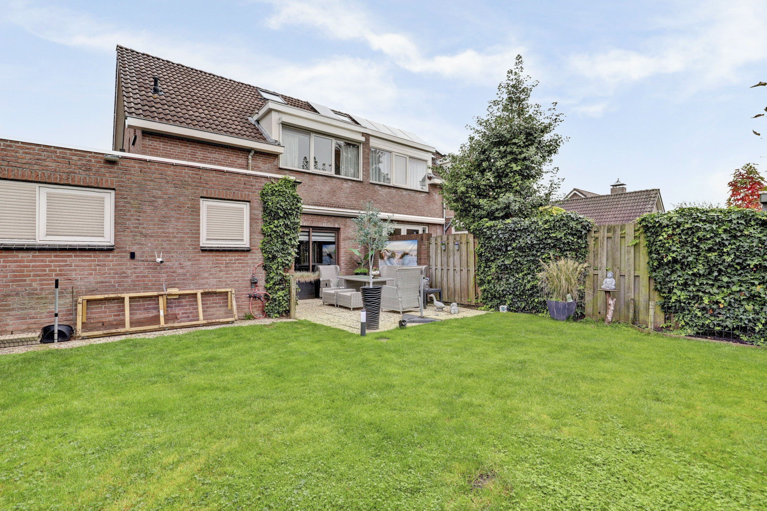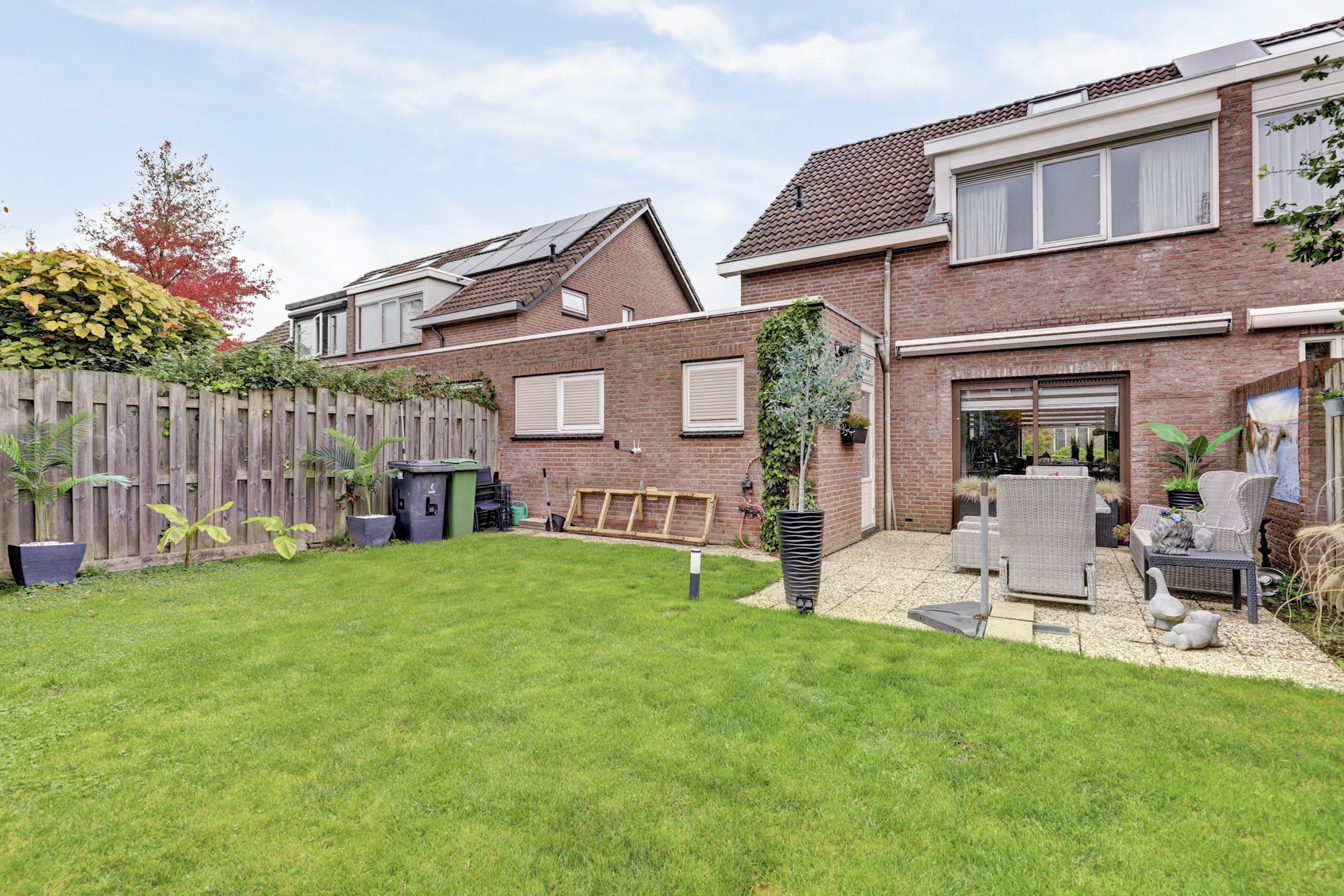 De woning beschikt over zowel een voortuin als een achtertuin. De voortuin biedt een eigen oprit met plek voor één of twee auto’s. De voordeur (en garage) is voorzien van een overkapping met automatische verlichting, waardoor je droog en veilig binnen komt. De achtertuin gelegen op het zuiden, is een heerlijke plek om te genieten van de zon en het buitenleven. De tuin is groot genoeg voor speeltoestellen, dus ideaal voor gezinnen met kinderen.