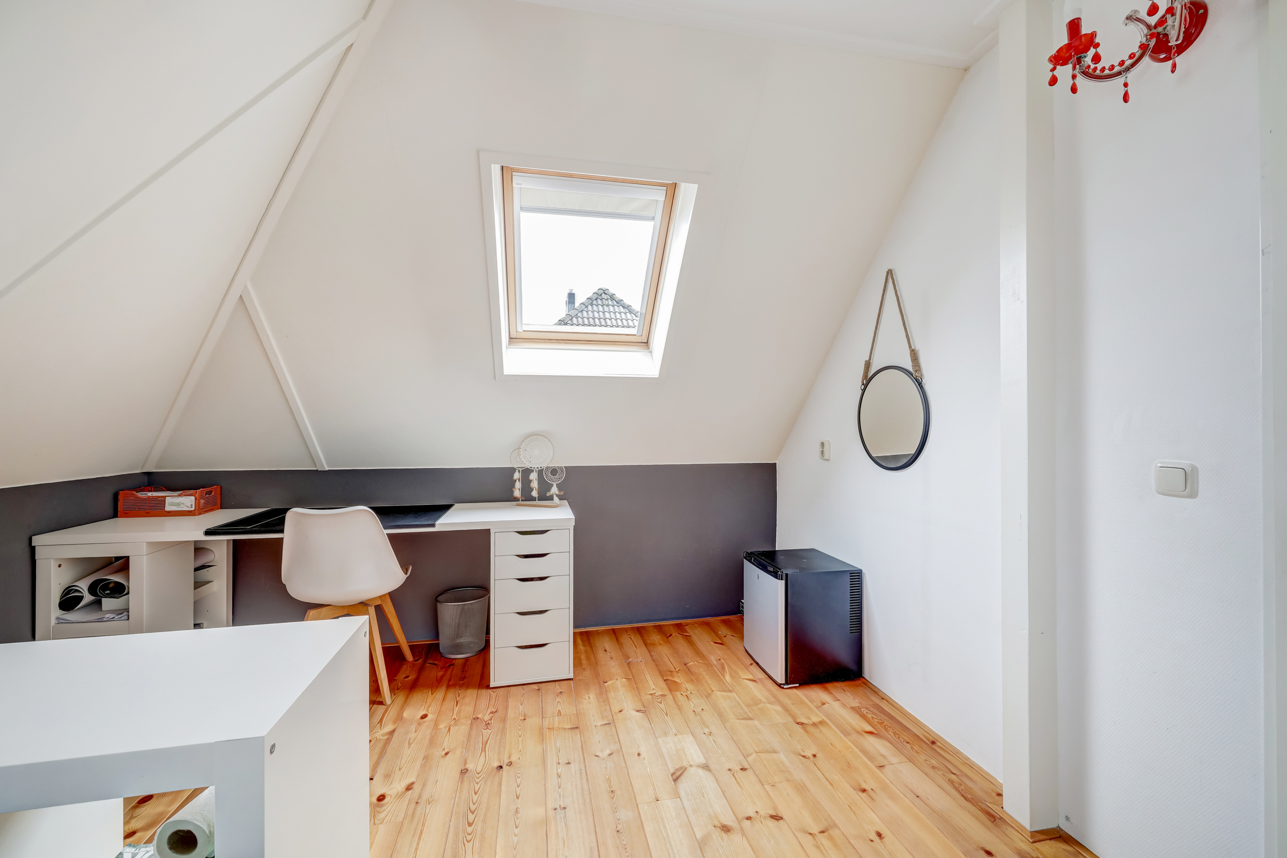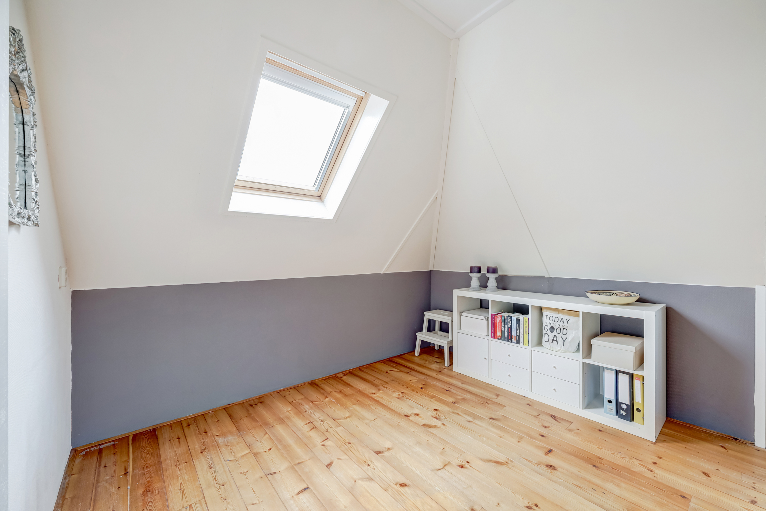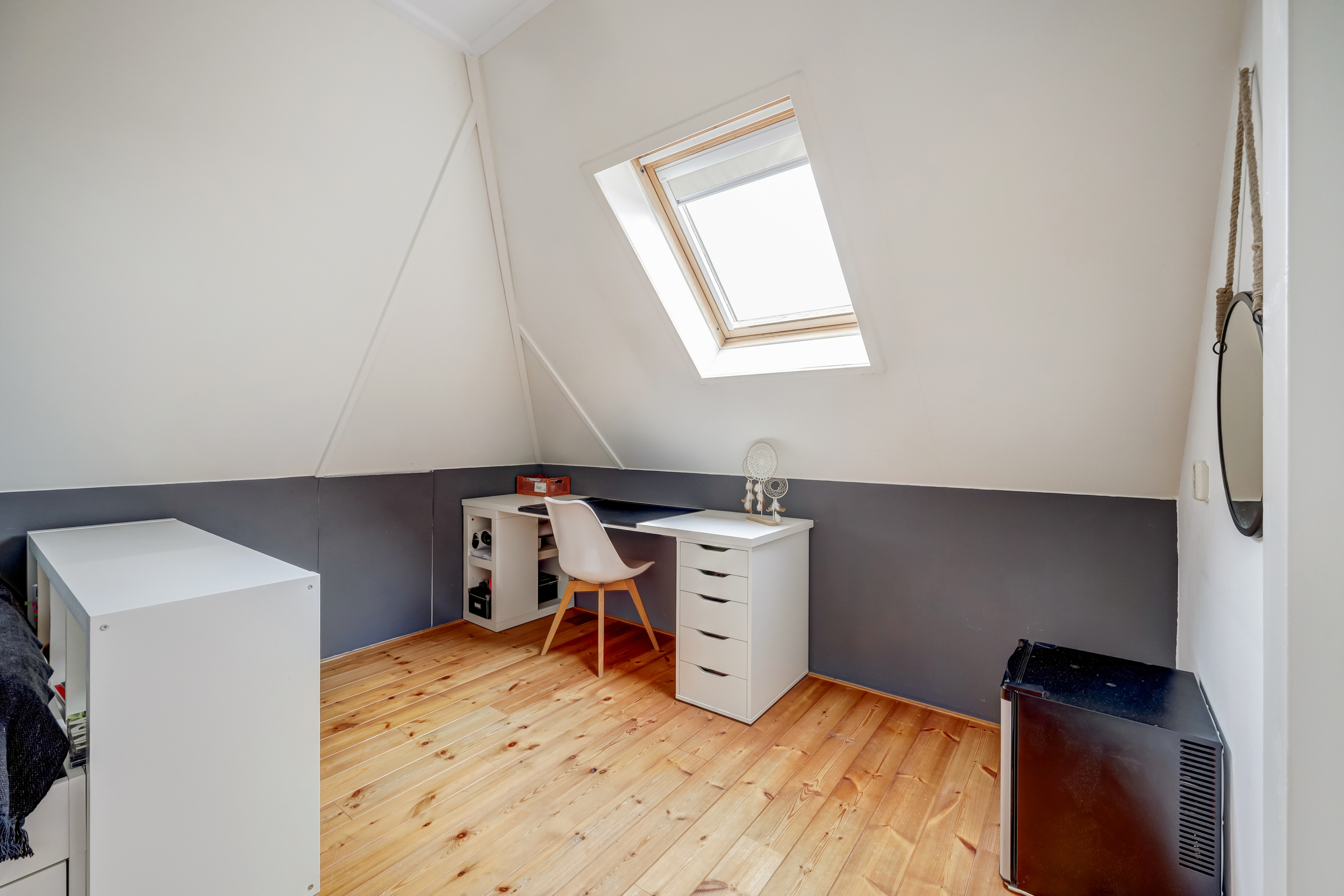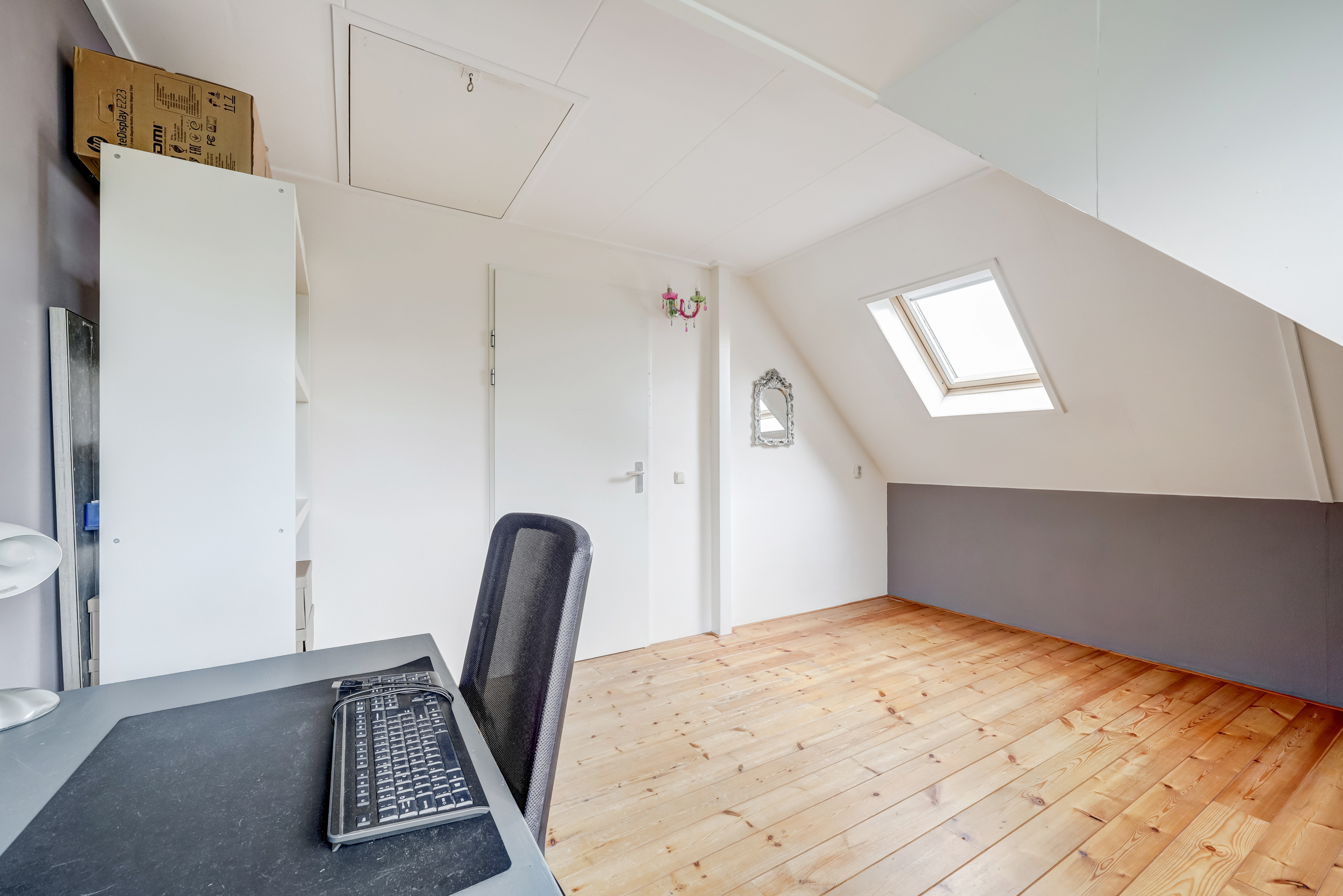 Hier bevinden zich nog twee ruime slaapkamers, beide voorzien van dakramen. De kamer aan de voorzijde beschikt over een vlizotrap naar een extra bergruimte. Op deze verdieping bevinden zich ook de CV-installatie en aansluitingen voor wasmachine en droger.