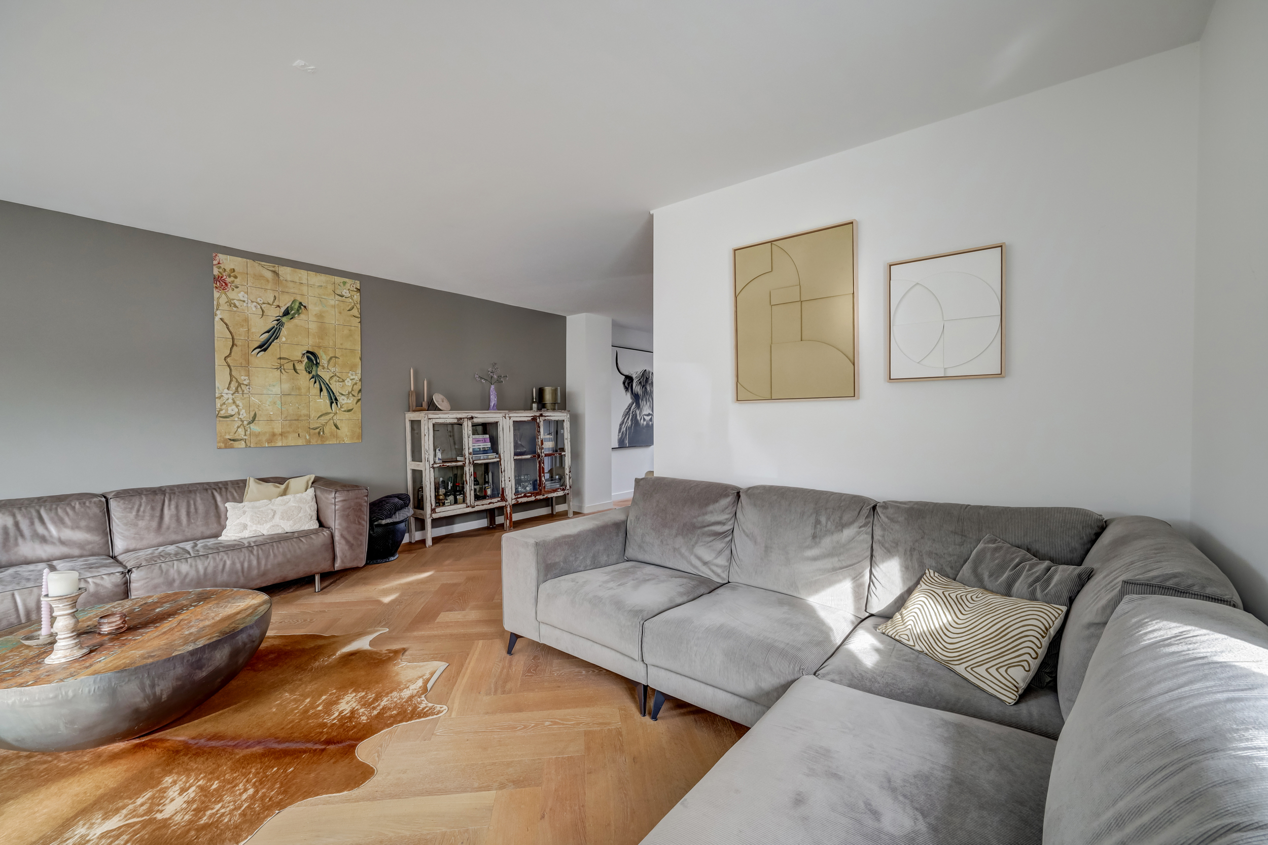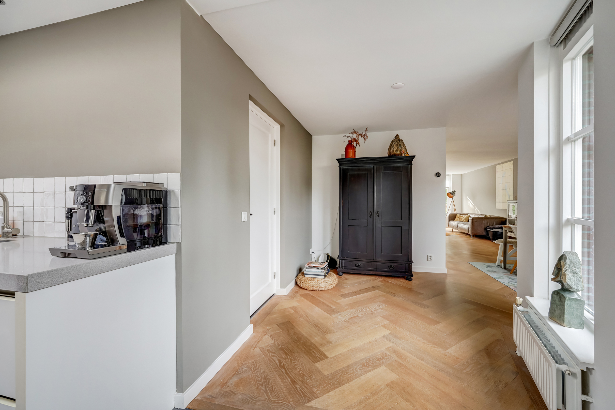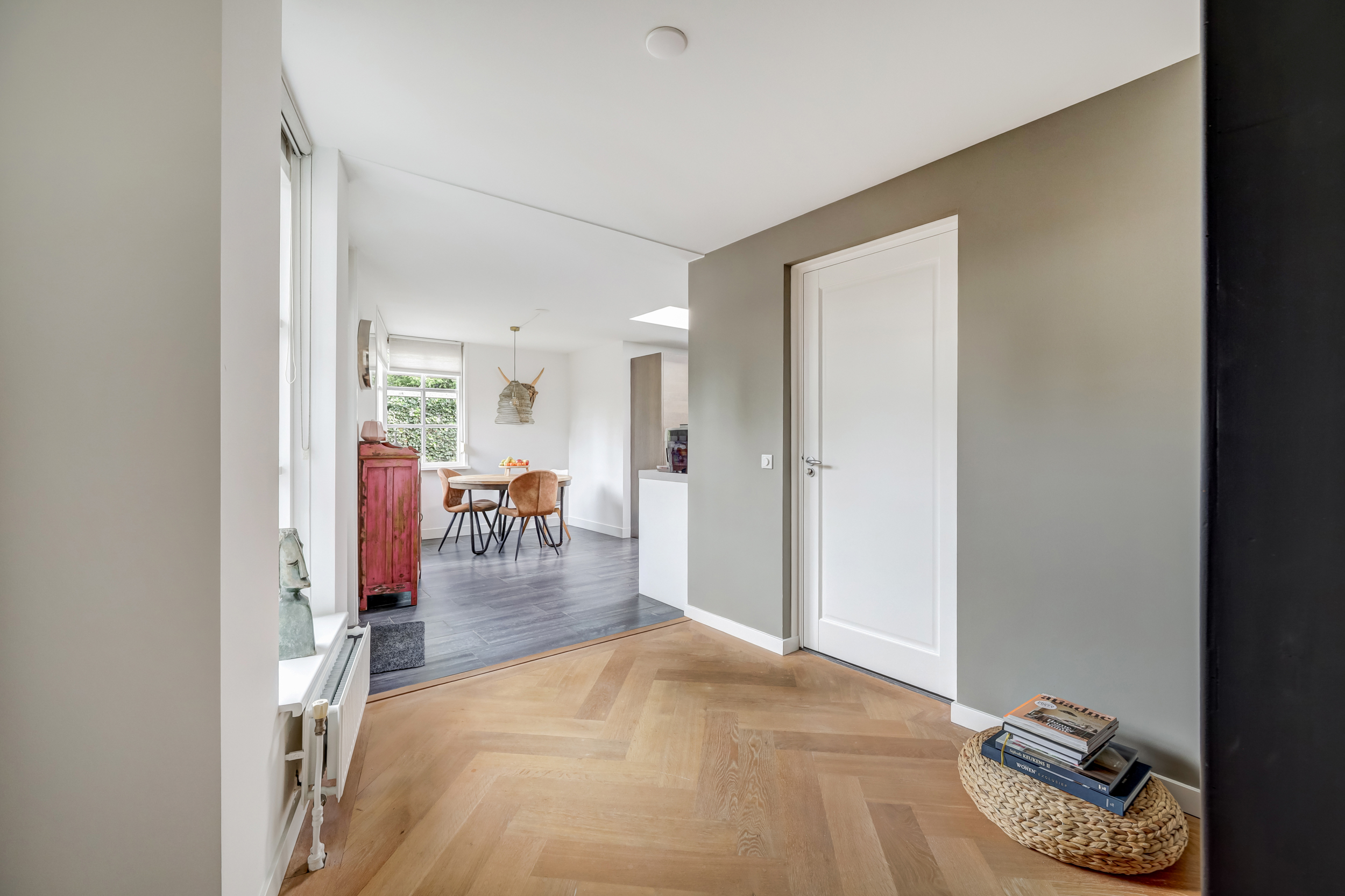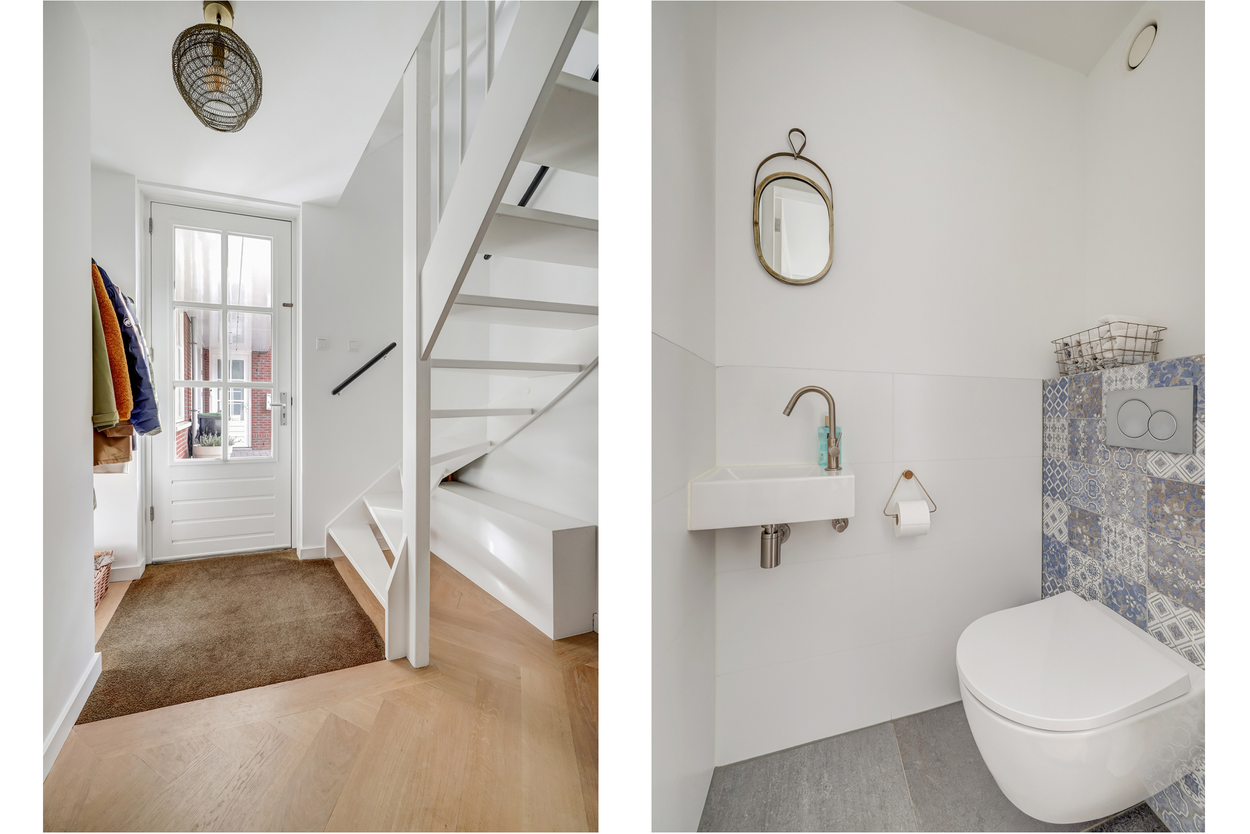 Bij binnenkomst word je direct verwelkomd in een ruime, lichte hal die de toon zet voor de rest van de woning. De visgraatvloer loopt door naar de woonkamer en geeft een elegante, moderne uitstraling. In de hal bevinden zich het toilet met fontein, de meterkast en de trap naar de eerste verdieping.