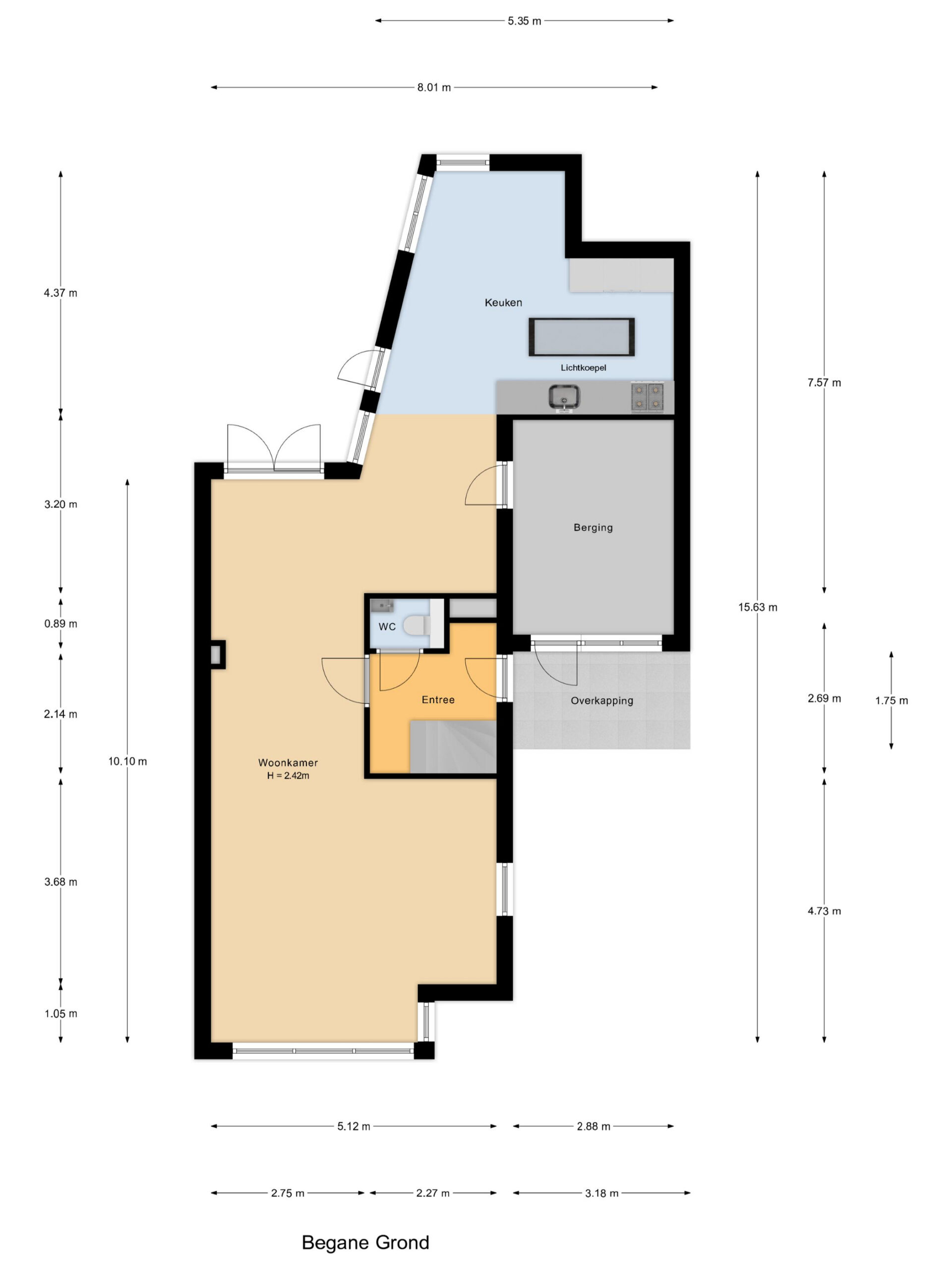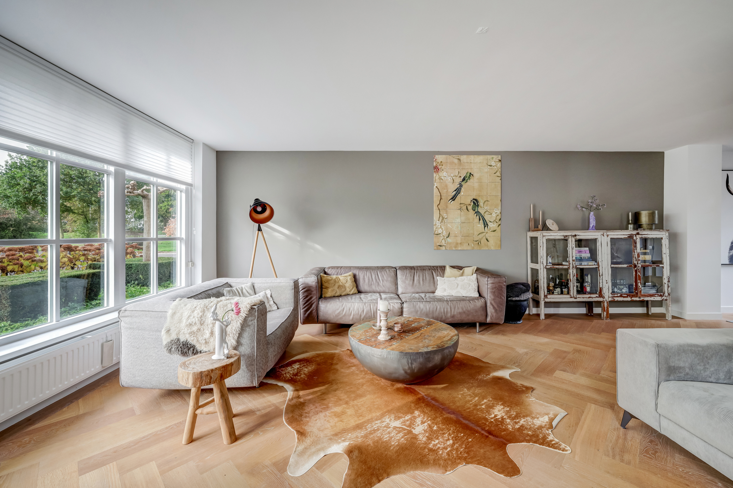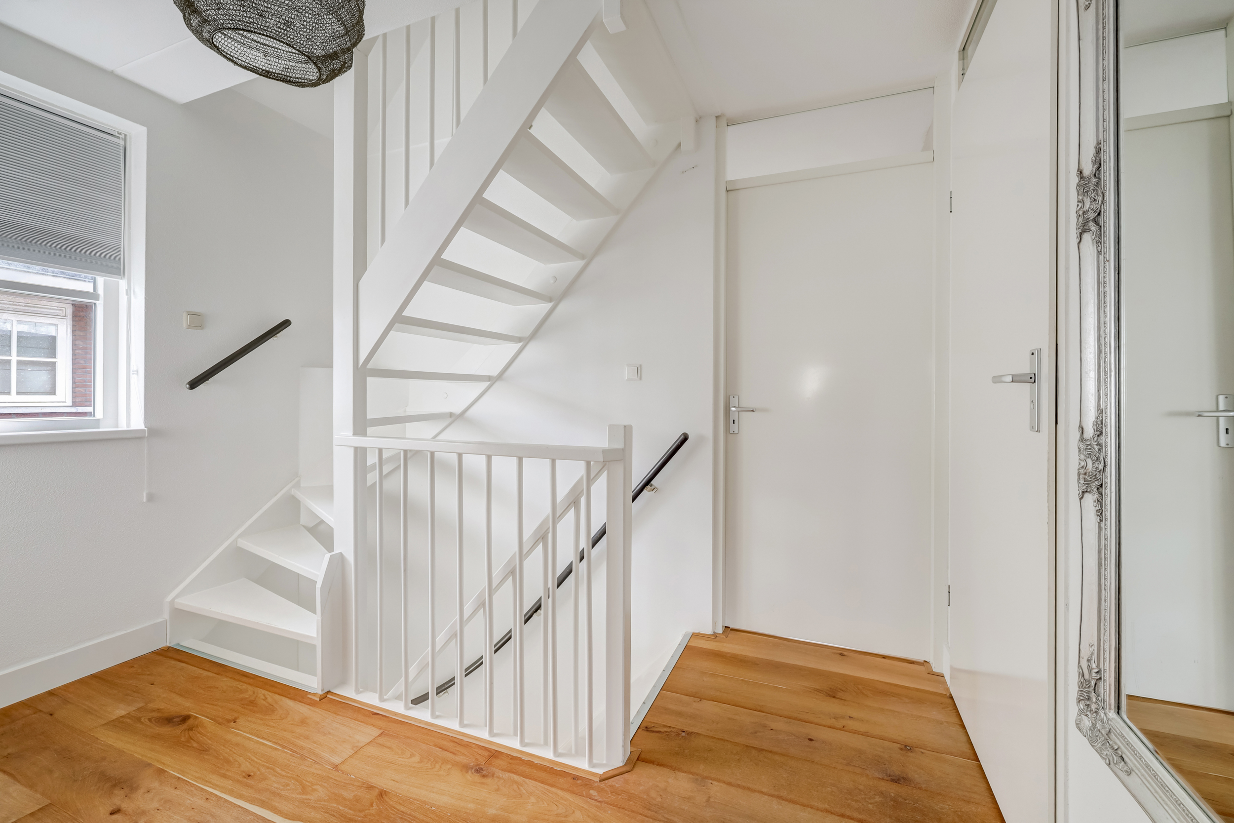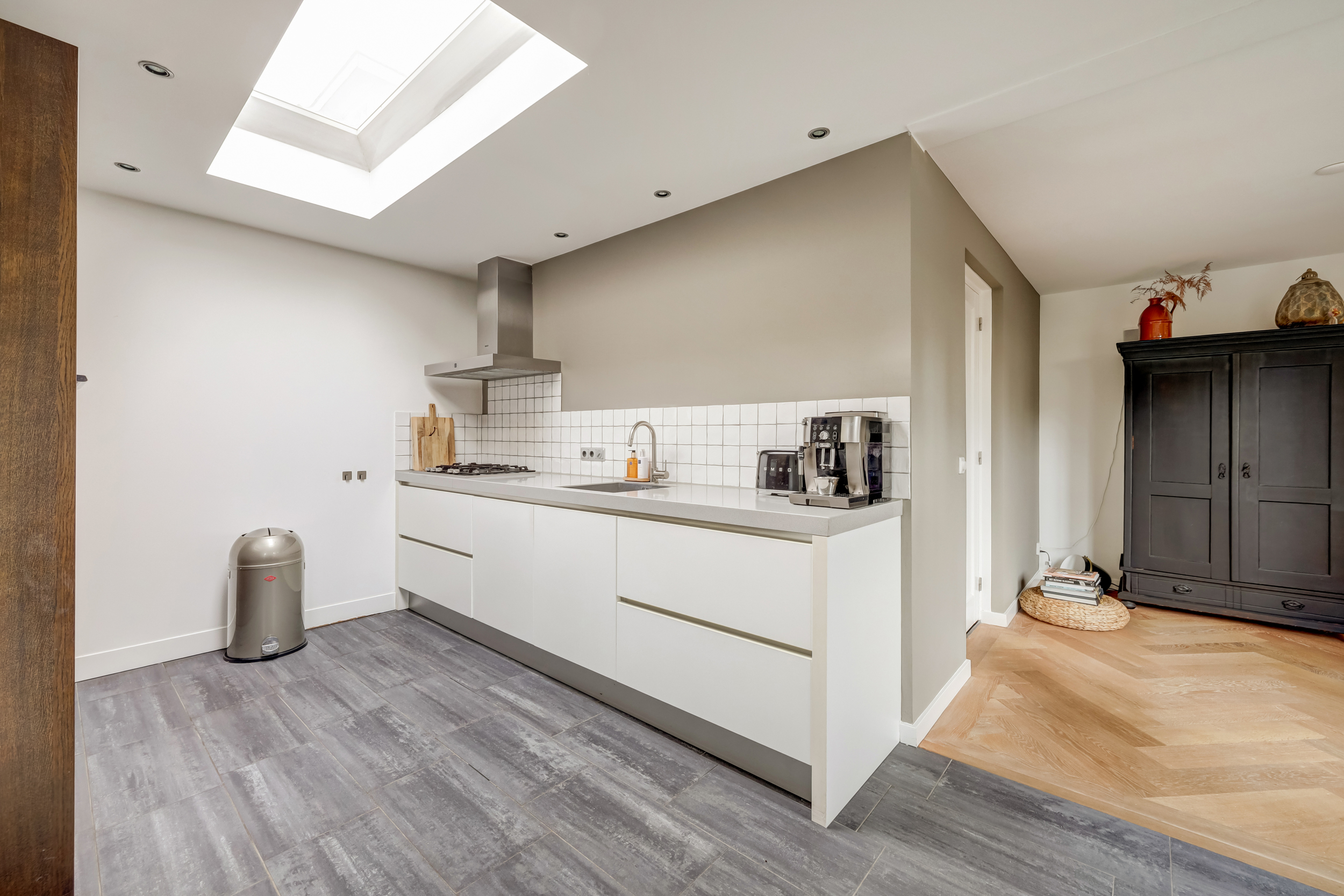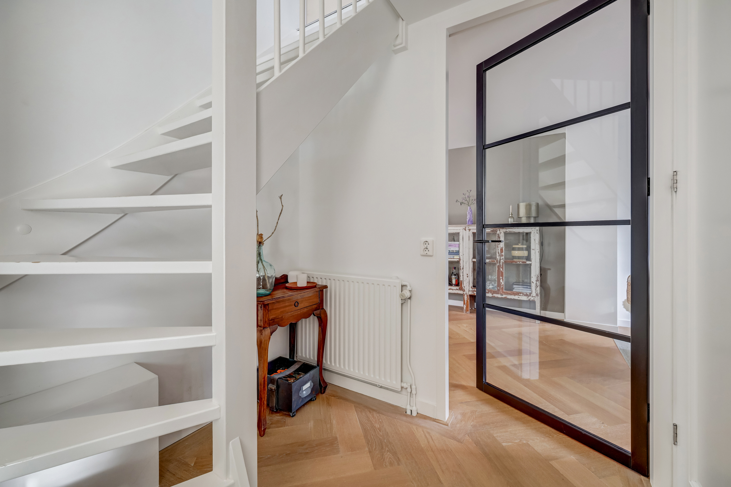 Bij binnenkomst word je direct verwelkomd in een ruime, lichte hal die de toon zet voor de rest van de woning. De visgraatvloer loopt door naar de woonkamer en geeft een elegante, moderne uitstraling. In de hal bevinden zich het toilet met fontein, de meterkast en de trap naar de eerste verdieping.