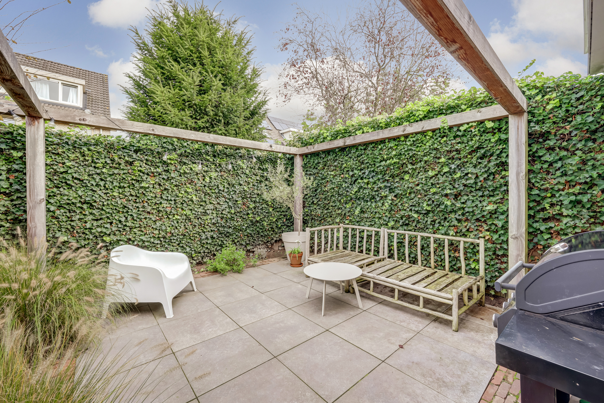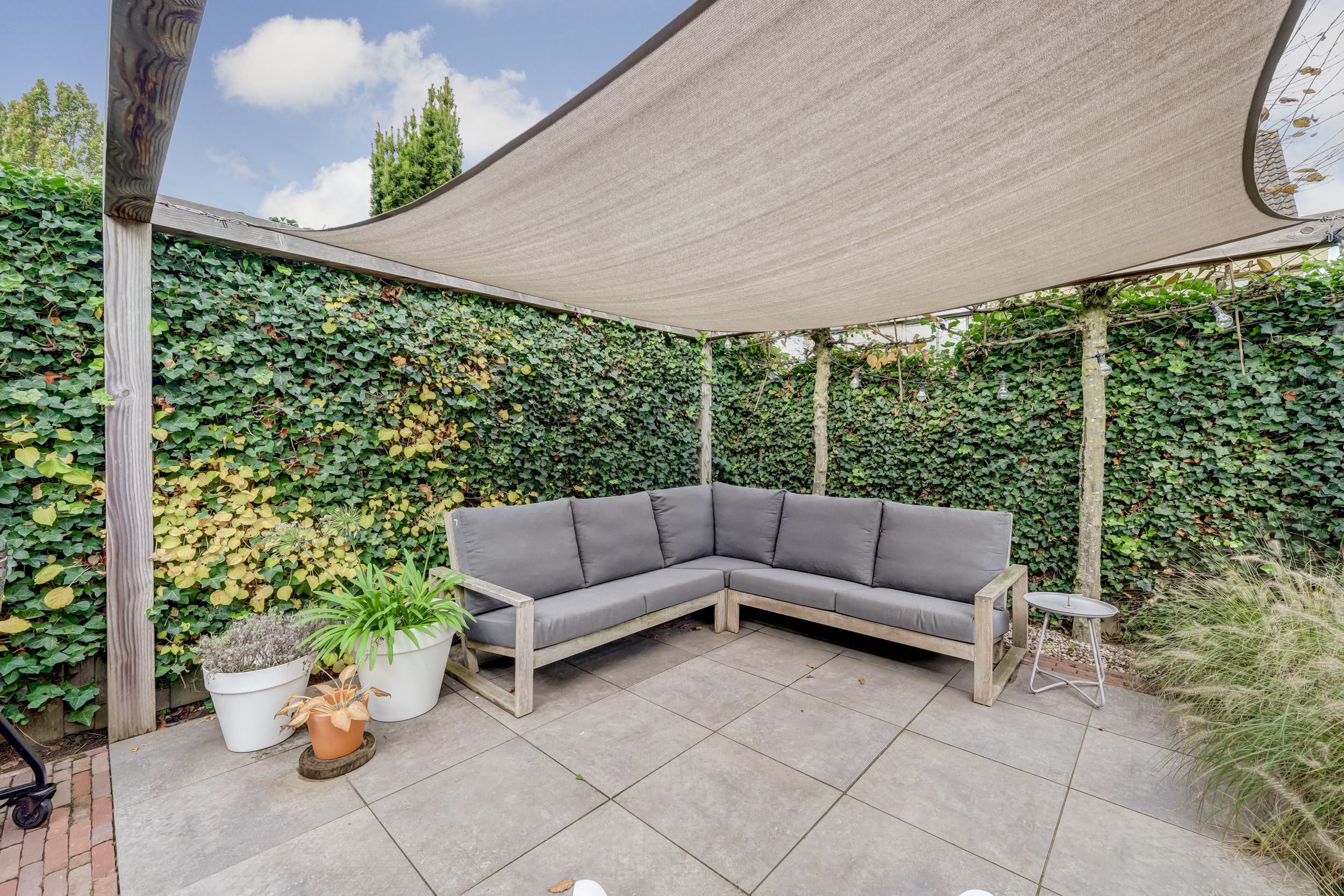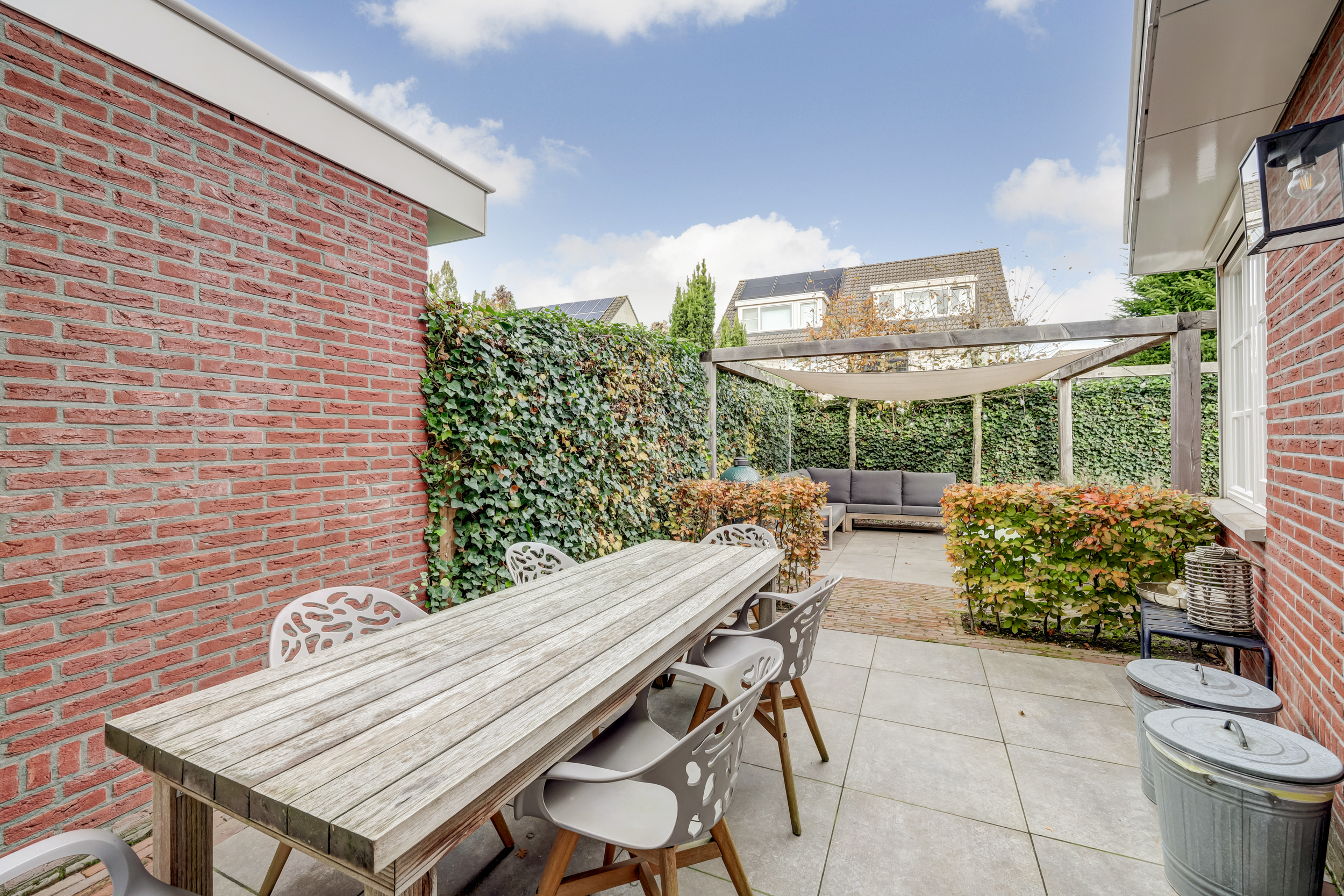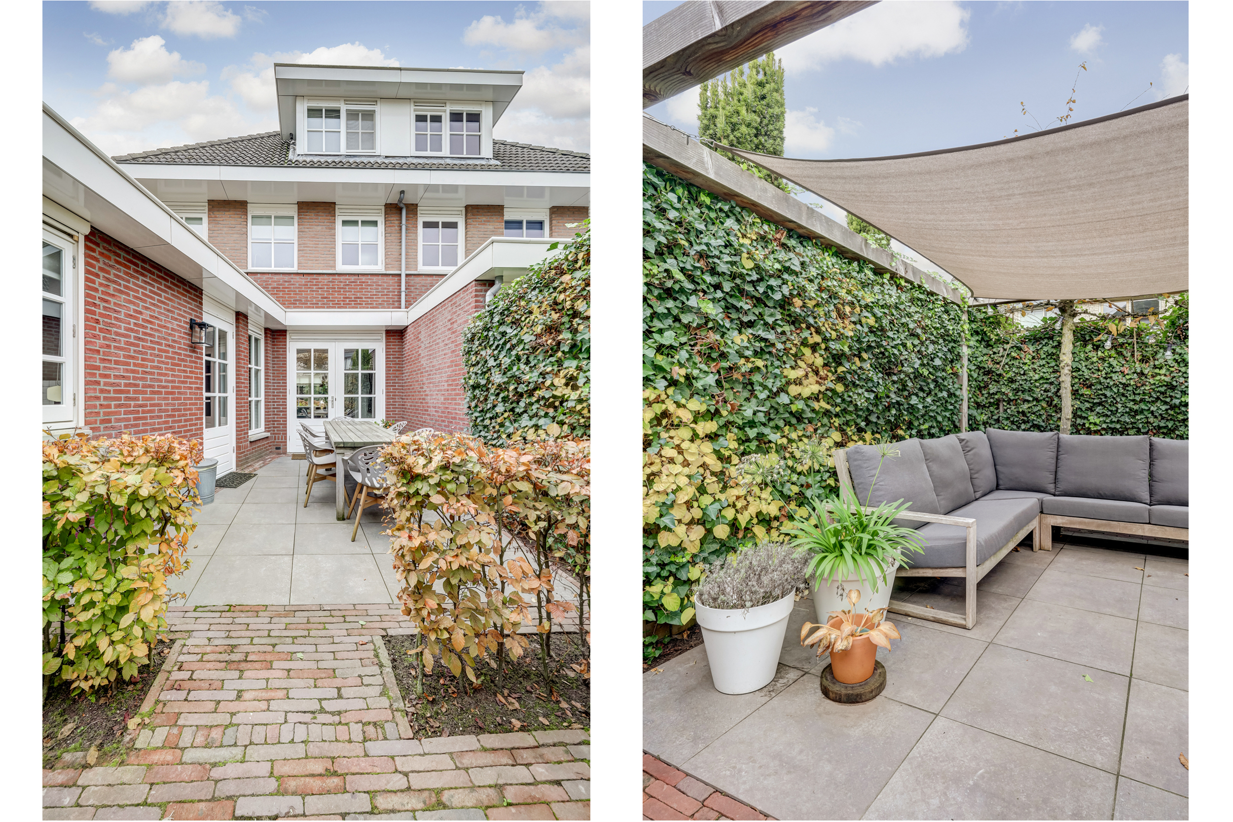 De voortuin heeft een eigen oprit met parkeerruimte voor twee auto’s. De achtertuin is netjes aangelegd en combineert meerdere terrassen met groen, waardoor het een prettige, koele plek is om te ontspannen en te genieten van het buitenleven.